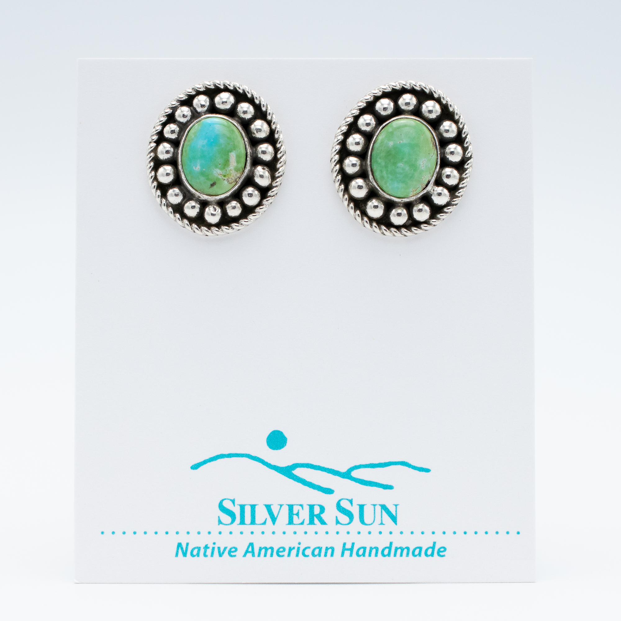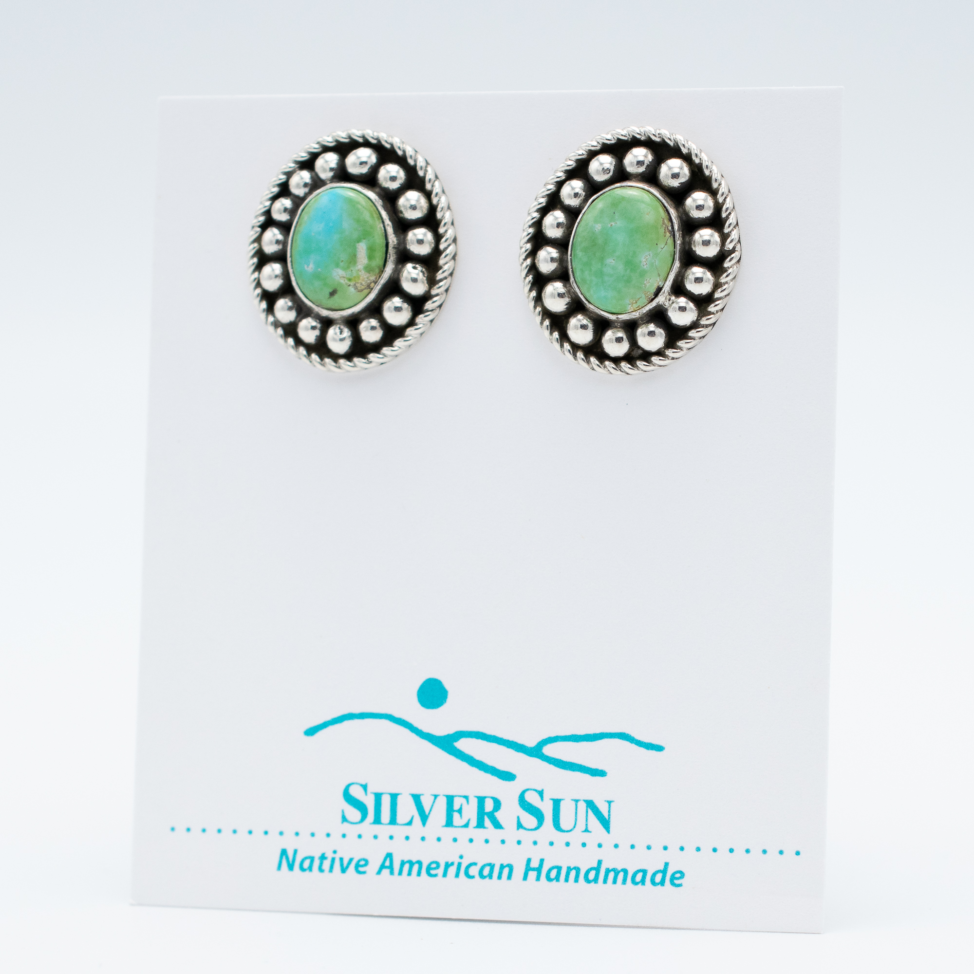 These vibrant Emerald Valley Turquoise Earrings are a radiant celebration of traditional Navajo silverwork. Set in a bold oval design, the green-blue stones are framed by oxidized sterling silver with detailed twist wire and a striking row of silver domes. The high-contrast setting brings out the natural variation and vivid color of the turquoise. Handcrafted by Navajo artist Ruth Ann Begay, these earrings offer a timeless, earthy elegance perfect for everyday wear or special occasions.