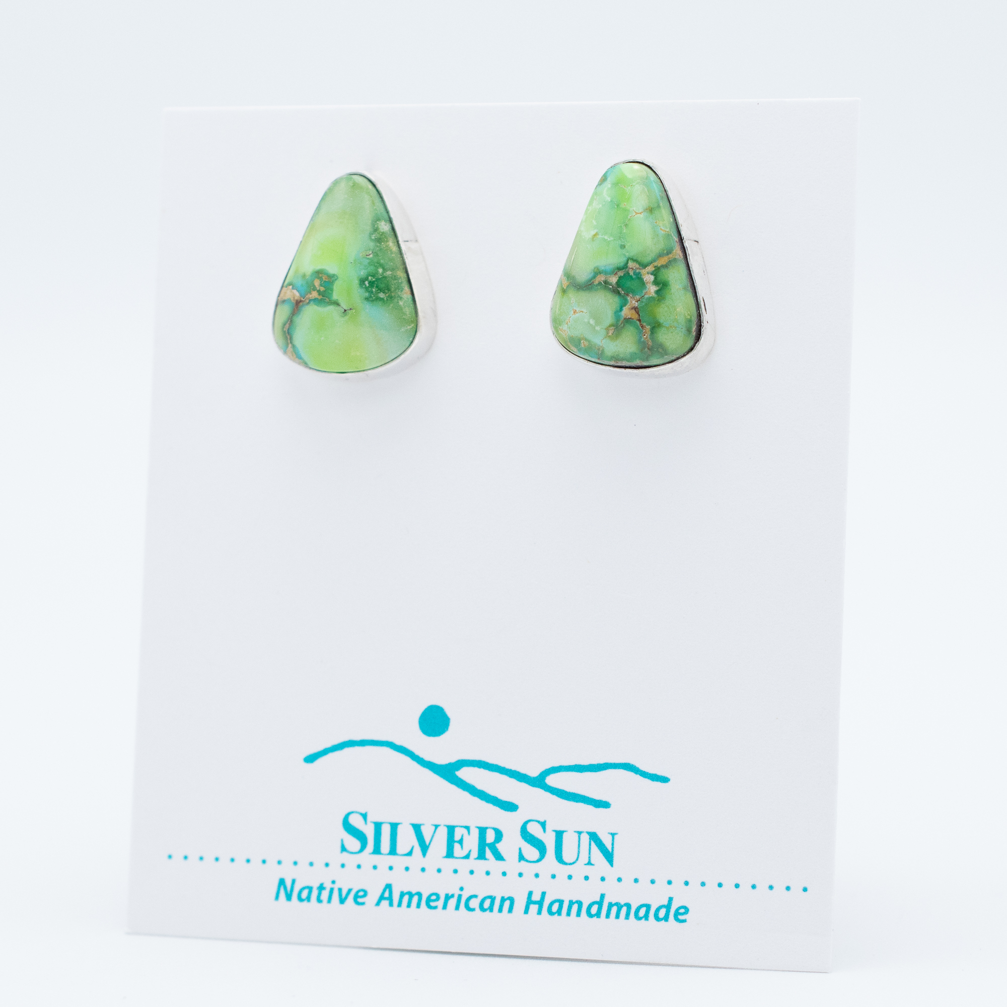 These enhanced Emerald Valley Turquoise Earrings by Navajo artist Ruth Ann Begay feature vibrant green stones with rich matrix patterns that evoke the natural beauty of the Southwest. The freeform triangular cuts are set in smooth sterling silver bezels for a clean, modern silhouette. Handcrafted with care, they bring a fresh and earthy charm to your everyday style.