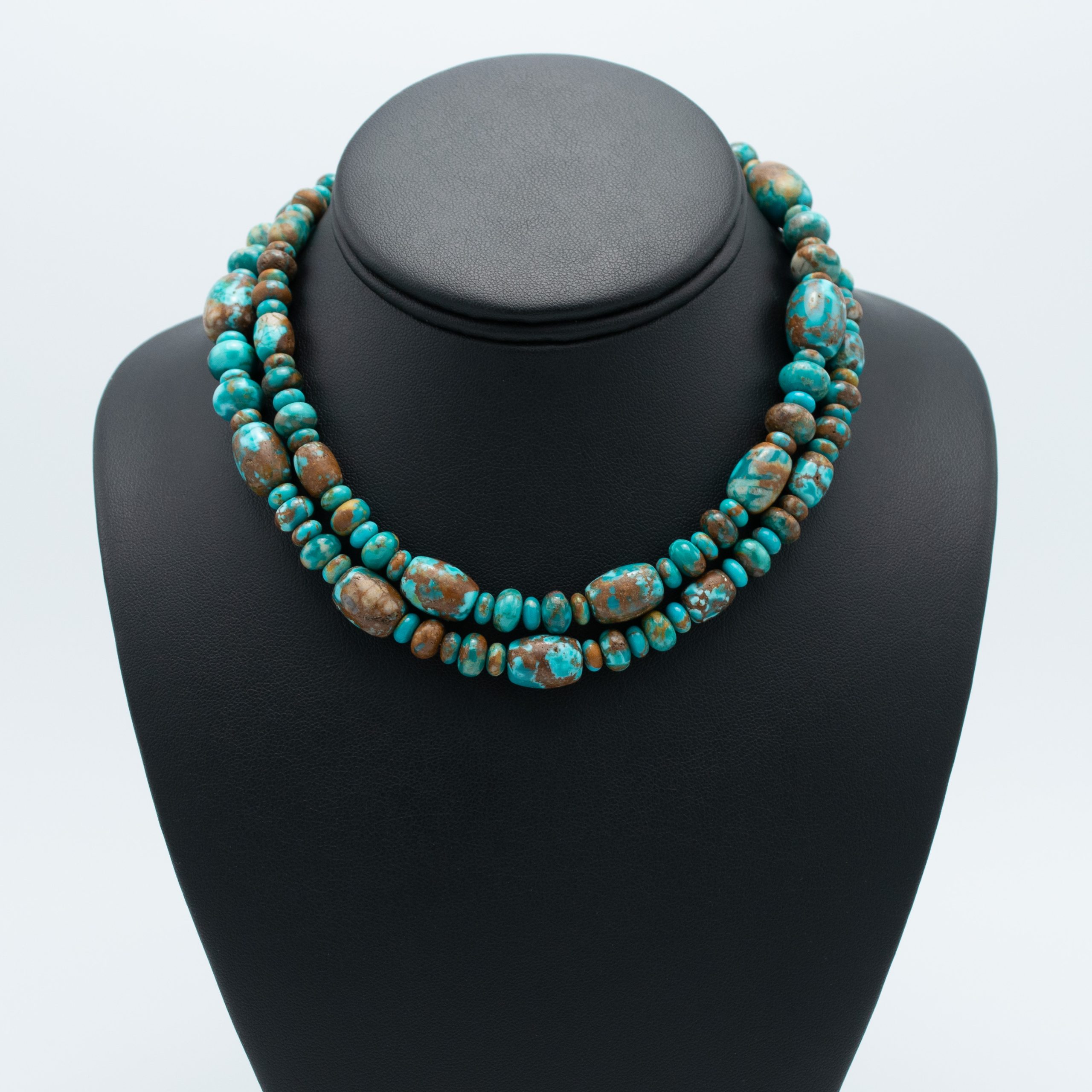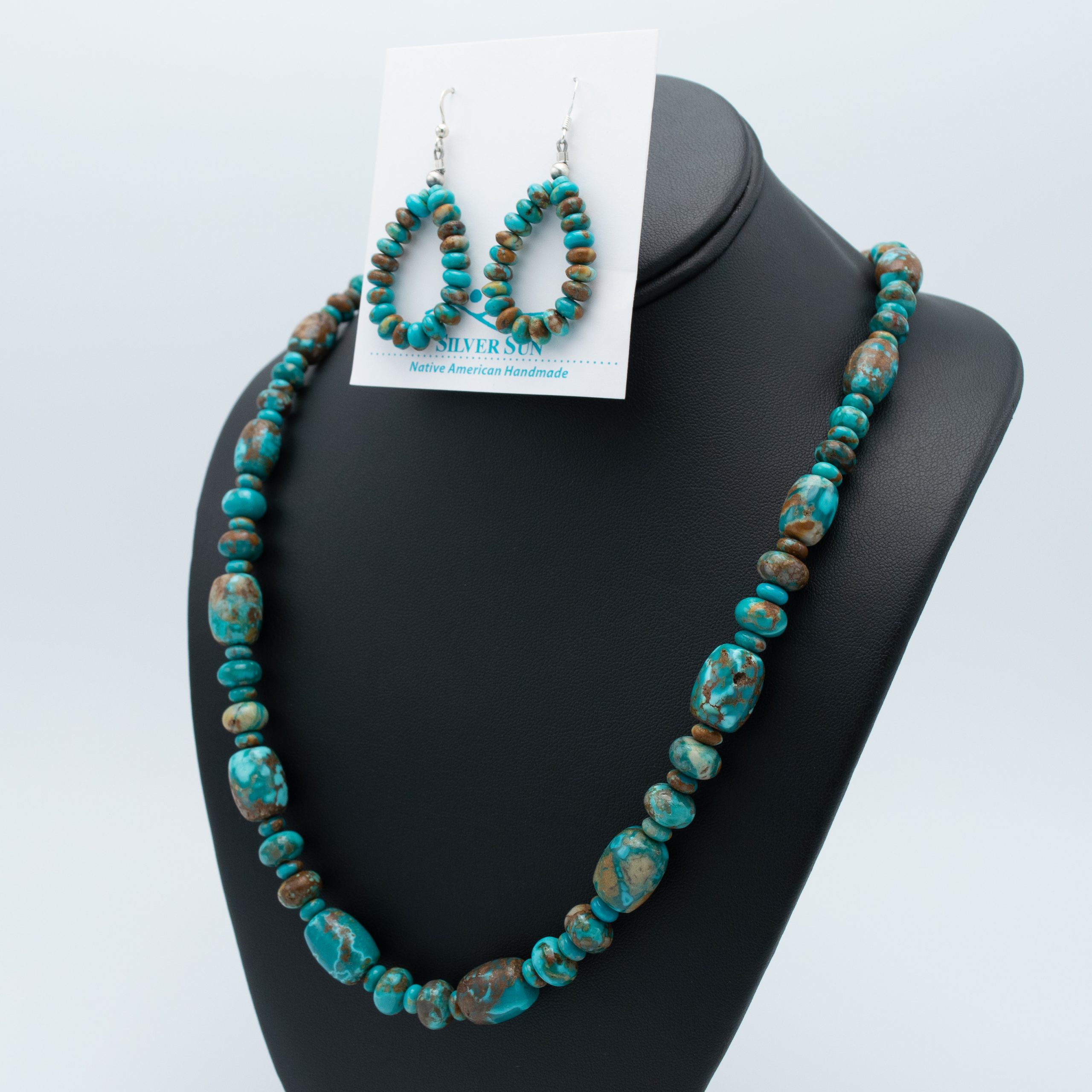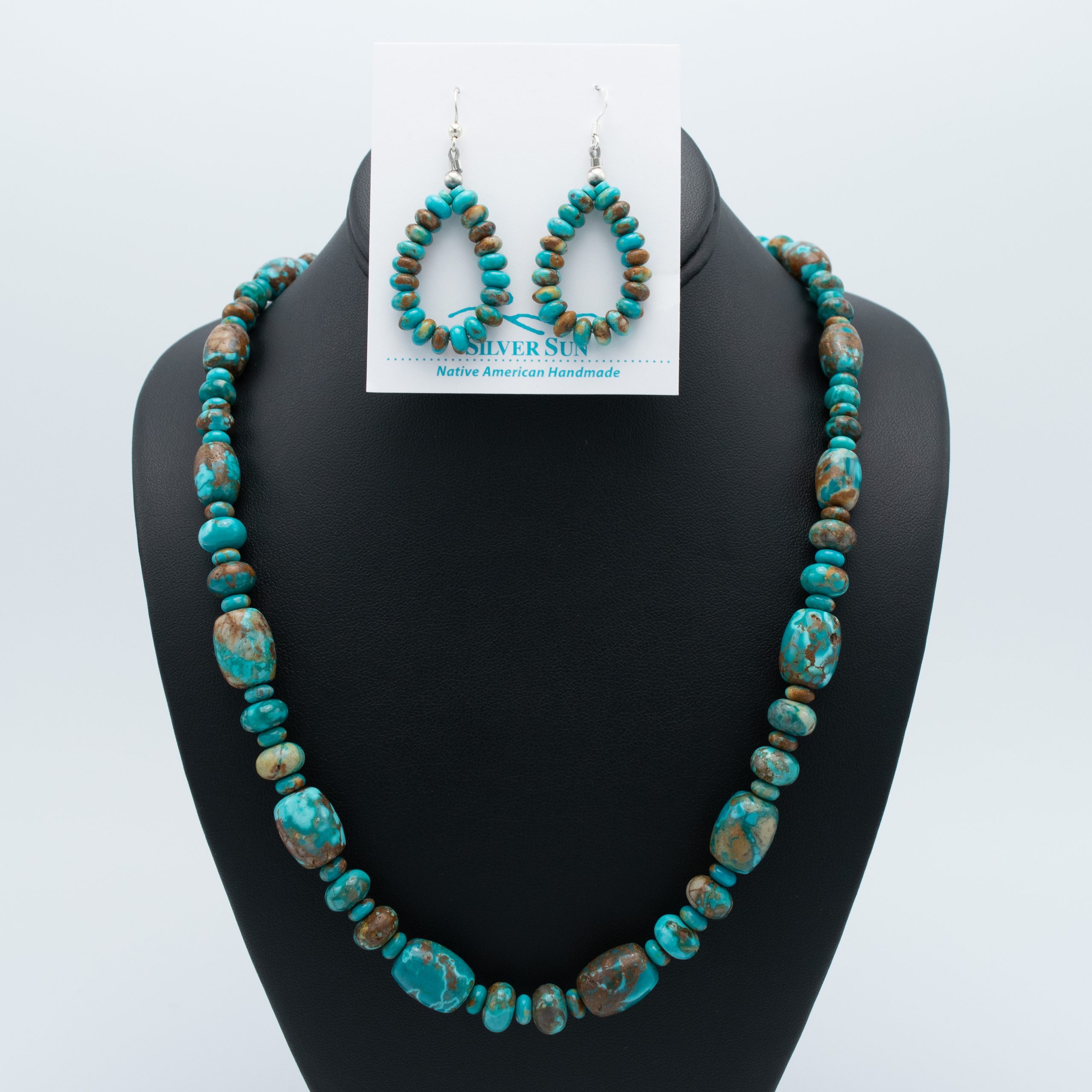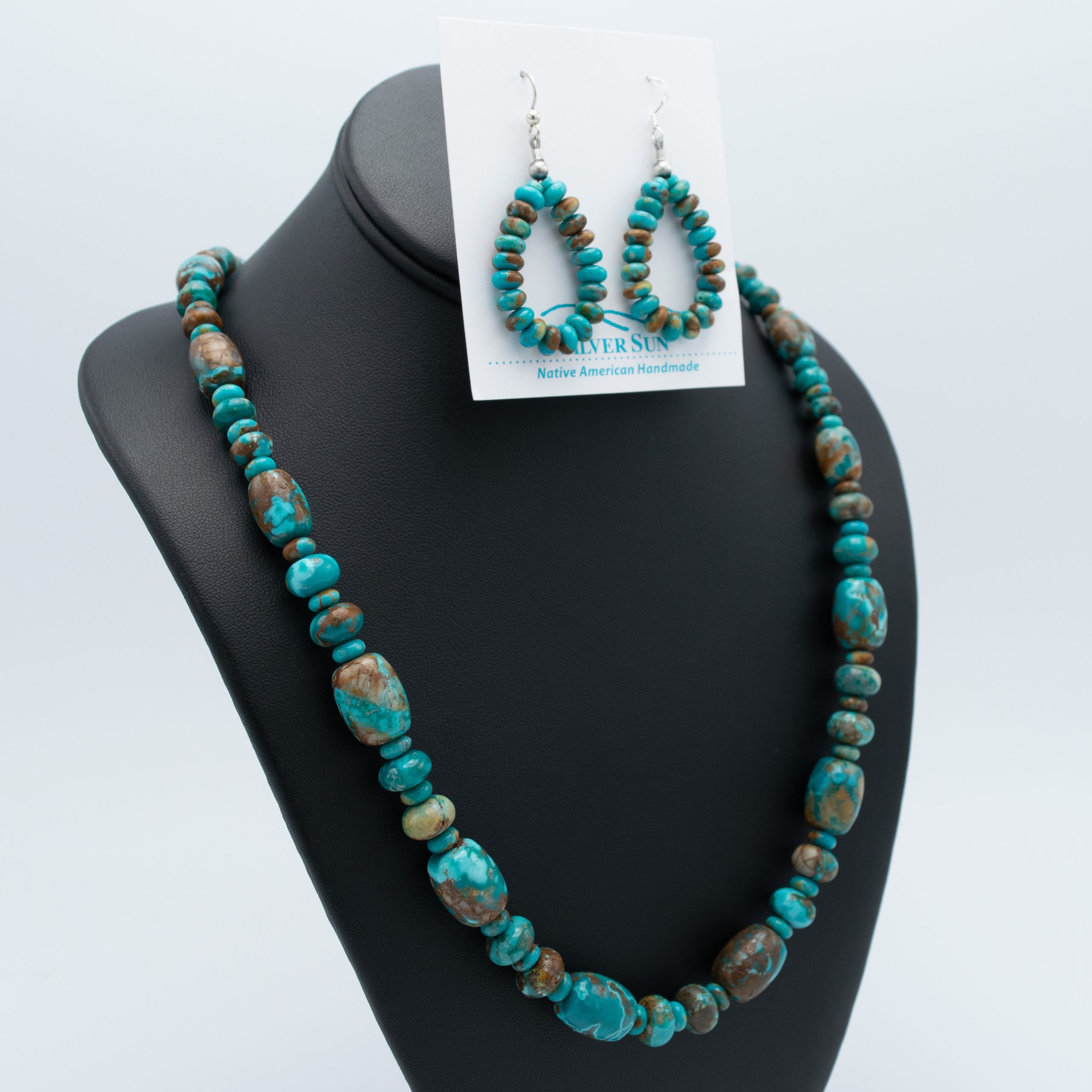 This stabilized Fox Turquoise Bead Necklace & Earring Set by San Felipe Pueblo artisan Kathleen Sanchez showcases the vibrant green and blue hues of Fox turquoise. The 31-inch necklace features an array of beads that range in size, offering a captivating blend of color and texture. The matching earrings complement the necklace perfectly, with smaller beads adding a delicate touch. Handcrafted with care, this set embodies Sanchez’s skillful artistry and brings a harmonious balance of elegance and earthiness to any ensemble.