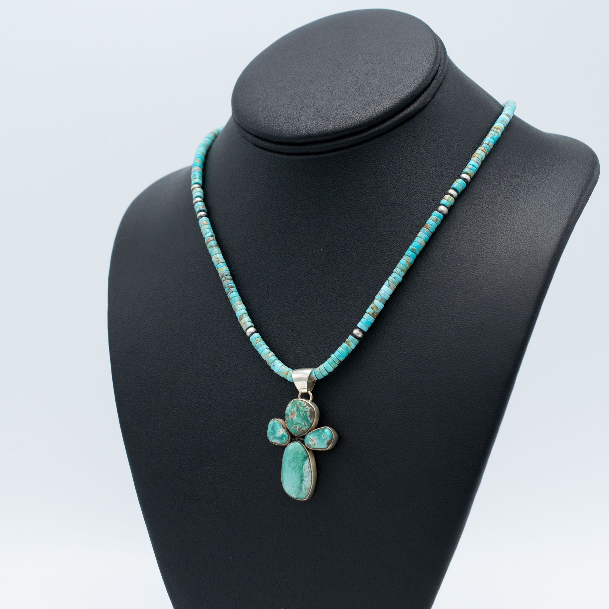 This playful necklace features a charming “hugs” pendant handcrafted by Navajo artist Bryant Martinez, showcasing natural Fox turquoise in soft green tones with earthy matrix. The pendant hangs on a strand of stabilized Kingman turquoise heishi beads, adding texture and color that perfectly complement the piece. A heartfelt design with personality—easy to wear, easy to love.