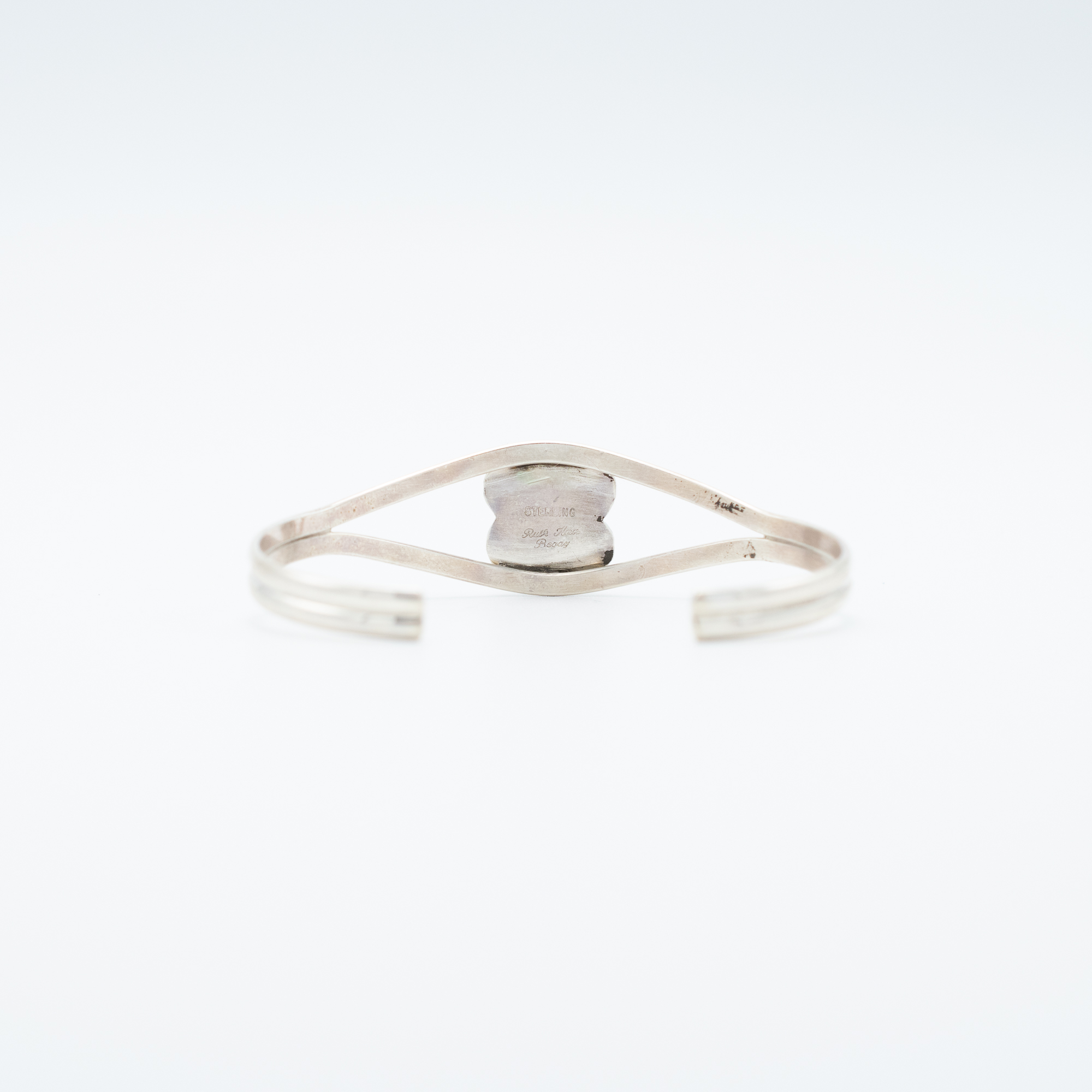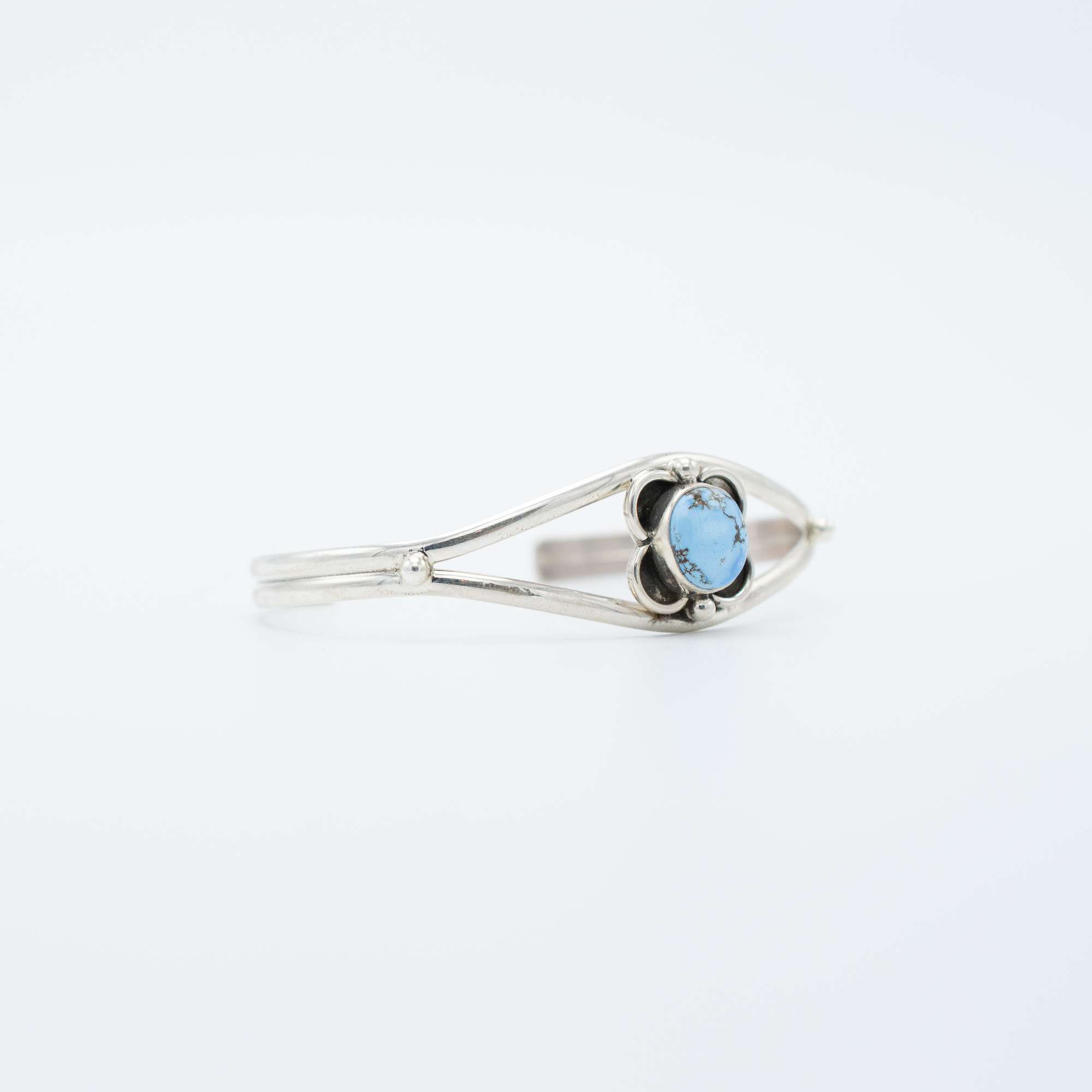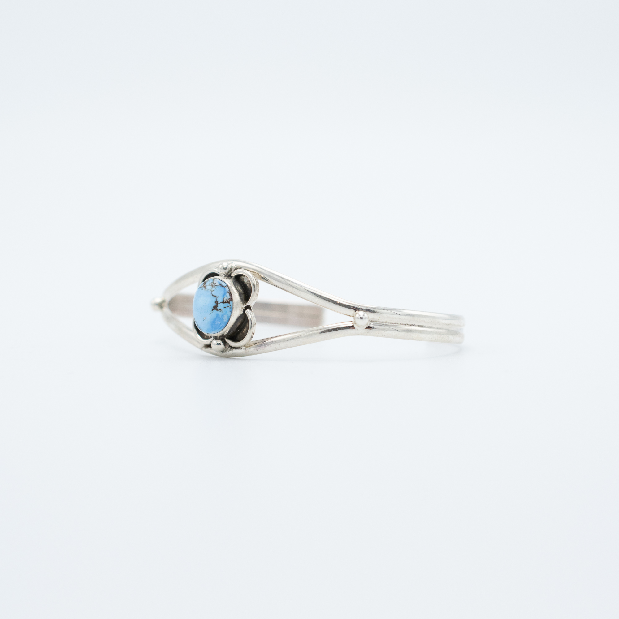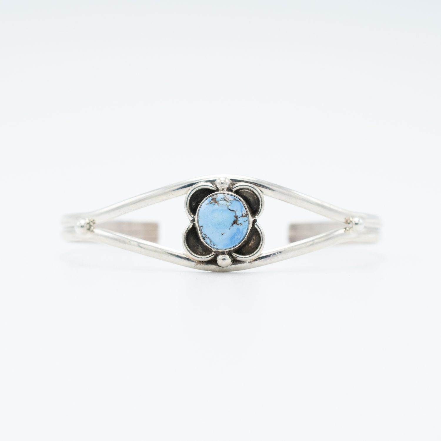 Handcrafted by Navajo artist Ruth Ann Begay, this Golden Hill Turquoise Butterfly Bracelet is a delicate yet striking piece. The vibrant Golden Hill turquoise, known for its soft blue hues and intricate matrix, is set in sterling silver, framed by a subtle butterfly-inspired design. The open, lightweight structure of the cuff adds an airy elegance, making it a perfect piece for both everyday wear and special occasions.