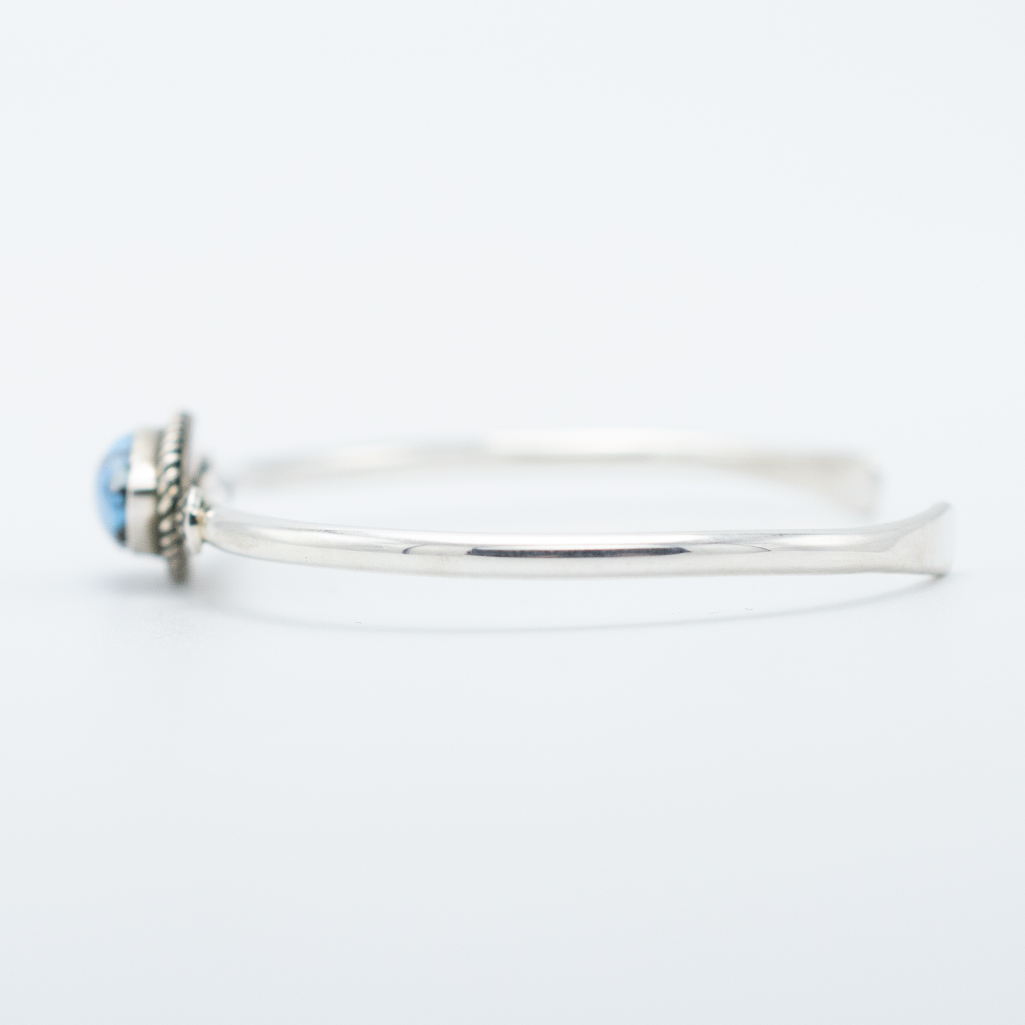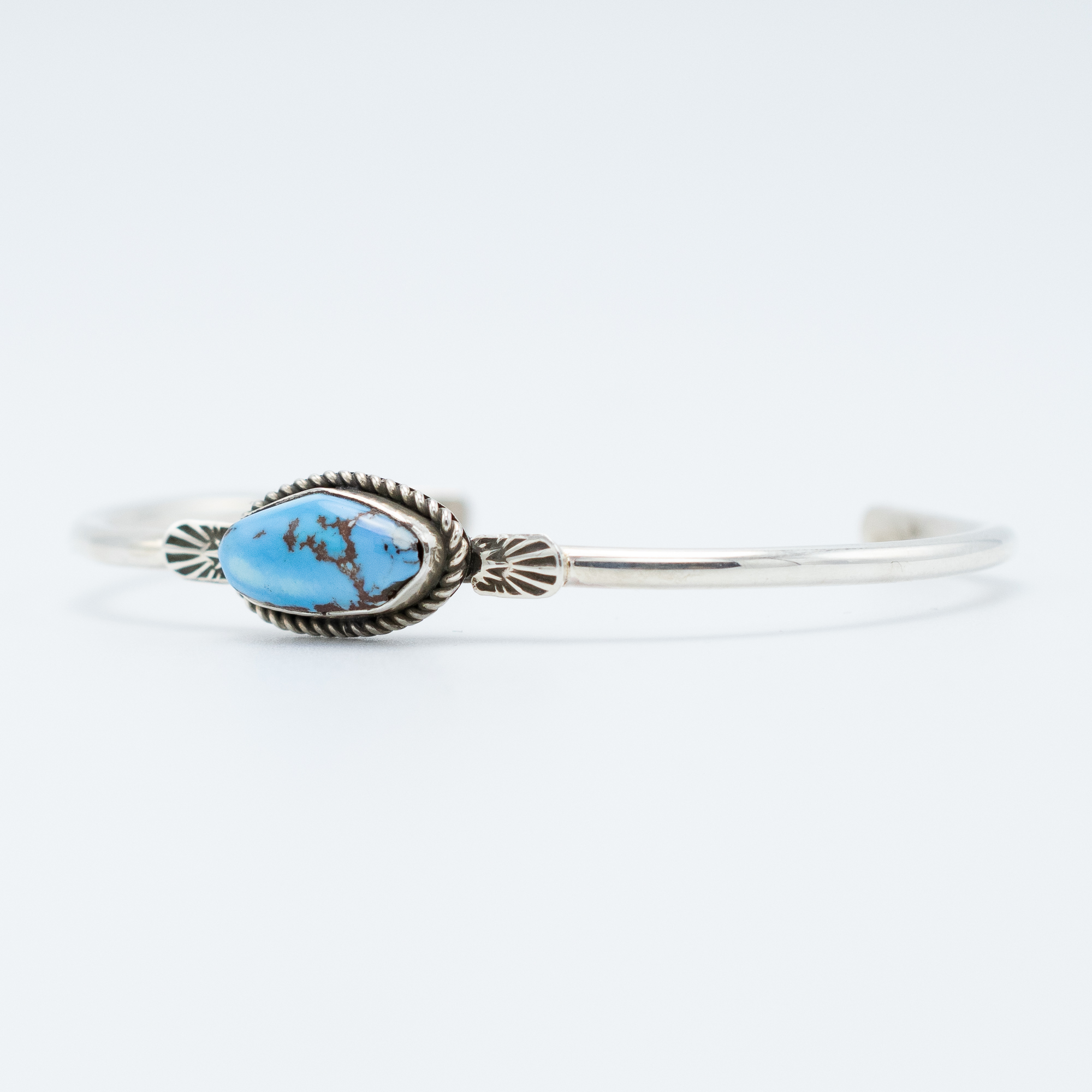 Bryant Martinez set natural Golden Hill turquoise into this bracelet, a stone from Kazakhstan that’s carved out a real following among collectors. Golden Hill tends toward a clear, vivid blue with minimal matrix, direct and striking. His silverwork gives it exactly the setting it needs.
