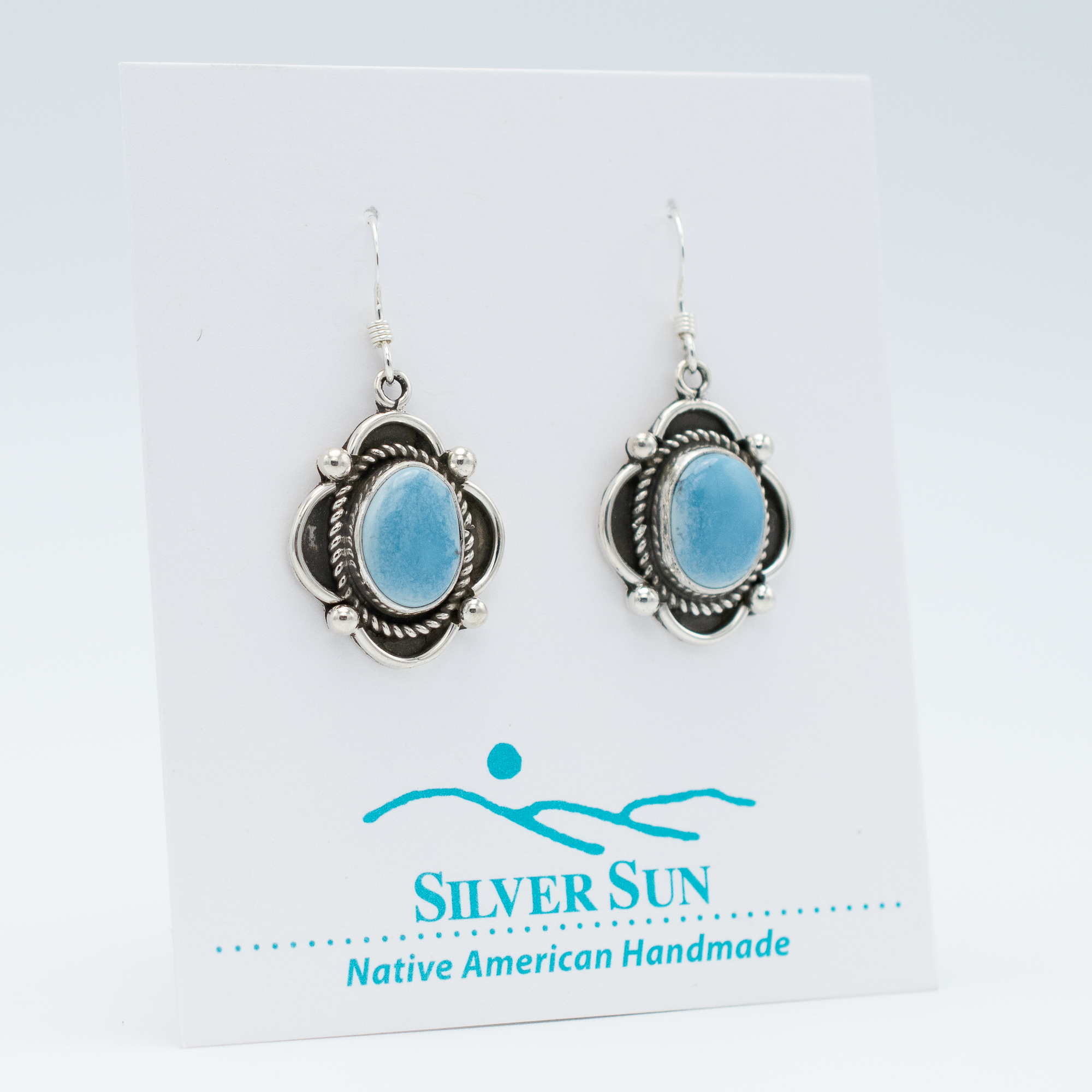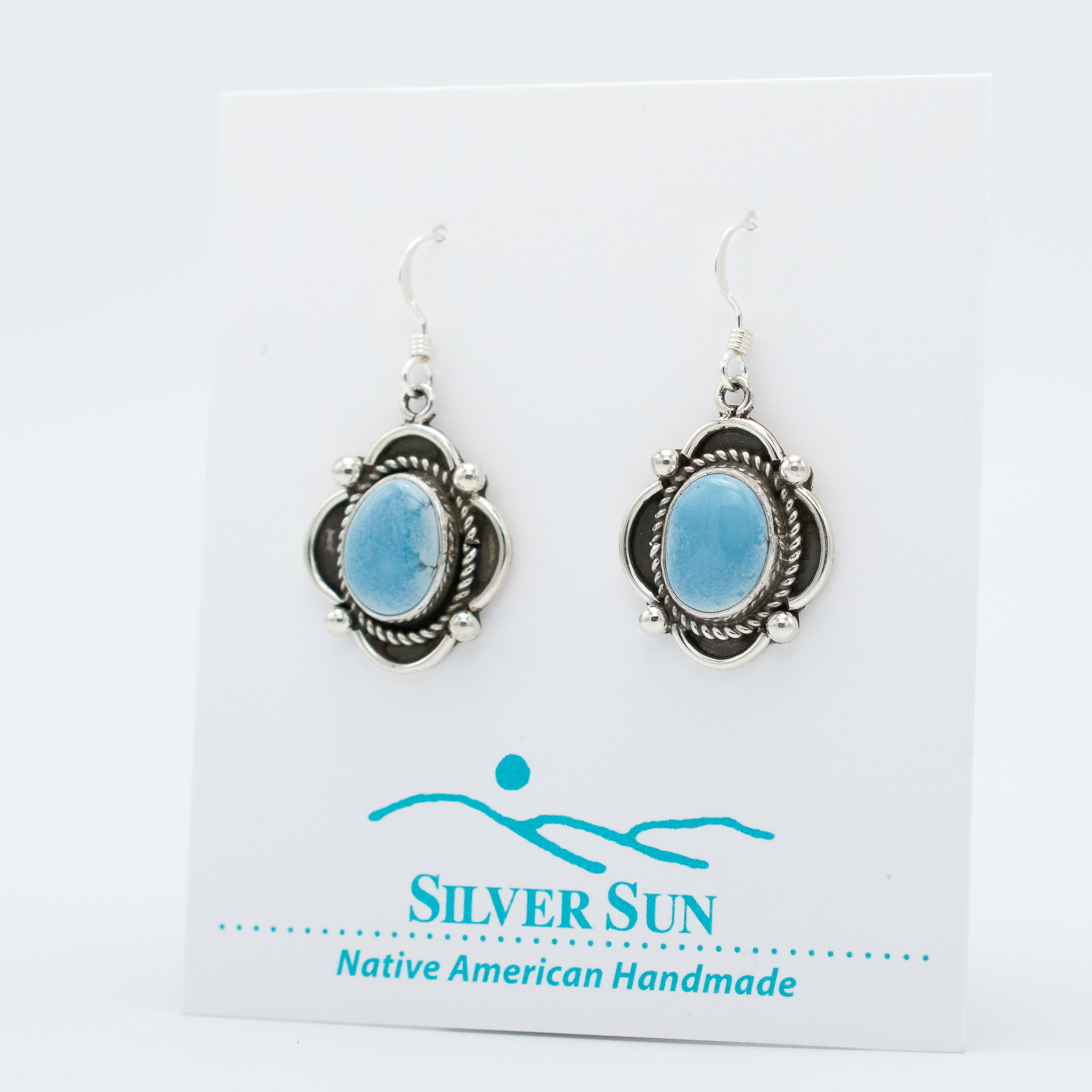 These Golden Hill Turquoise Earrings by Navajo artist Ruth Ann Begay combine timeless elegance with natural beauty. Set in sterling silver, the soft sky-blue stones are framed by twisted wire and bordered with a graceful scalloped edge. Silver beads accent each corner, adding dimension and a classic Southwestern touch. Handcrafted with care, these earrings are a radiant way to showcase the rare allure of Golden Hill turquoise.