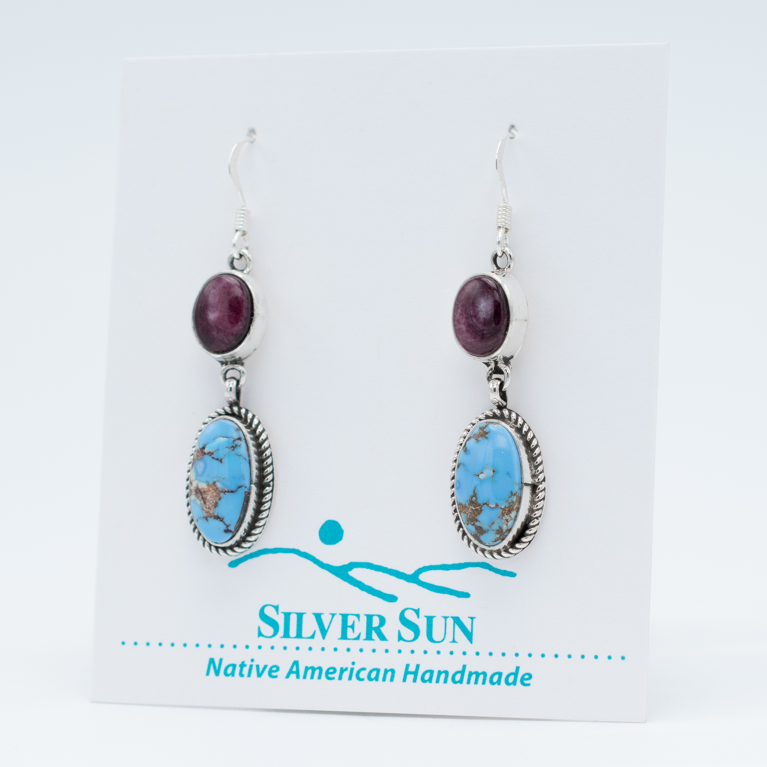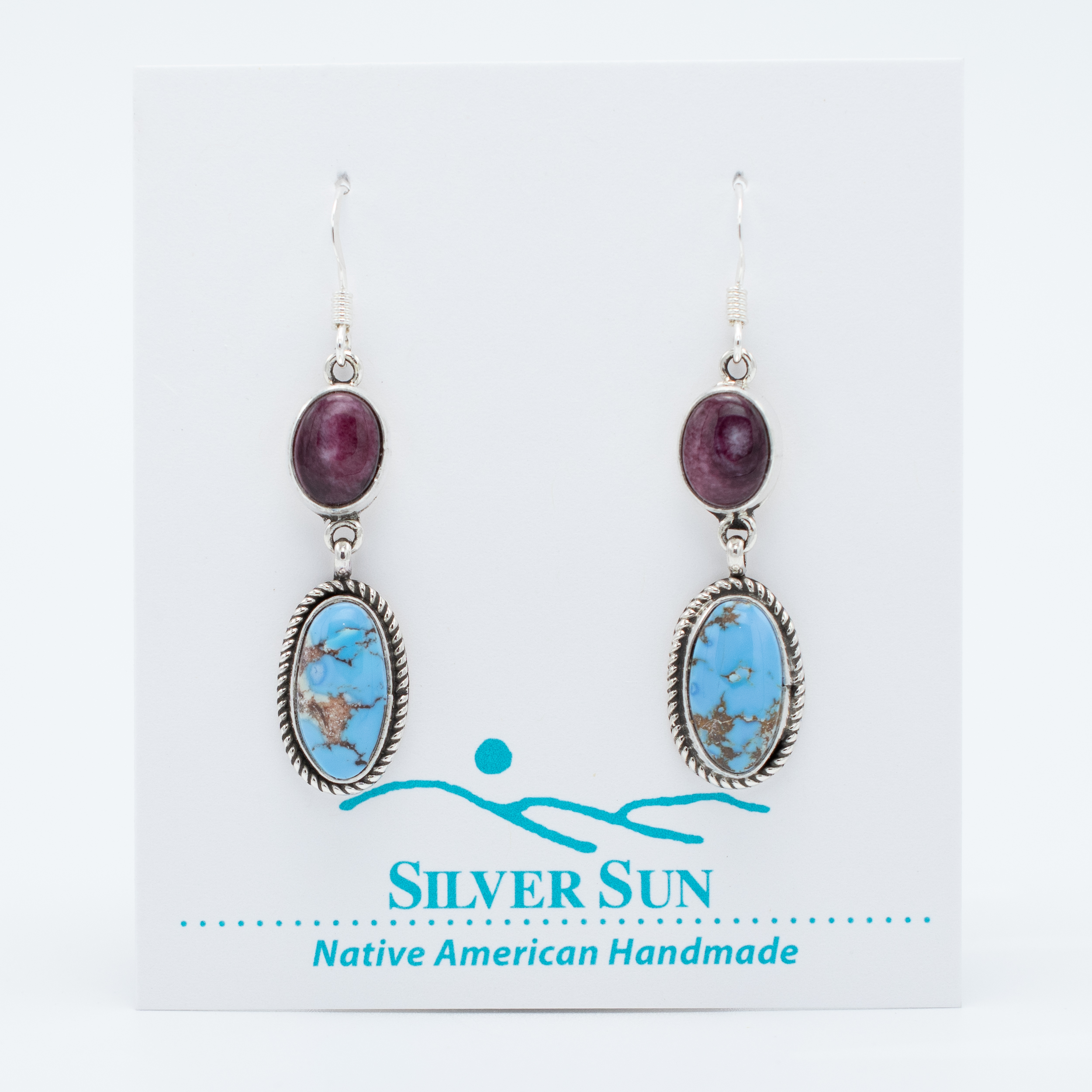 Ruth Ann Begay’s earrings are a stunning display of color and texture. Featuring golden hill turquoise and purple spiny oyster, they’re a vibrant addition to any jewelry collection.