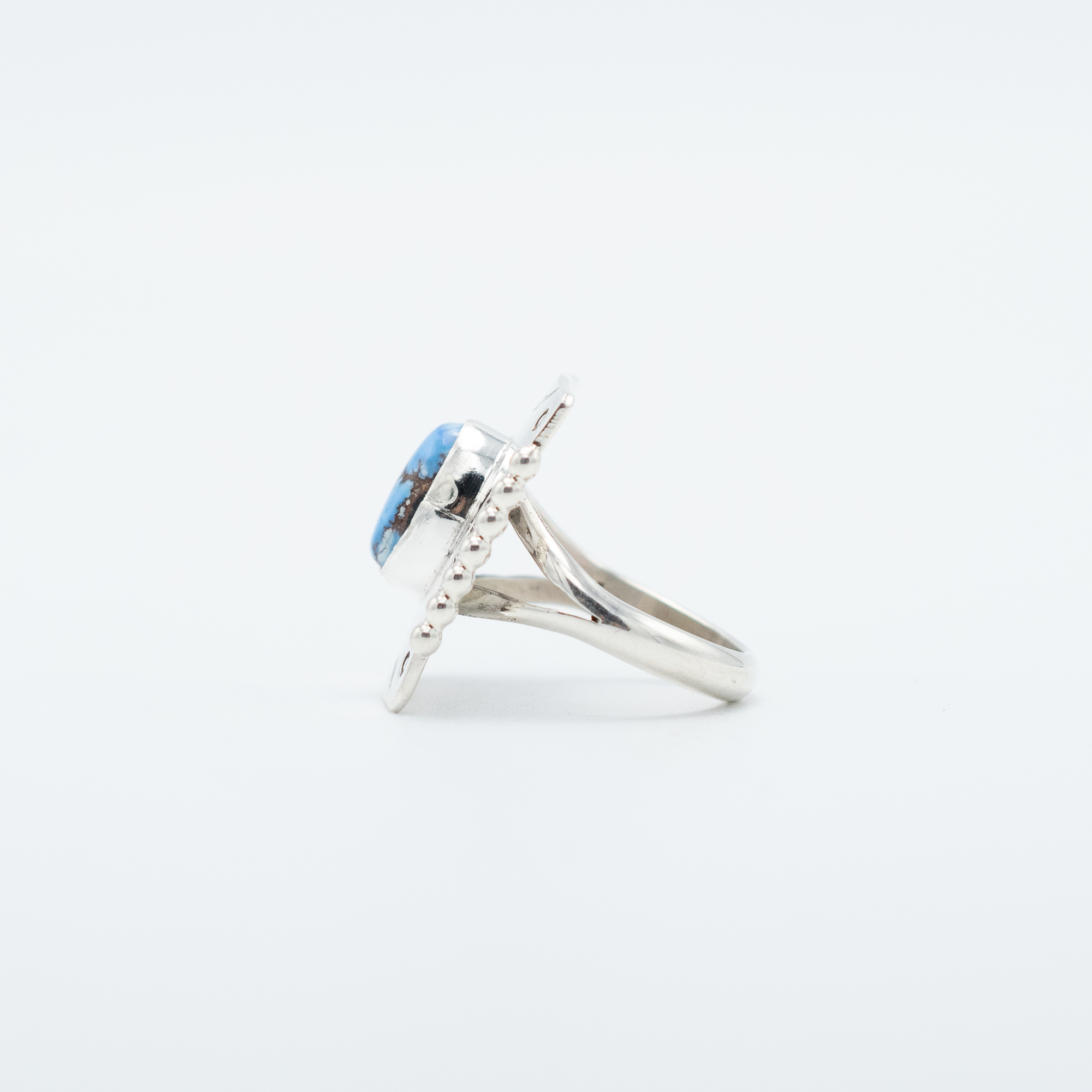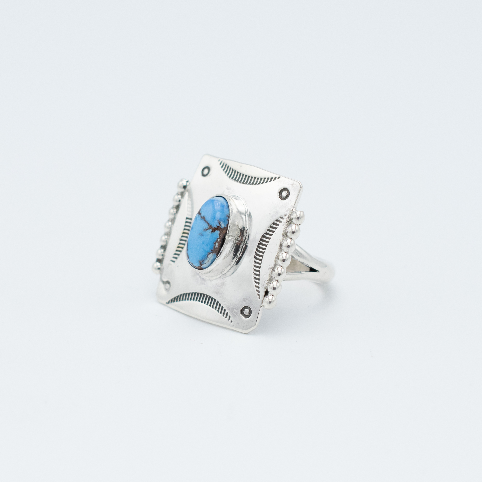 This bold Golden Hill Turquoise Shield Ring by Navajo artist Ruth Ann Begay showcases a striking pale blue stone set against a wide sterling silver band. Delicate hand stamping and rows of silver beadwork frame the center stone, giving the piece a strong yet refined presence. A statement ring that radiates strength, beauty, and tradition.