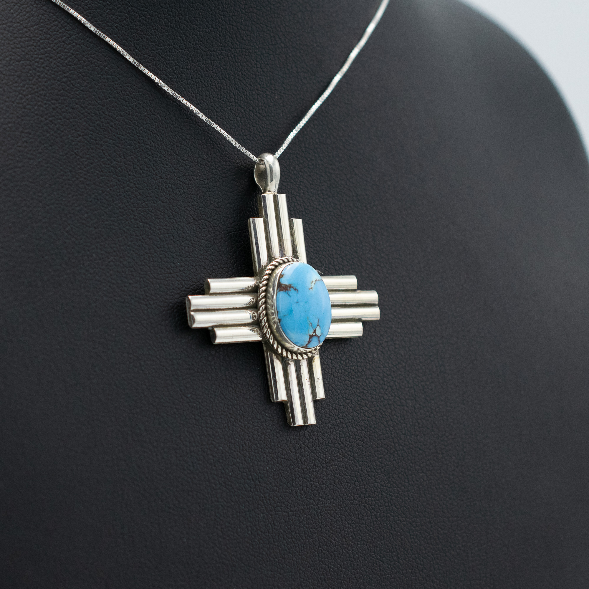 This handcrafted pendant by Navajo artist Bryant Martinez features natural Golden Hill Turquoise set in a radiant sterling silver Zia design. The vivid blue stone, known for its soft lavender undertones and delicate matrix, is framed in a rope bezel at the heart of the cross-like symbol. A meaningful tribute to New Mexico and Native craftsmanship, this piece embodies balance, heritage, and harmony.