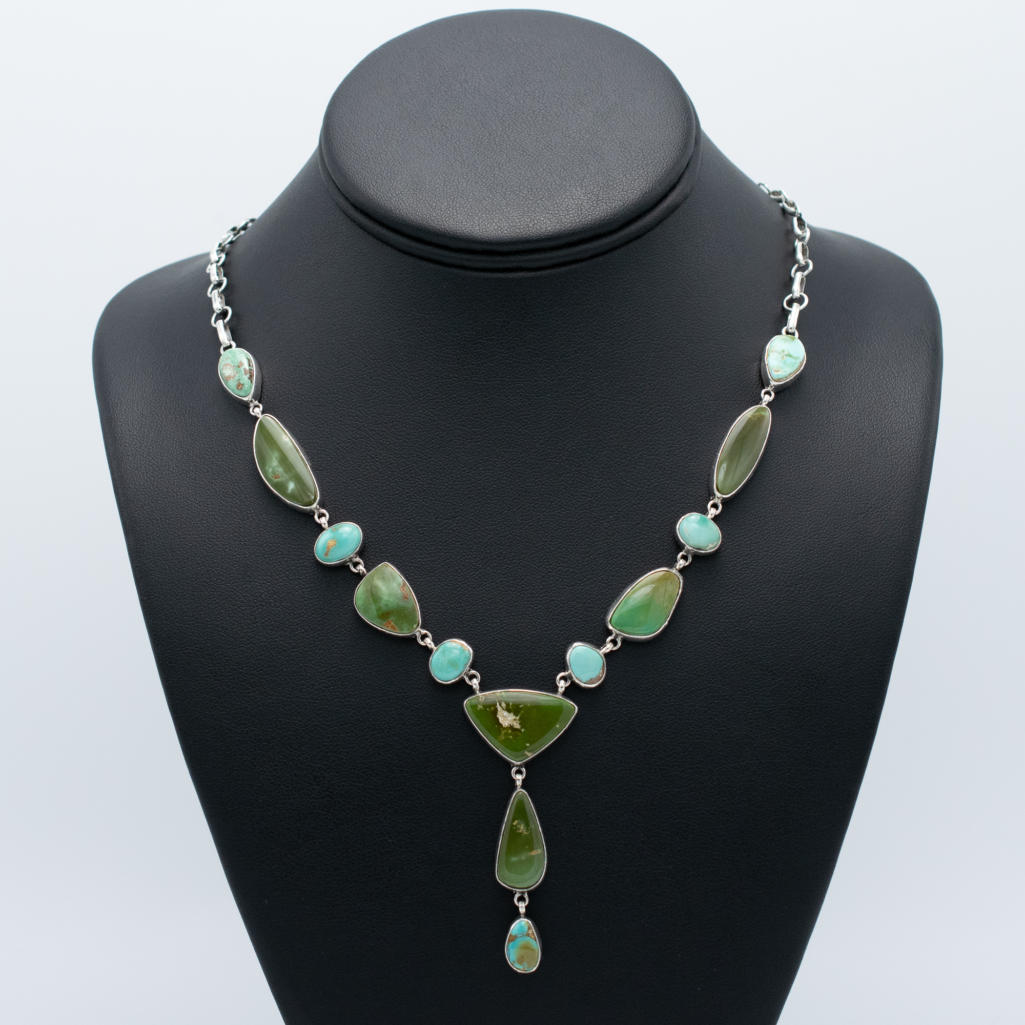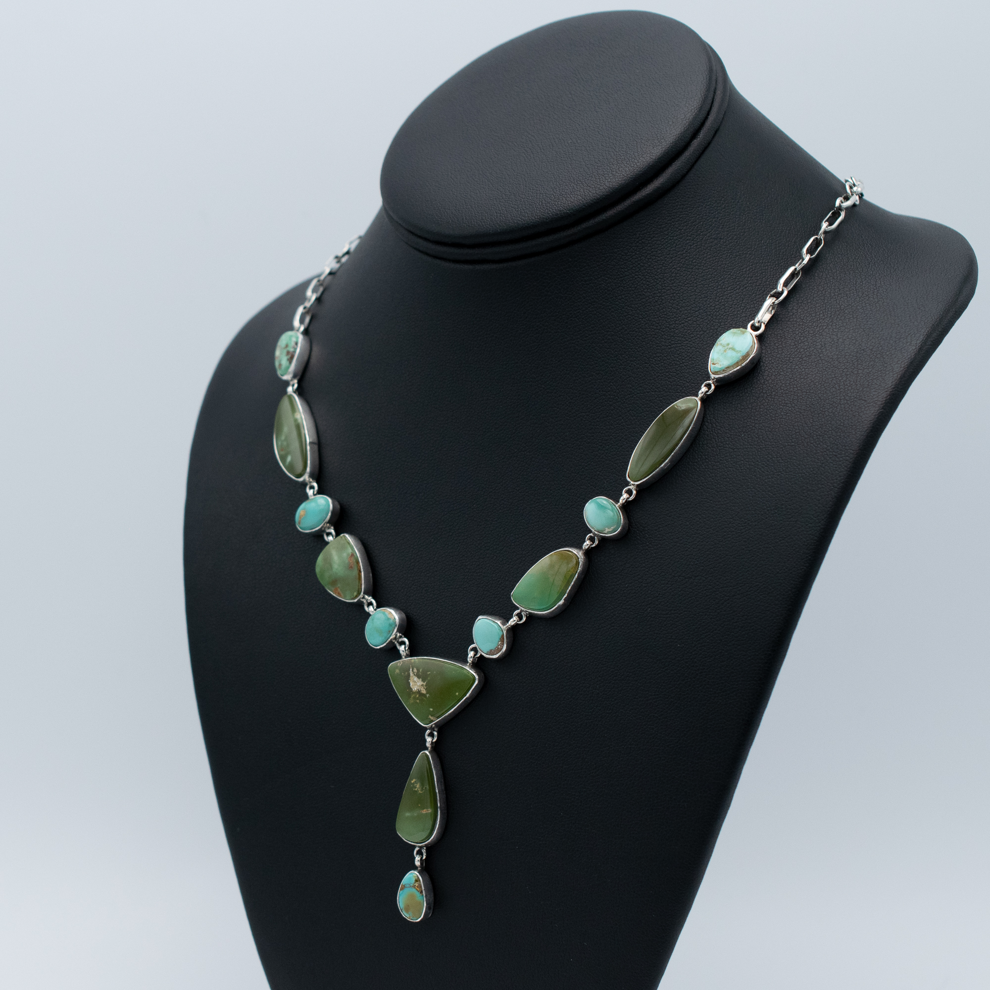 This High Lonesome and Cerrillos Turquoise Lariat Necklace is a graceful blend of earthy greens and soft blue hues. Each stone is carefully set in sterling silver and arranged in a fluid, symmetrical design that leads to a tiered drop at the center. The mix of rich High Lonesome turquoise and natural Cerrillos adds a unique depth and Southwest charm to this handcrafted statement piece.