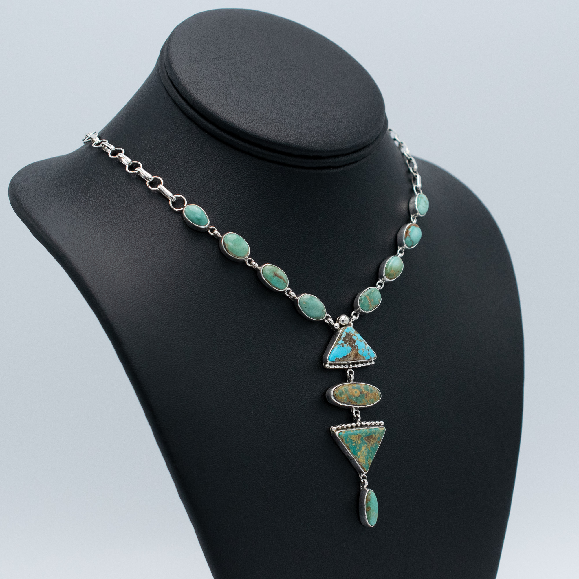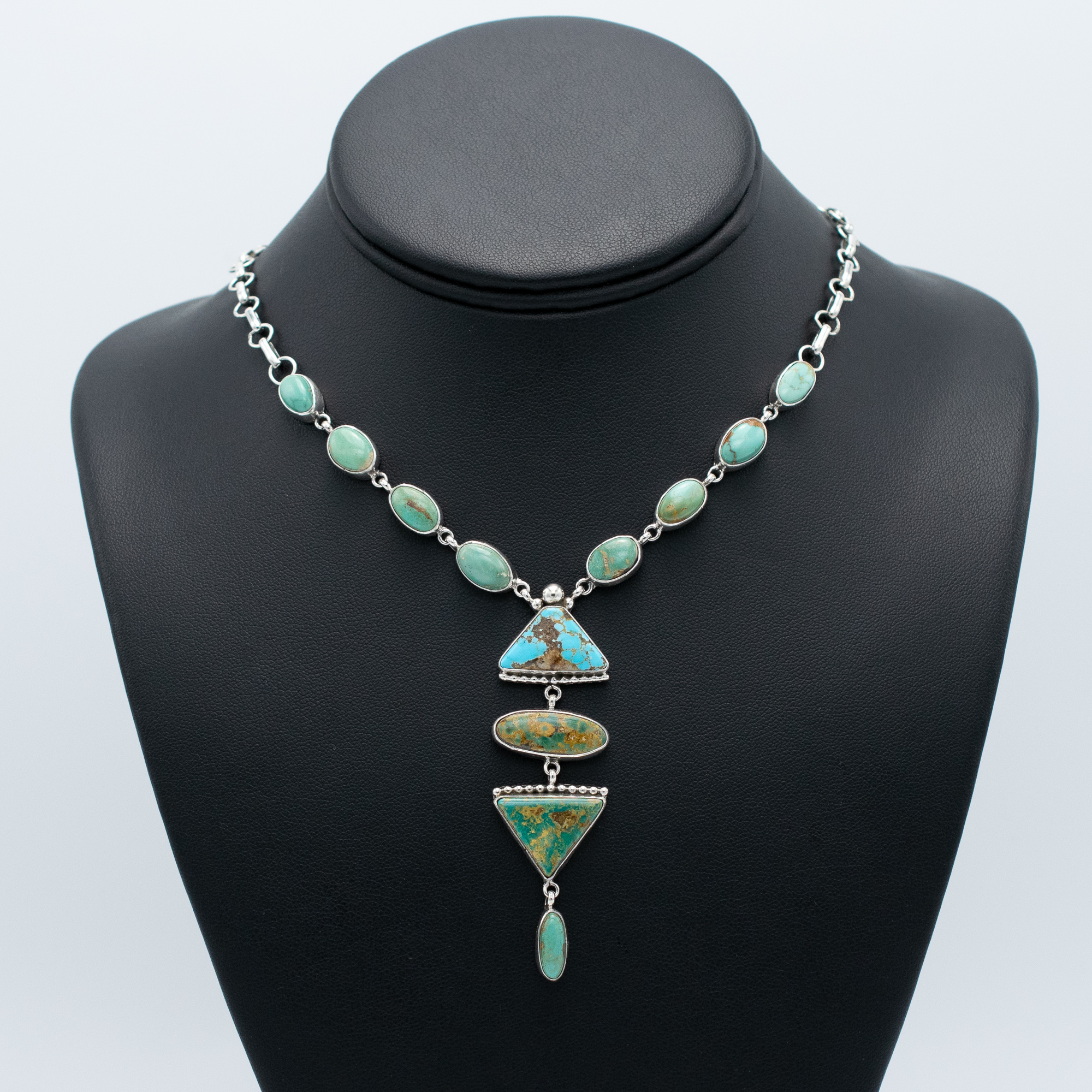 This stunning necklace by Navajo artist Ruth Ann Begay features a unique combination of High Lonesome and Cerrillos turquoise. Set in sterling silver, the vibrant stones are arranged in a striking vertical drop design that highlights the natural variation in color and matrix. With its bold composition and handcrafted quality, this piece is a beautiful expression of tradition and individuality.