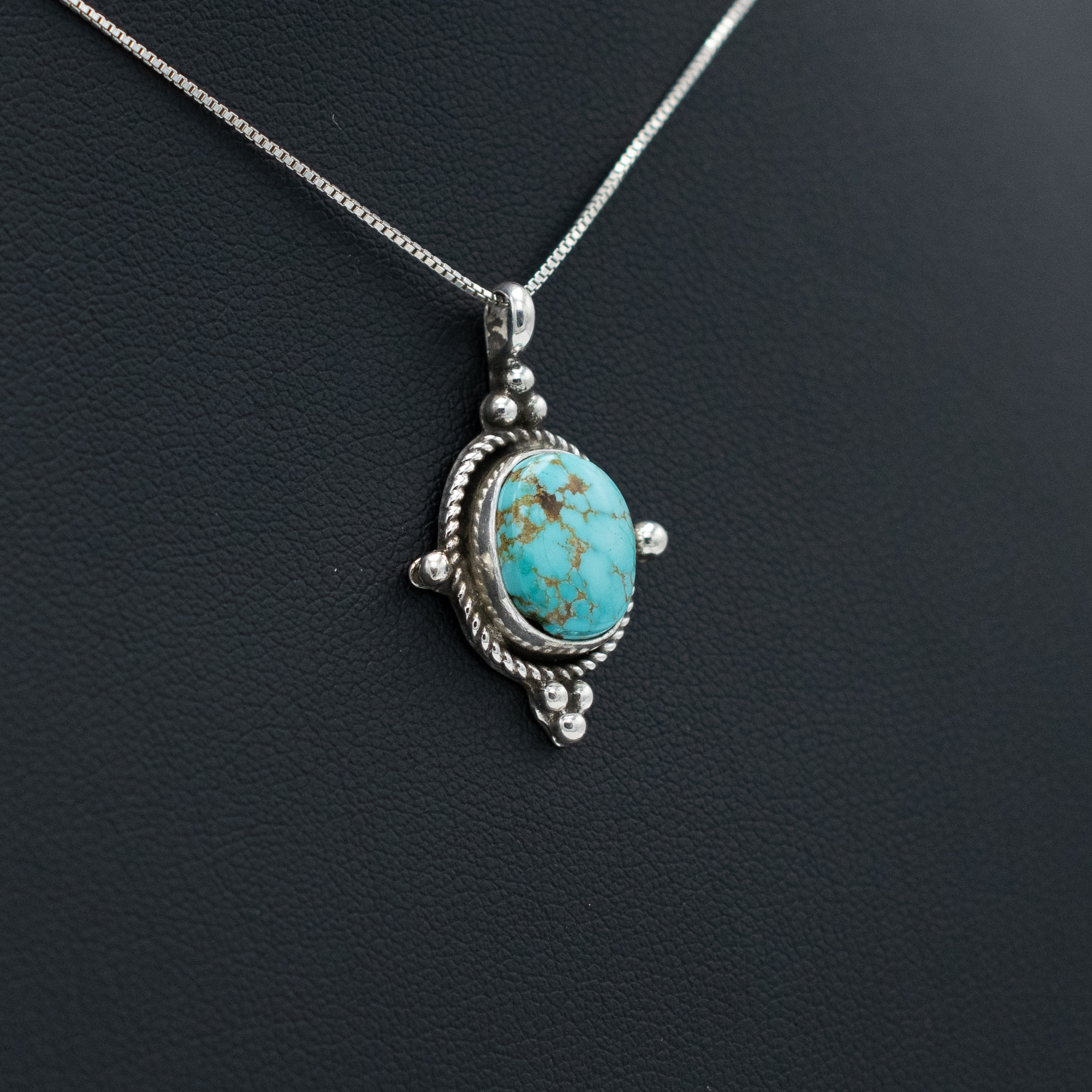 The Iron Maiden Turquoise Pendant by Navajo artist Ruth Ann Begay captures a balance of elegance and edge. The striking turquoise stone features a mesmerizing matrix, where soft sky-blue hues intertwine with rich golden veins, resembling a miniature desert landscape. Framed in a delicate twisted wire border and accented with silver beadwork, this pendant brings a timeless yet bold charm to any collection.