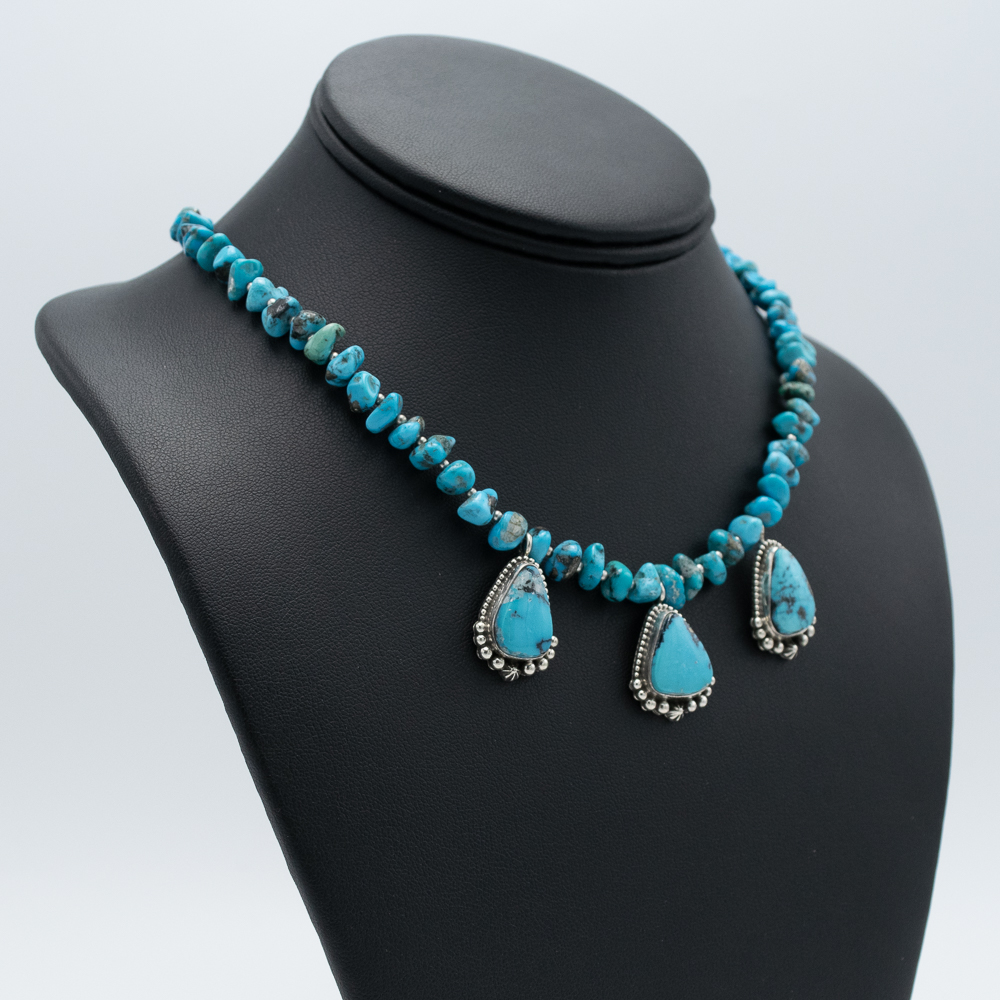 This Ithaca Peak Kingman Turquoise Necklace by Ruth Ann Begay, Navajo, showcases a striking array of vibrant turquoise beads. Three pendants featuring natural Ithaca Peak Kingman turquoise add elegance and charm to the piece. Perfect for making a bold yet sophisticated statement.