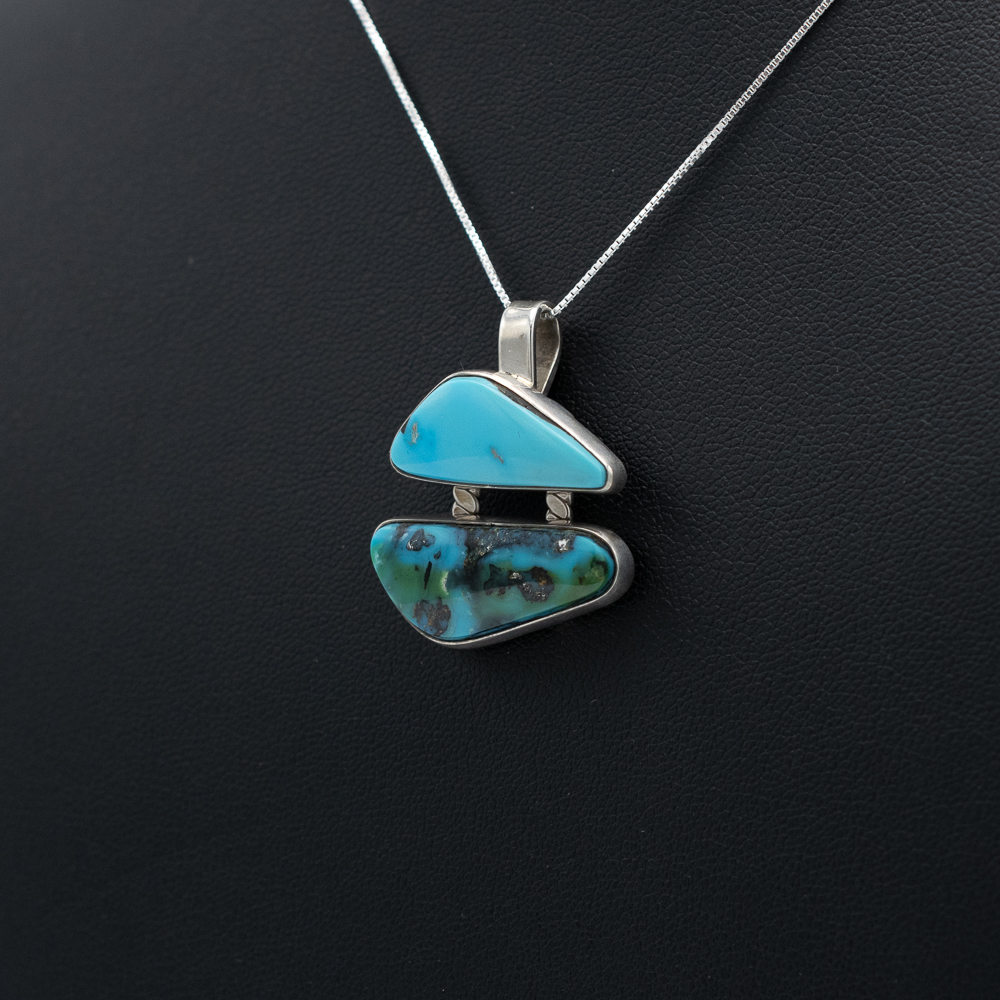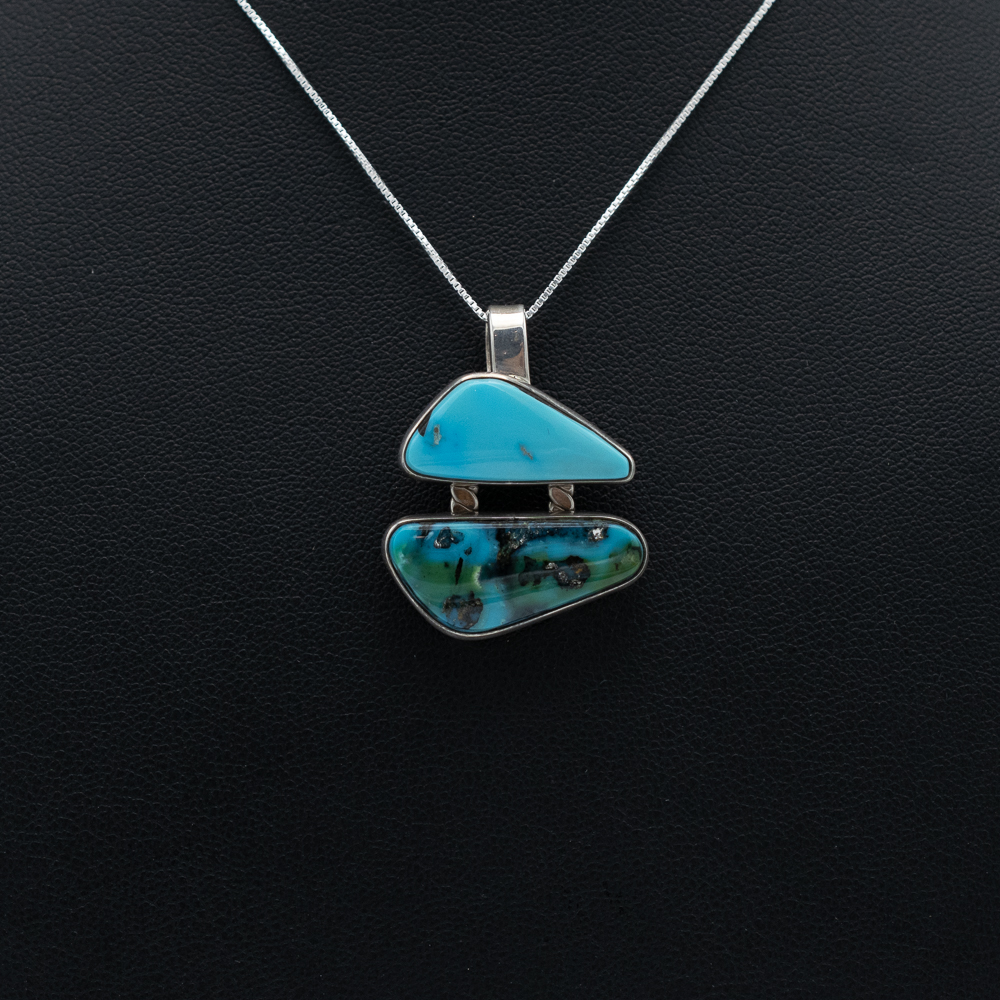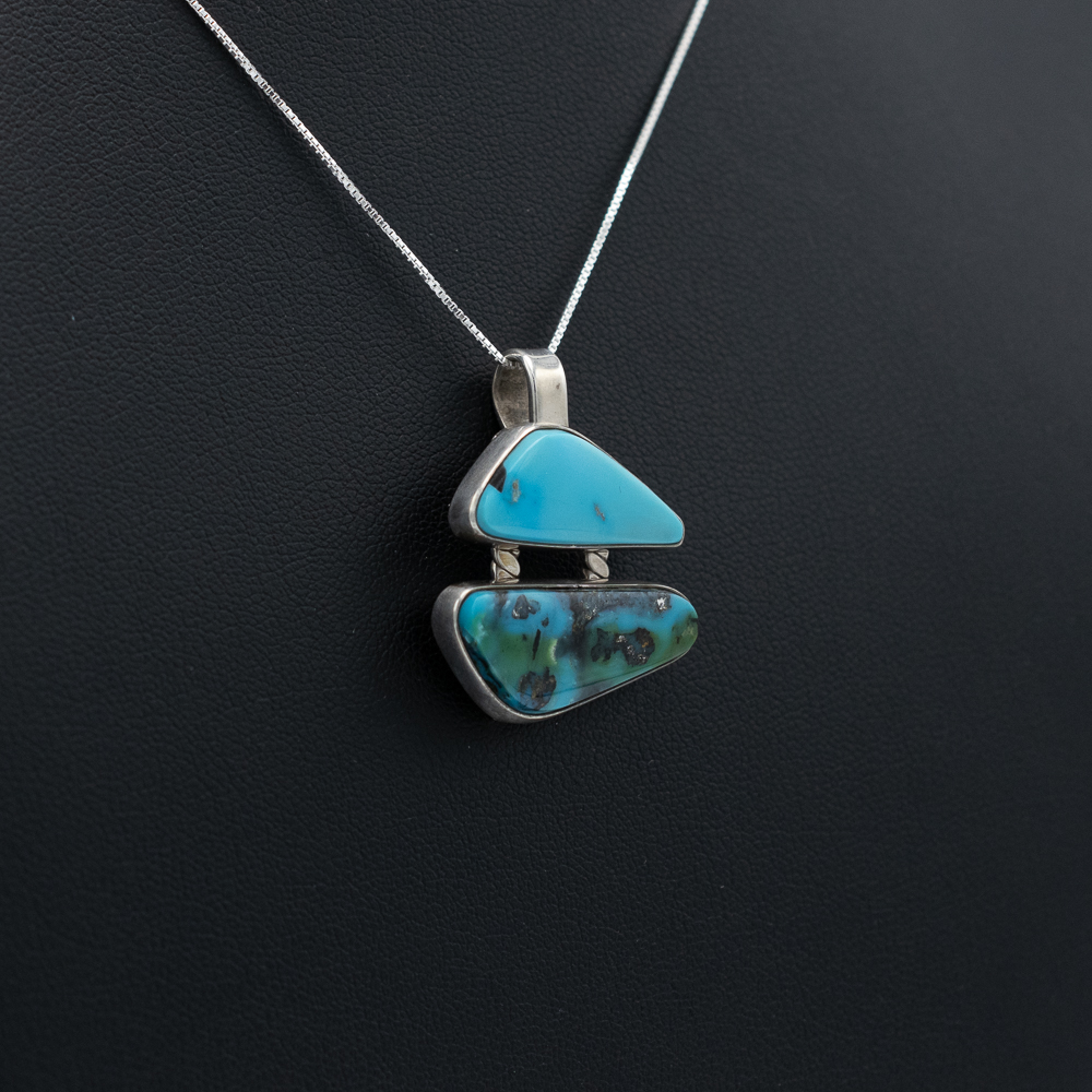 This pendant combines the vibrant hues of natural Blue Diamond and Ithaca Peak Kingman turquoise, skillfully crafted by Navajo artist Bryant Martinez. The bottom features the rich green-blue tones of Blue Diamond turquoise, while the top showcases the brilliant sky-blue of Kingman turquoise. A contemporary design highlights the natural beauty of each stone, making it a unique statement piece.