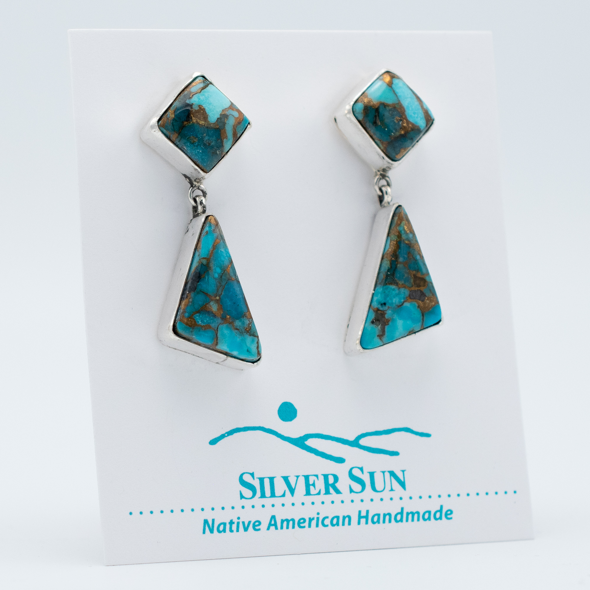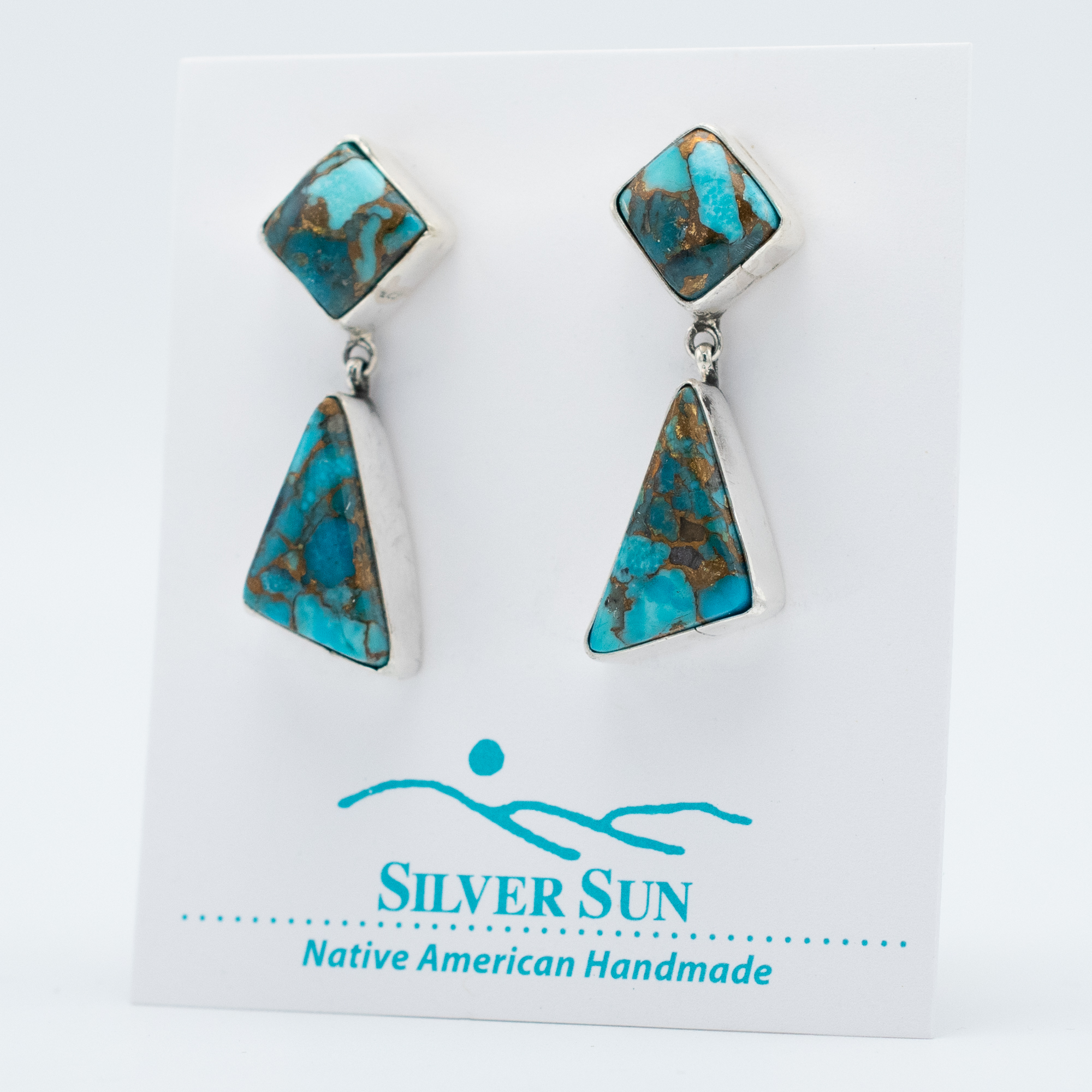 These Kingman Gold Earrings by Navajo artist Ruth Ann Begay highlight the striking contrast of vivid blue turquoise laced with rich golden matrix. The bold geometric shapes—a diamond top and trapezoid drop—create a dynamic silhouette that blends contemporary edge with traditional craftsmanship. A stunning pair for any turquoise lover.
