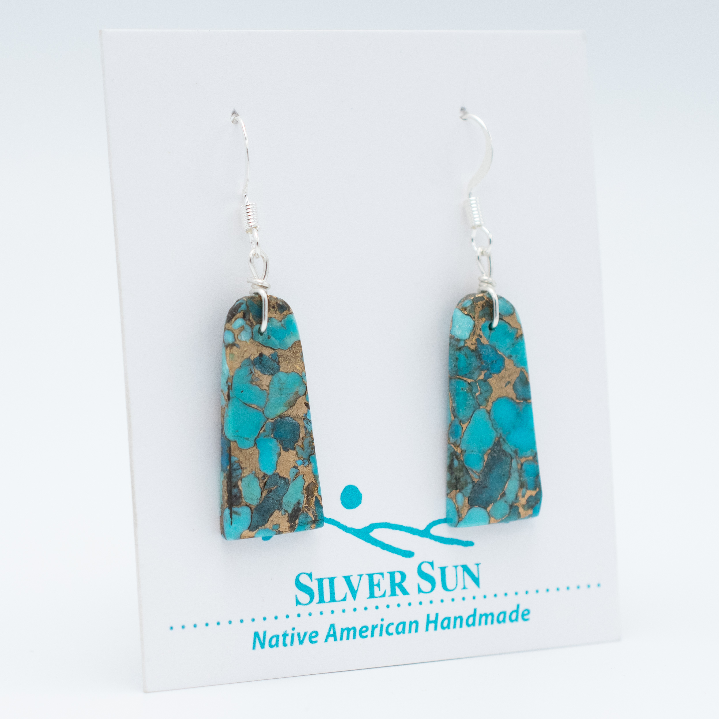 Adorn yourself with the exquisite beauty of the Southwest with these Kingman Gold Turquoise Slab Earrings crafted by Julian Coriz of Santo Domingo Pueblo. Each earring features a unique mosaic of Kingman Gold Turquoise, showcasing mesmerizing hues of blue tied together by a golden matrix. Suspended from sterling silver hooks, these earrings exude a timeless elegance, making them a perfect statement piece for any occasion.
