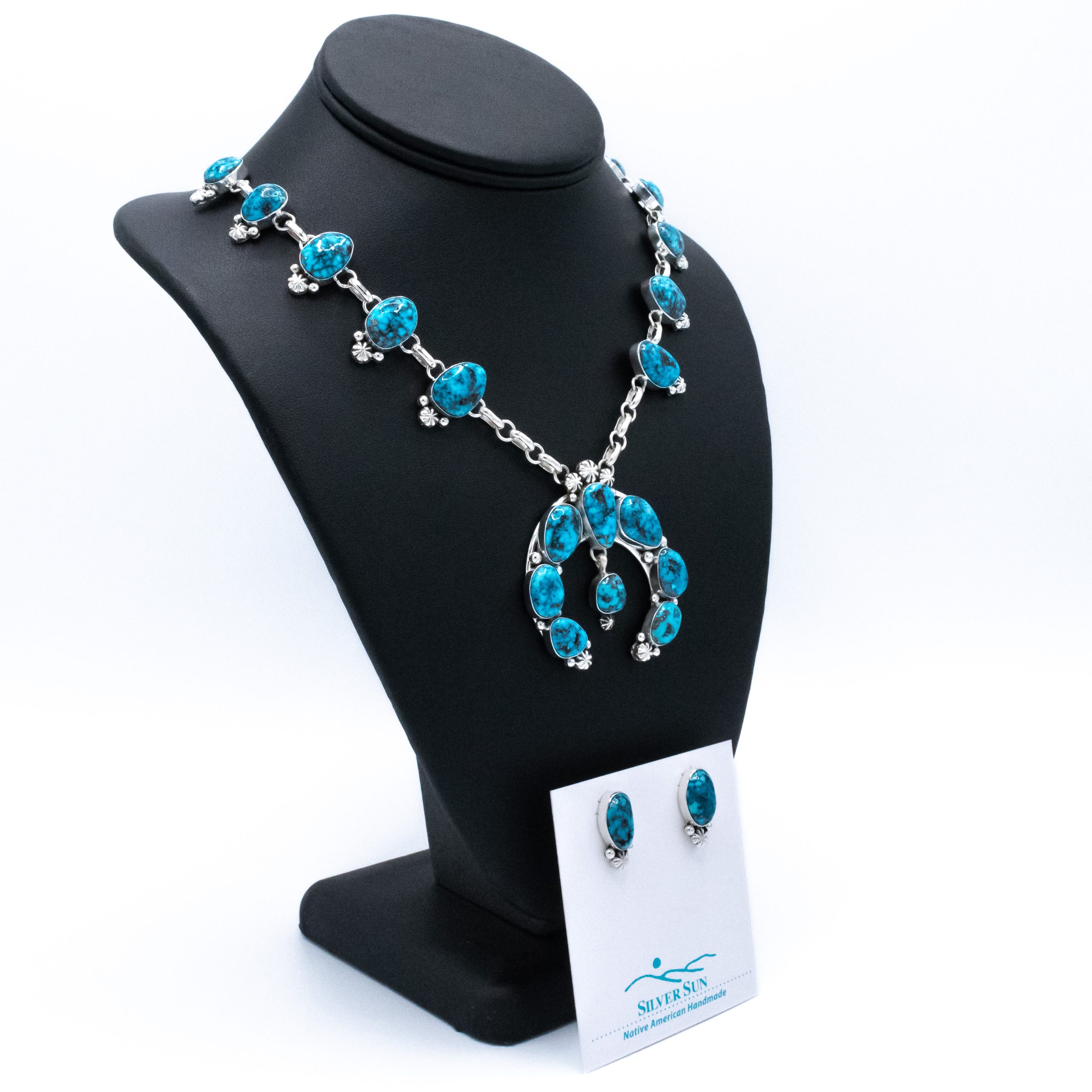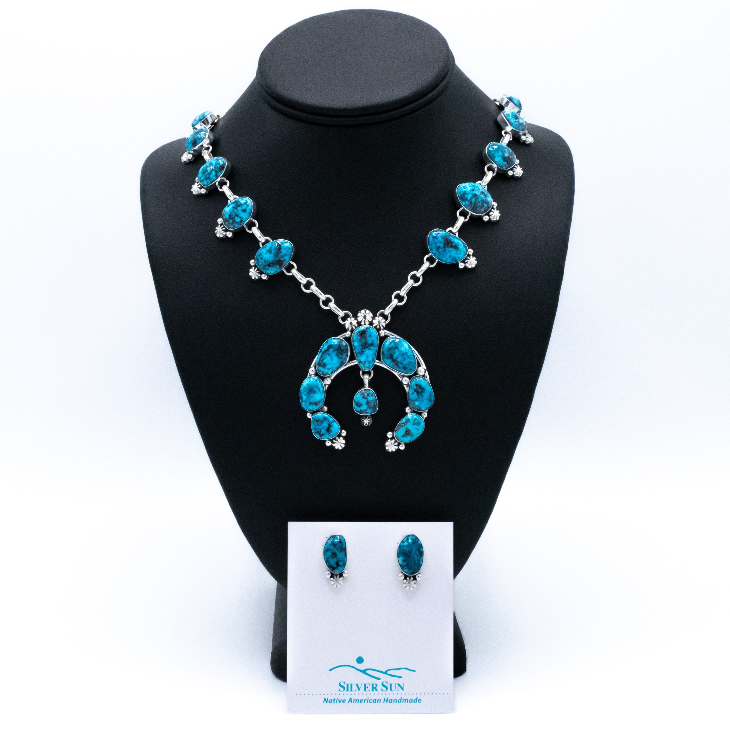 This is a lovely contemporary take on a squash blossom; it’s a carefree and fun necklace and earring set. The adjustable chain makes it versatile too. Well matched deep blue, dark webbed enhanced Kingman is a nice contrast to the bright silver finish.