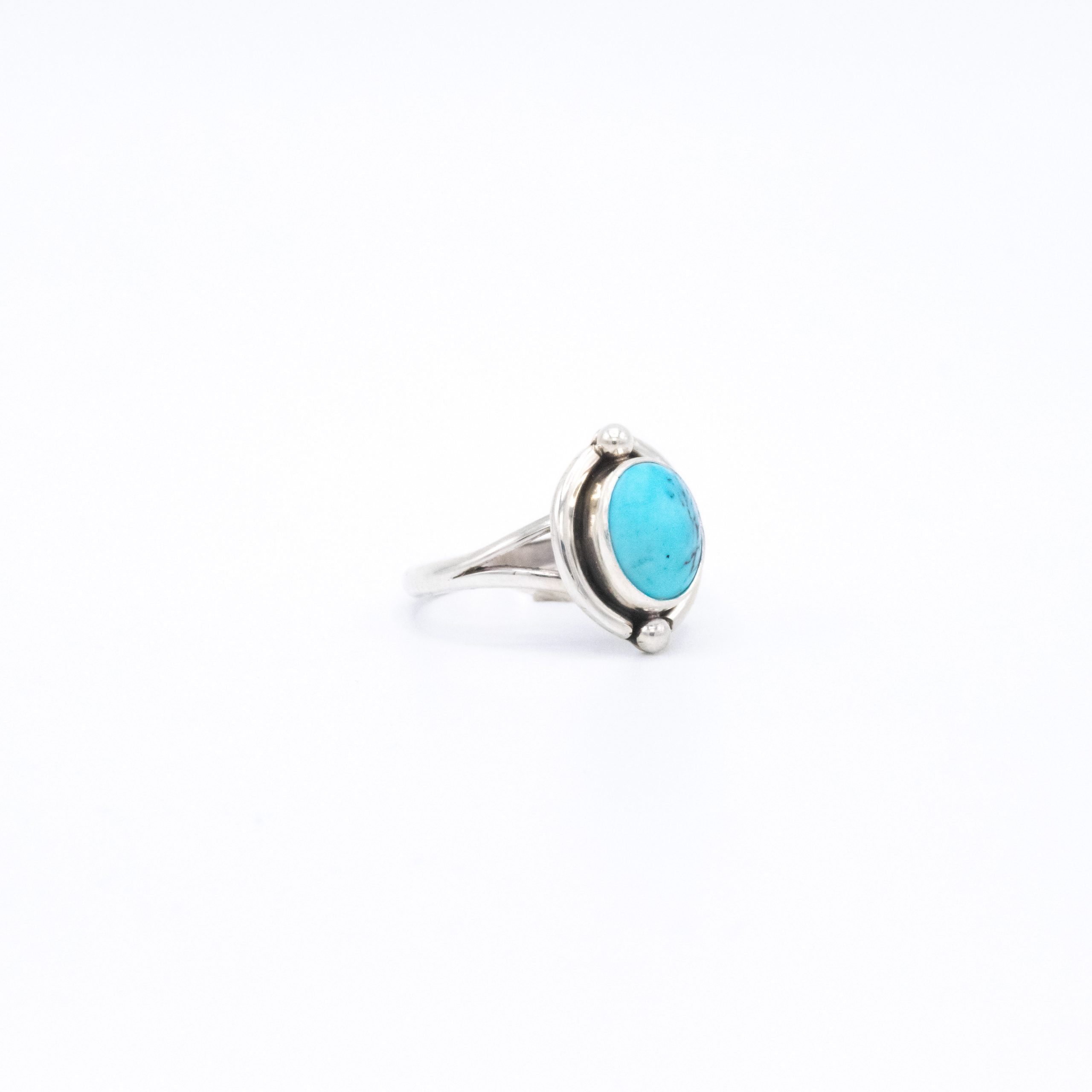 A cute little Kingman stabilized turquoise where one half is clear and the other half is black webbed; turquoise is always interesting!