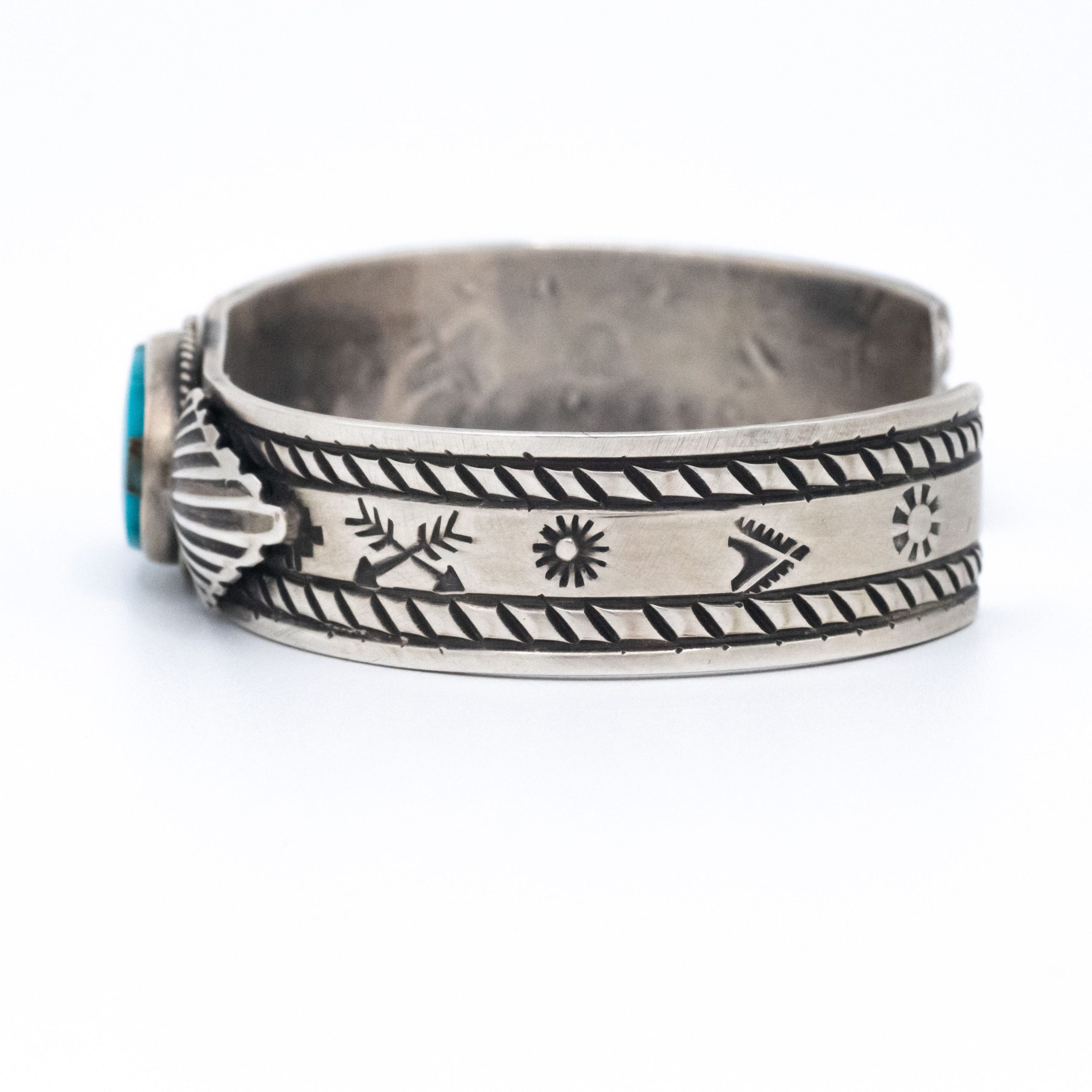 Tapered silver fans top a lovely silver shank stamped with symbols. A pretty deep teal Kingman stabilized stone with minimal webbing pulls it all together. Nice!