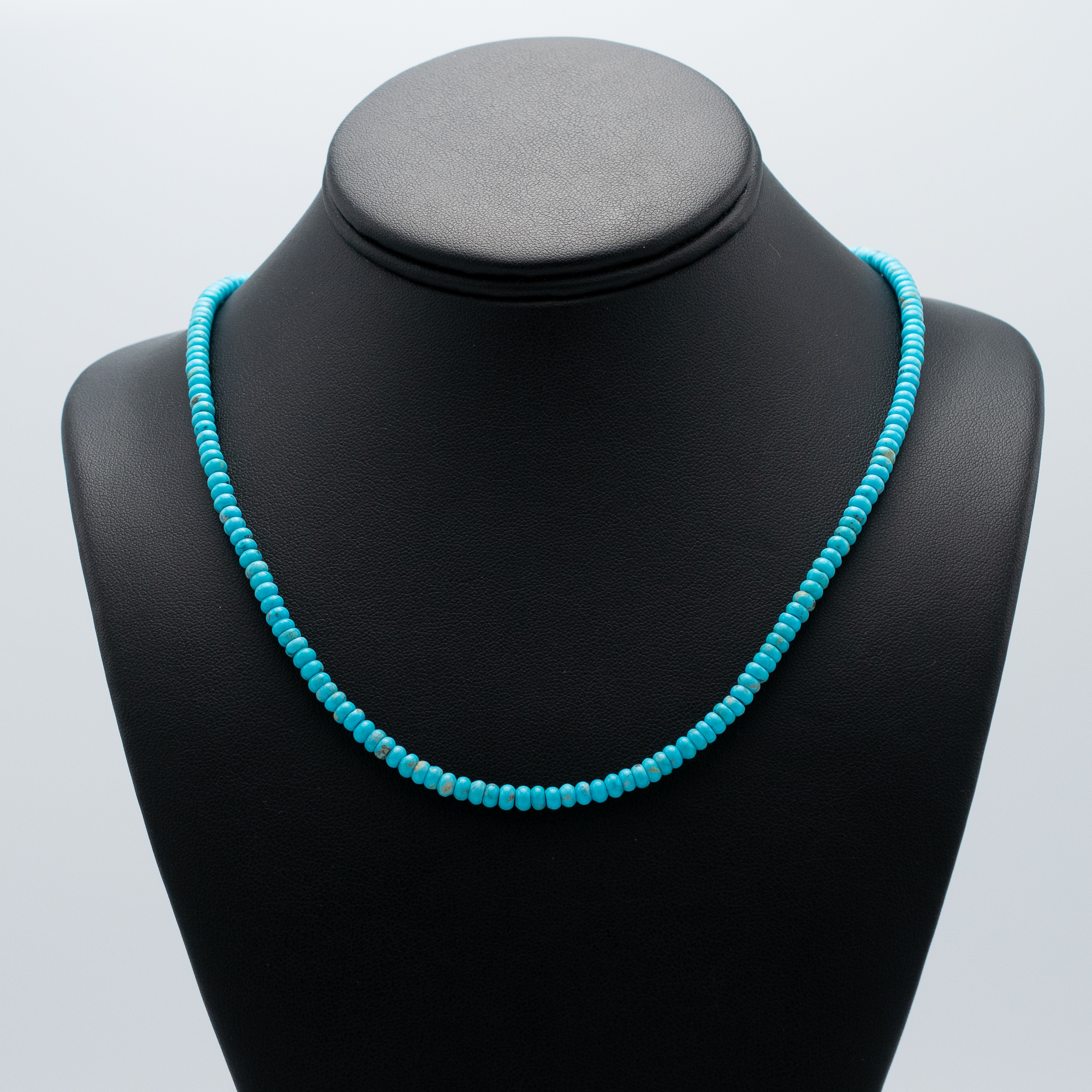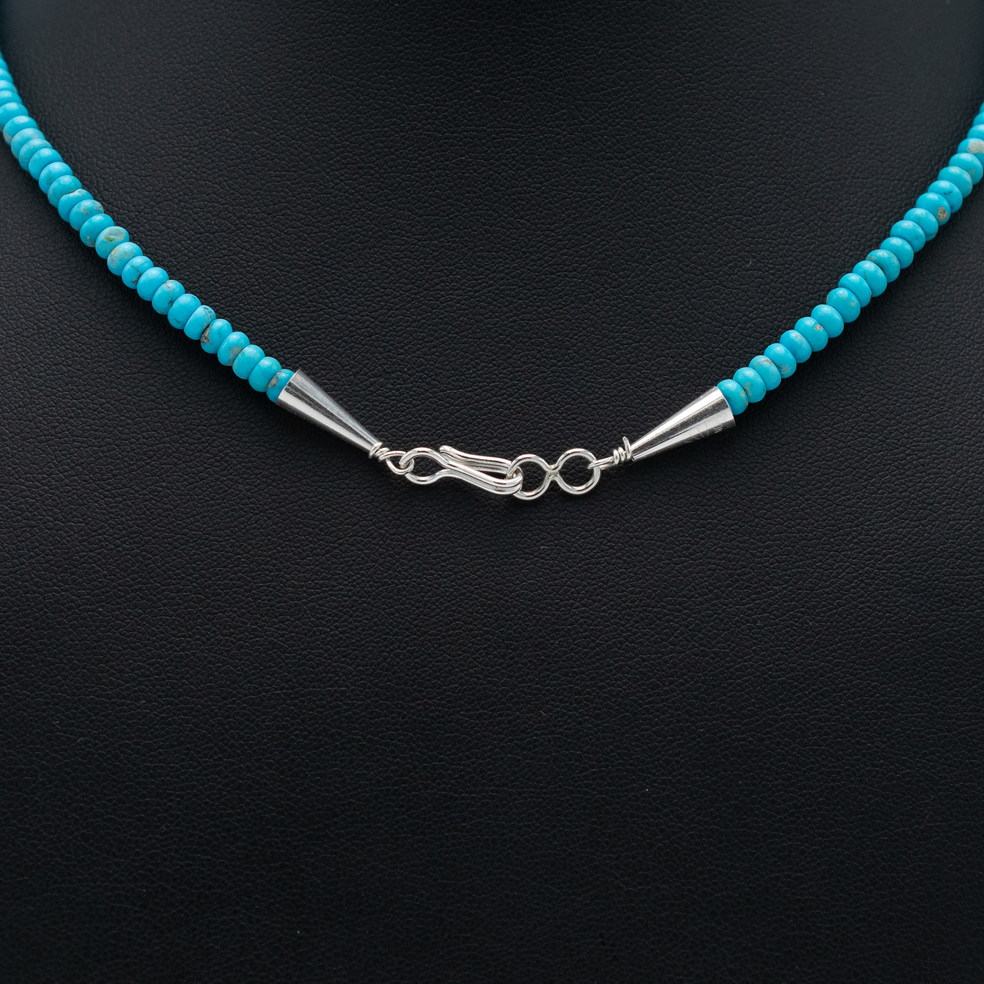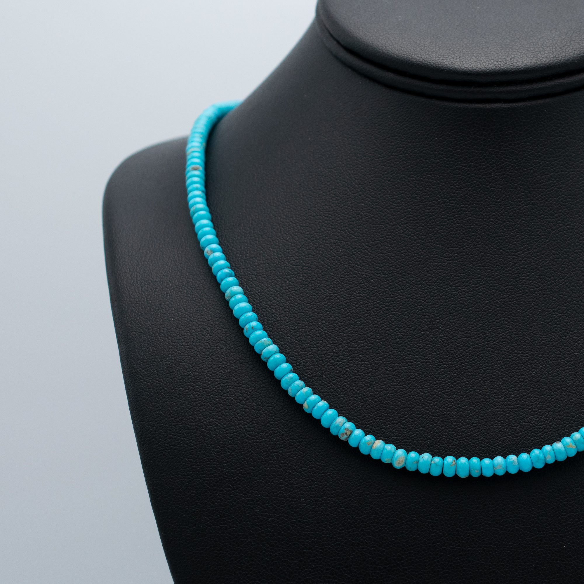 This simple yet captivating necklace by San Felipe Pueblo artist Kathleen Sanchez features stabilized Kingman turquoise beads in a rich sky blue tone. The uniformity of the small disc-shaped beads gives this piece a clean, minimalist look, perfect for layering or wearing solo as a pop of color. Hand-strung with care and intention, it reflects Kathleen’s elegant approach to traditional Southwestern design.
