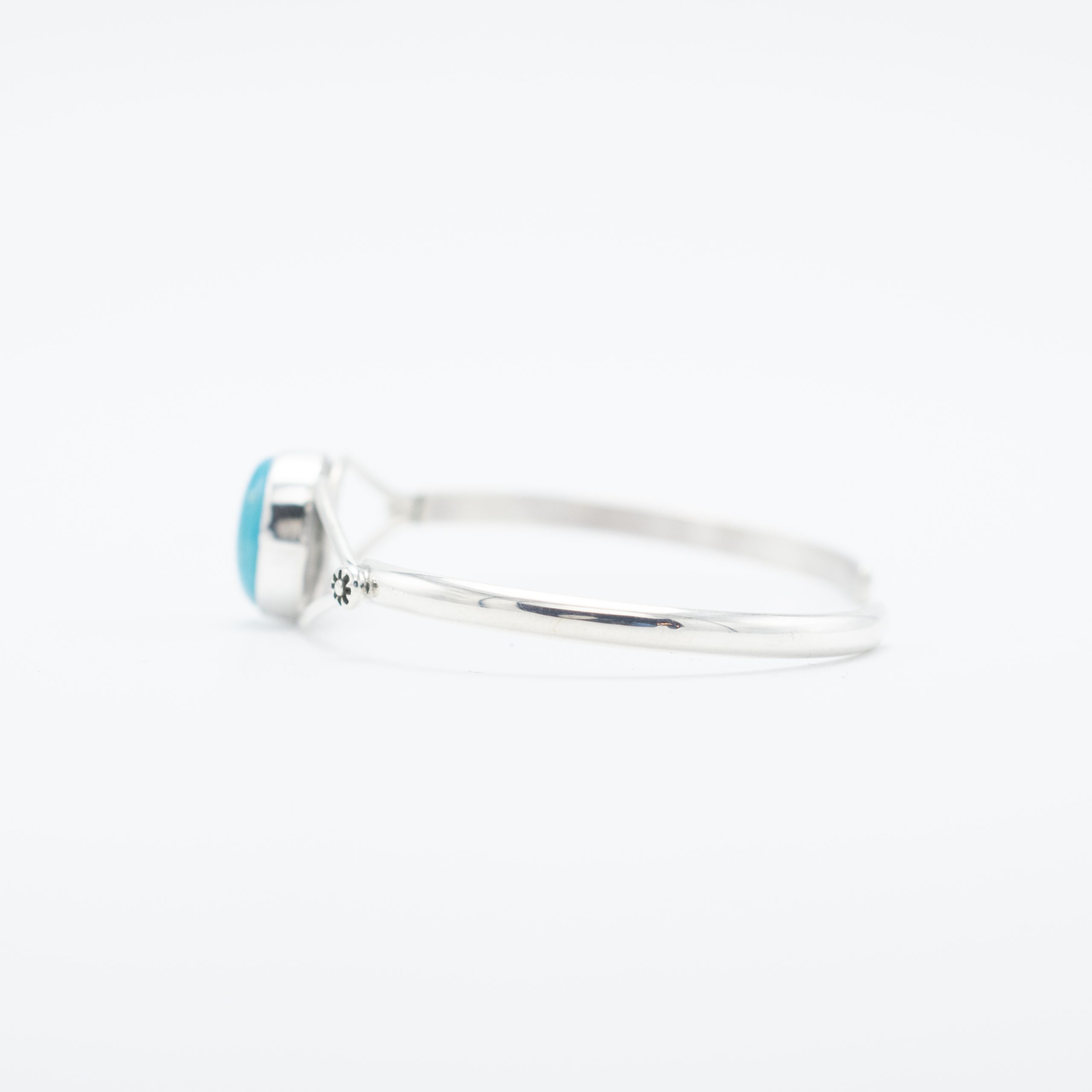 This elegant bracelet showcases a striking Kingman turquoise stone set in sterling silver. The clean, open design of the shank frames the vibrant turquoise, allowing its natural beauty to stand out. Navajo artist Ruth Ann Begay brings her traditional craftsmanship to this piece, making it a timeless accessory for any occasion. Its delicate floral accents add a touch of charm to this otherwise minimalist design. Perfect for wearing alone or layering, this bracelet is a sophisticated way to incorporate the allure of turquoise into your collection.