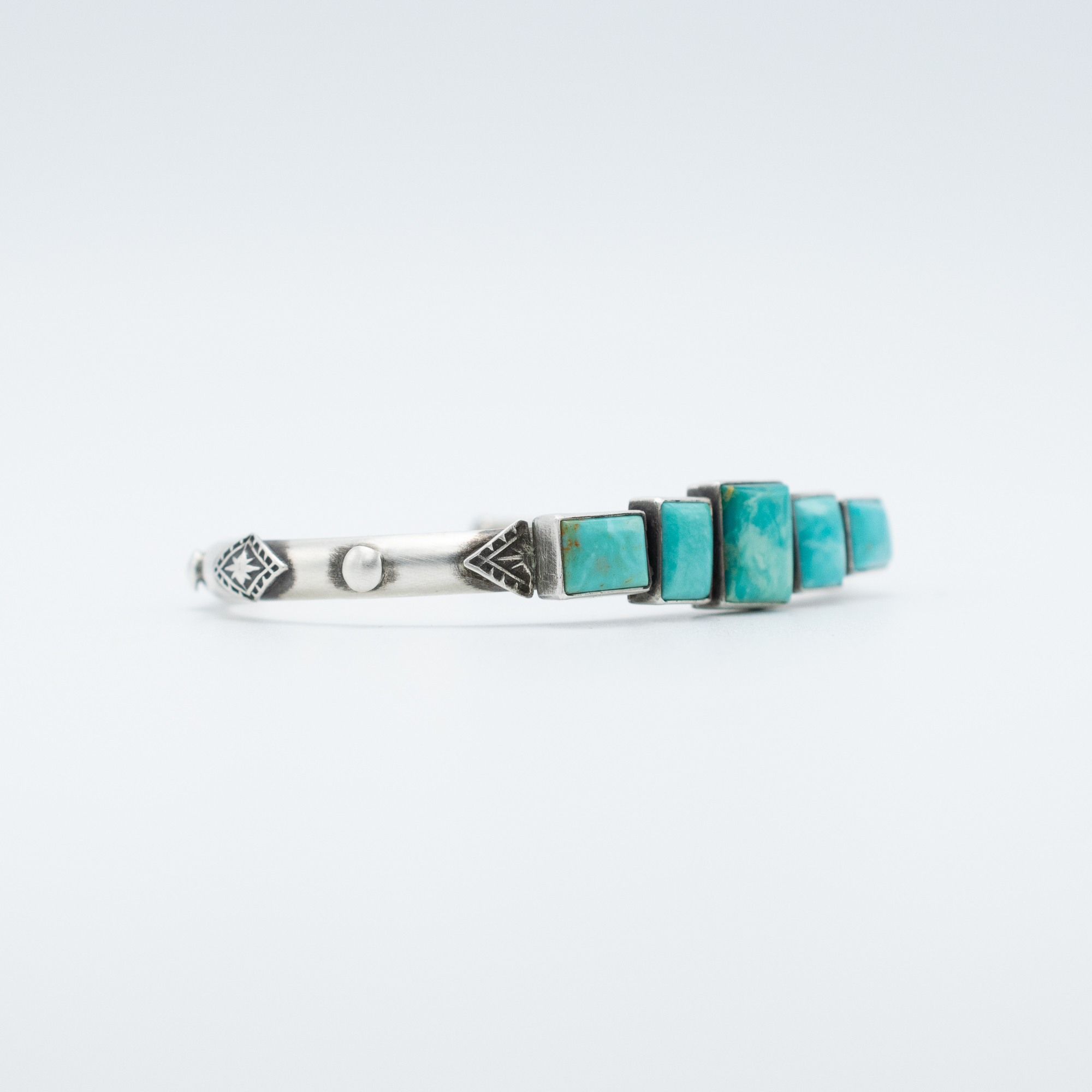 This Stabilized Kingman Turquoise Bracelet by Navajo artist Bryant Martinez features a sleek row of five square-cut turquoise stones, each hand-set in a plain bezel. The rich blues of the stabilized Kingman turquoise are beautifully contrasted by the clean silverwork and subtle stamp details on the cuff. A refined design that adds a vibrant touch to any look.