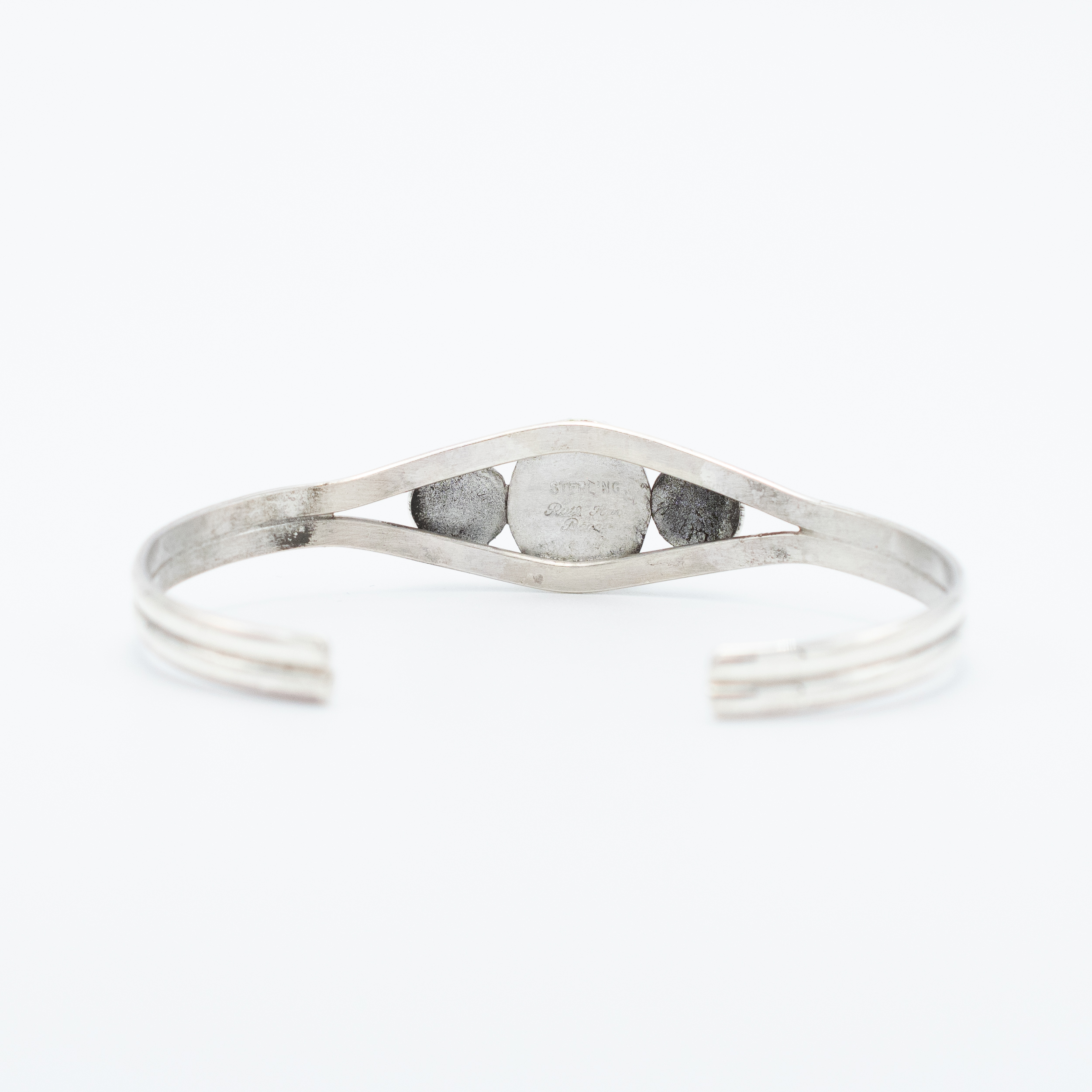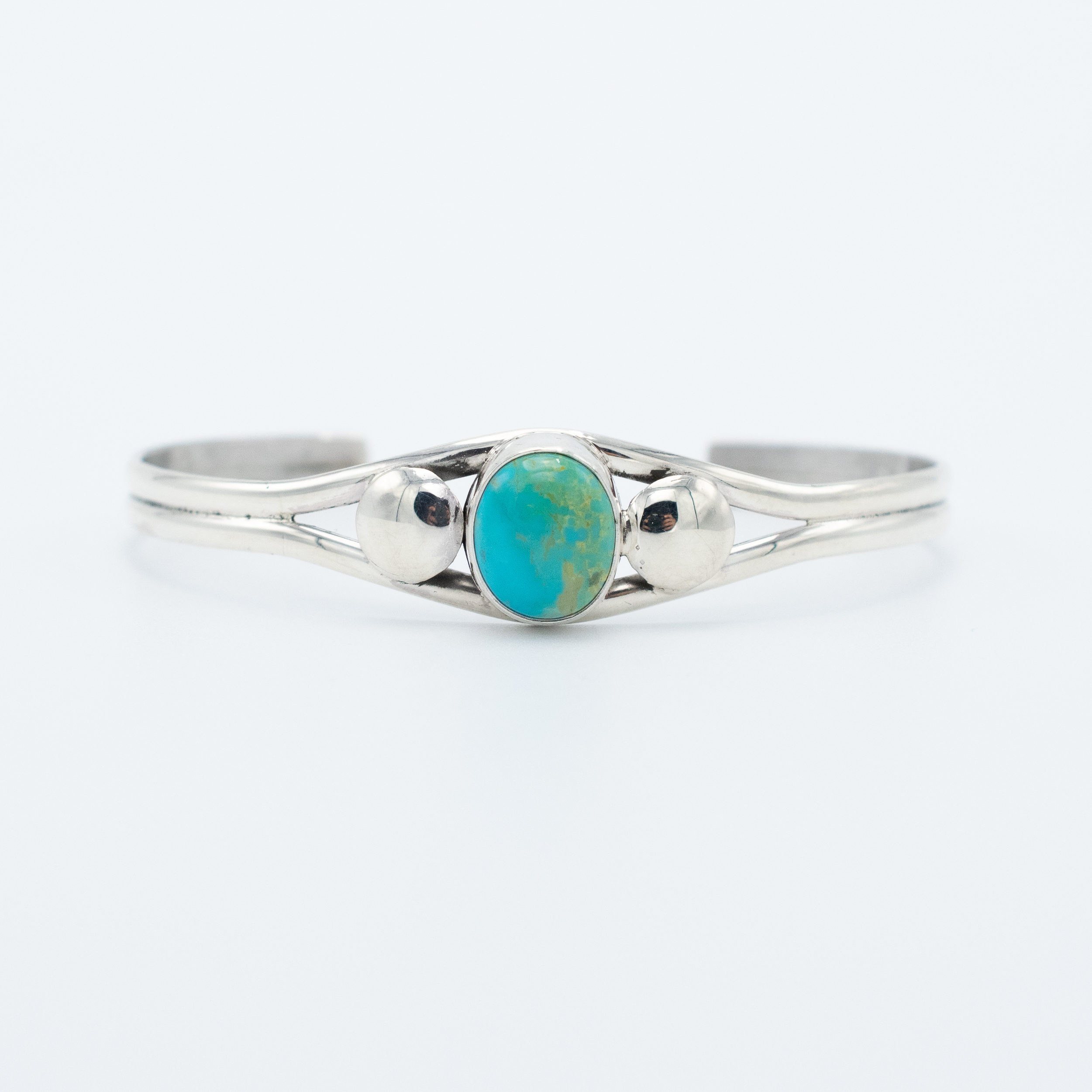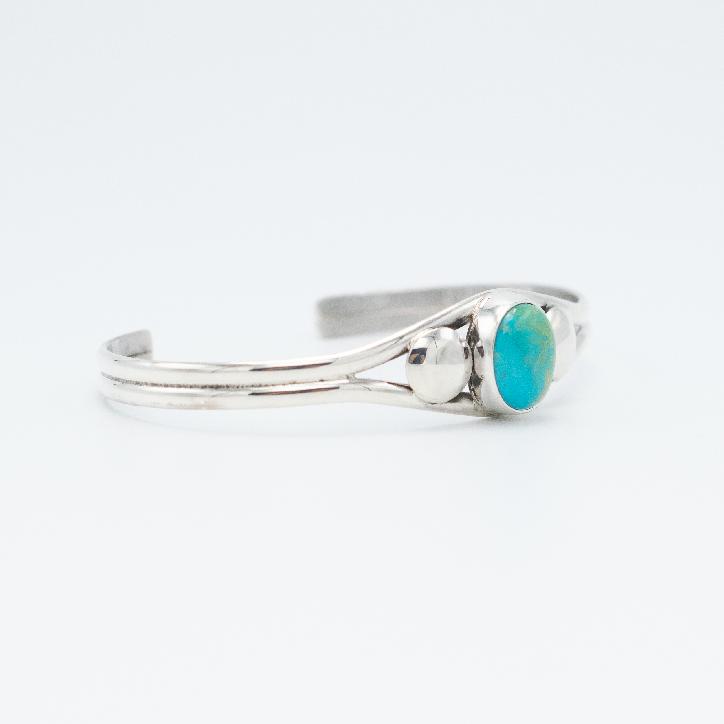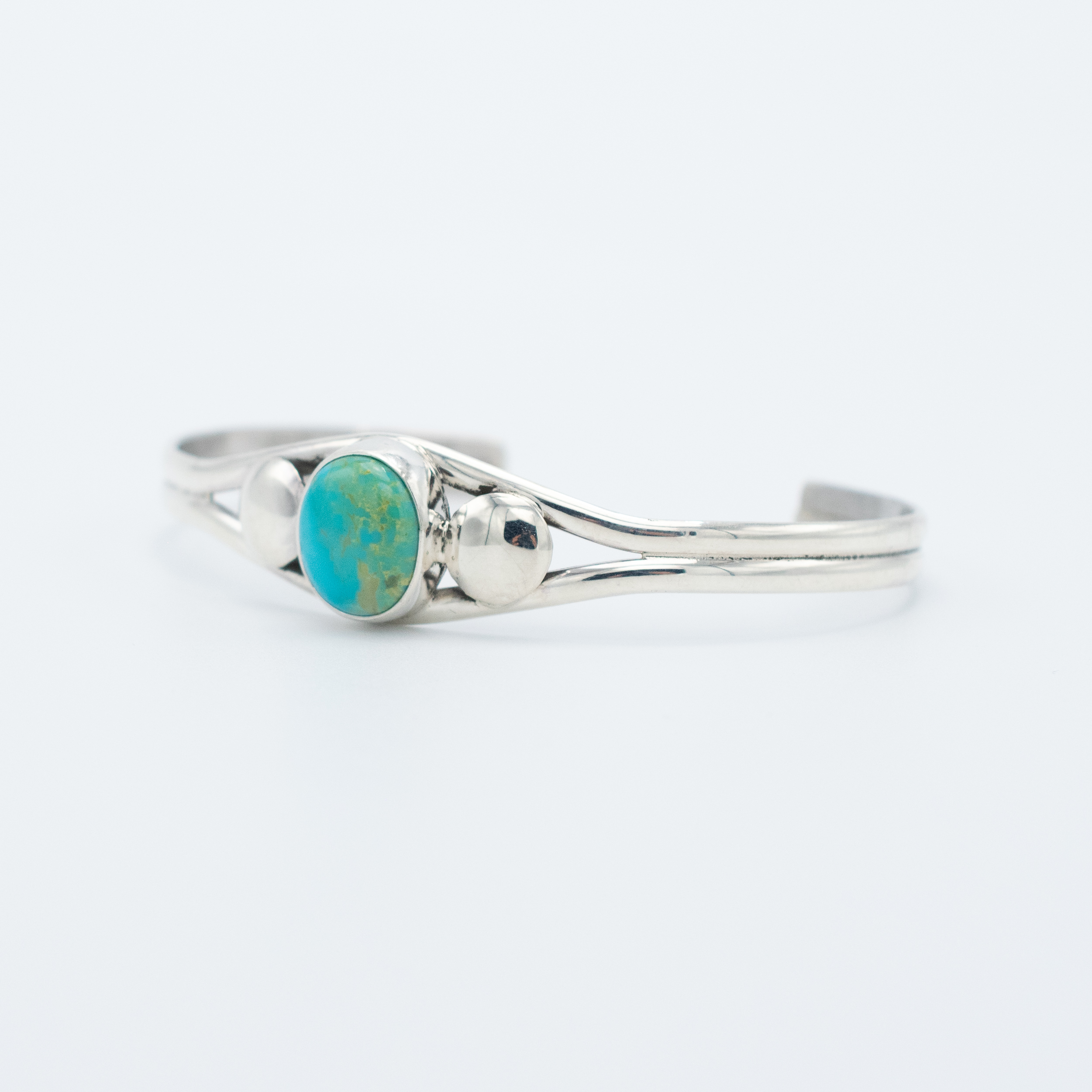 This Kingman Turquoise Bracelet by Navajo artisan Ruth Ann Begay features a beautifully simple design. The polished silver shank splits around the center stone, with two silver discs filling the spaces that would typically be open. The sky blue turquoise stone, with hints of a golden matrix, serves as the captivating focal point. Handcrafted with a minimalist approach, this bracelet offers a perfect blend of understated elegance and traditional craftsmanship.