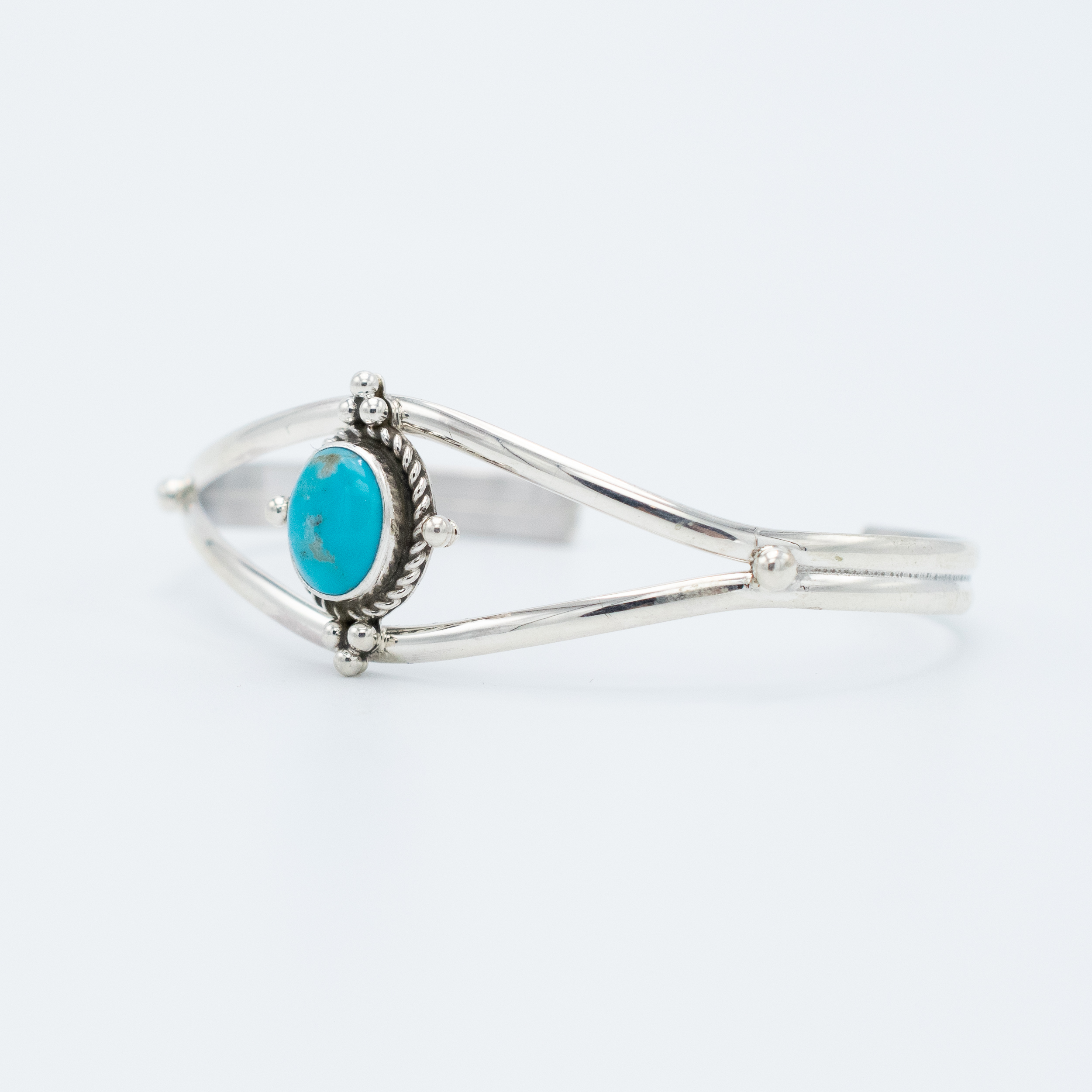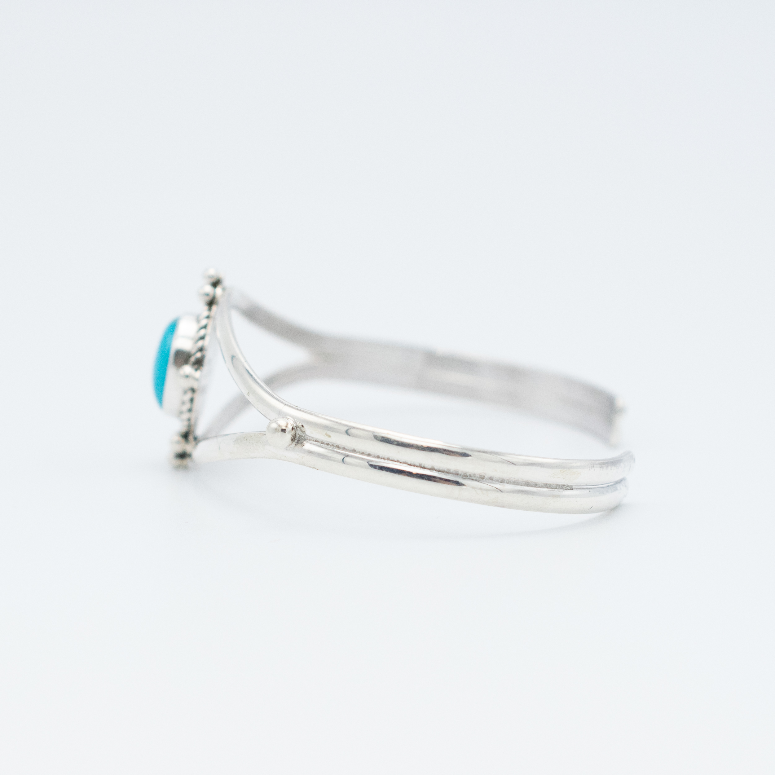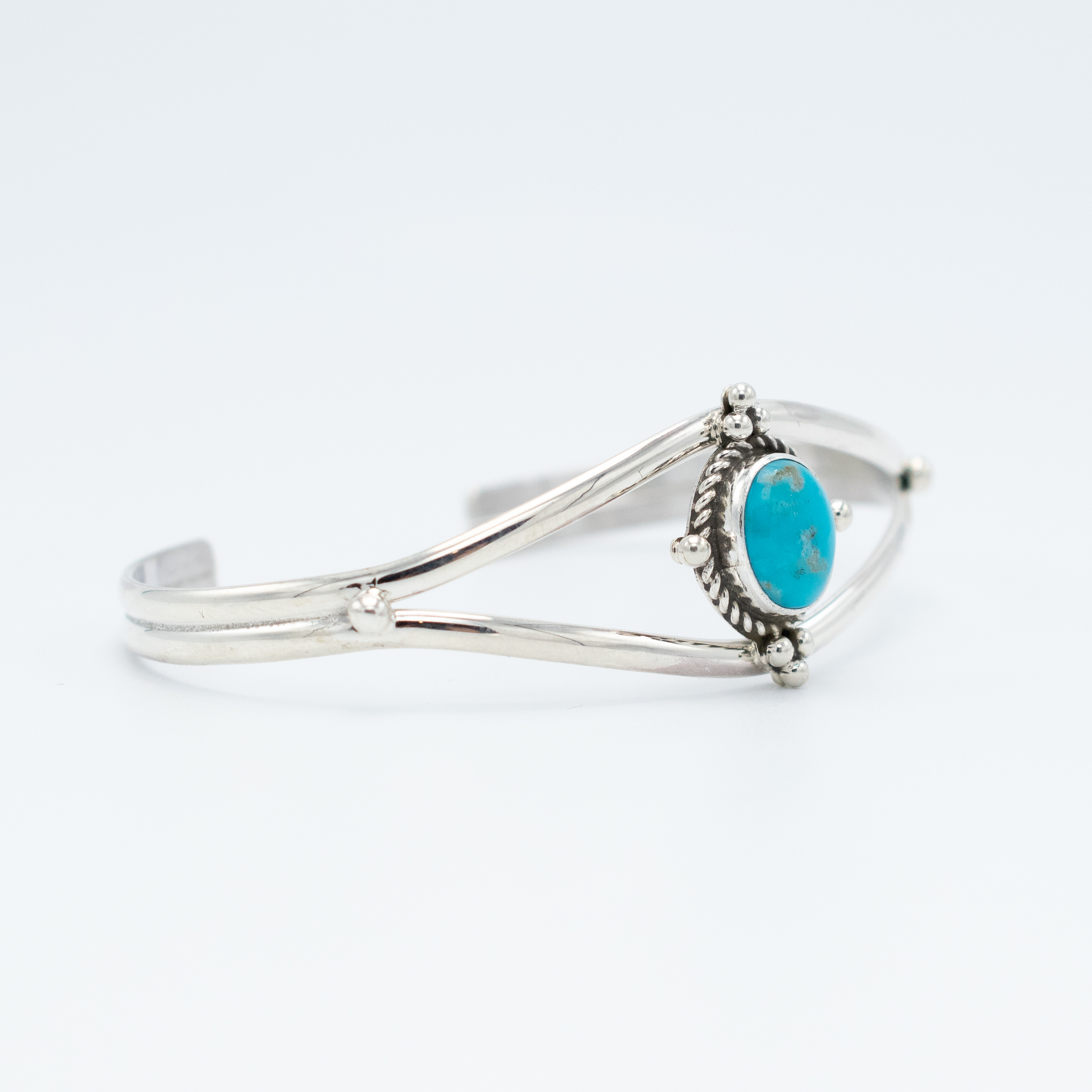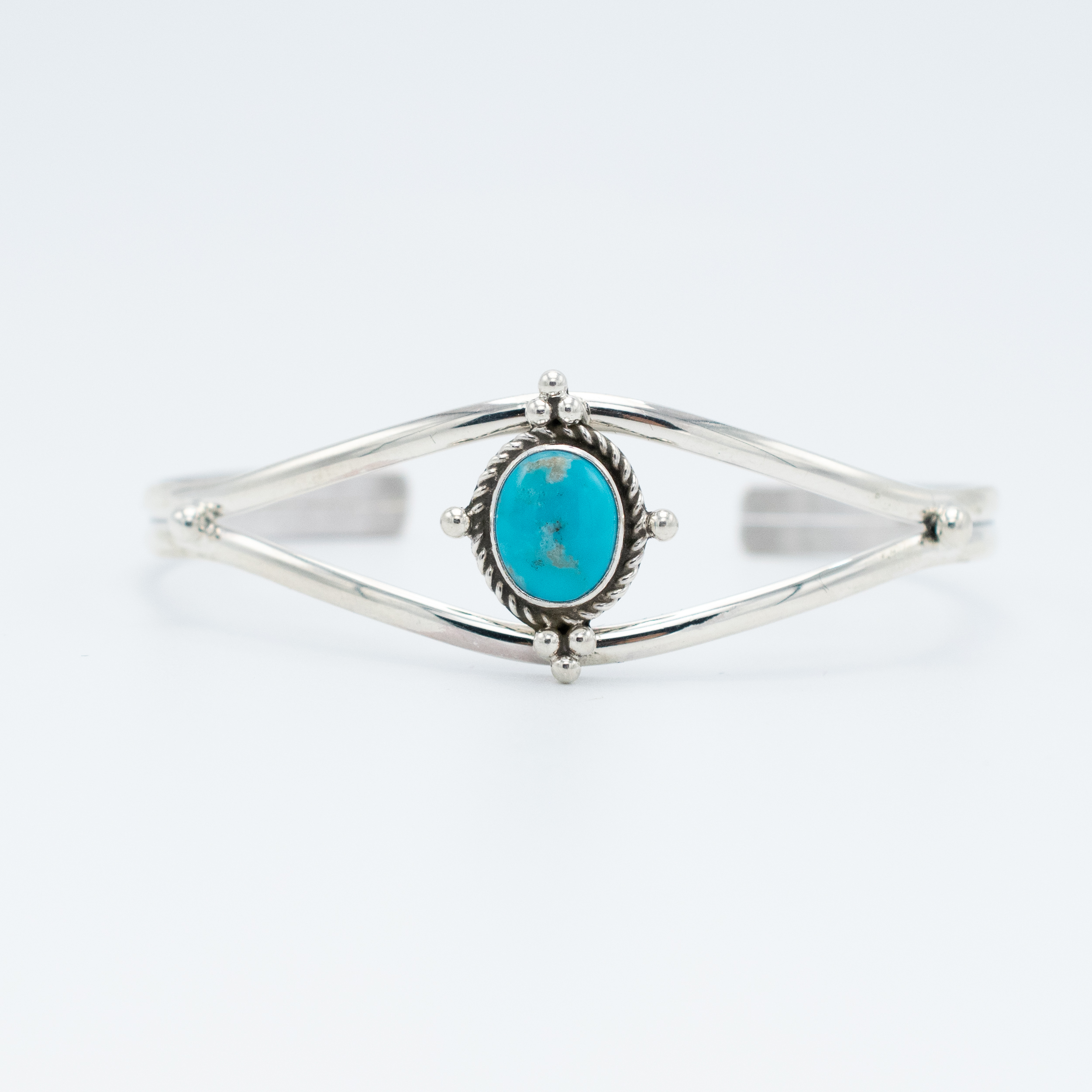 This Enhanced Kingman Turquoise Bracelet by Navajo artisan Ruth Ann Begay features a stunning turquoise stone set in a plain bezel, framed by elegant twist wire. Silver raindrops are delicately placed at the north, south, east, and west points around the stone, adding a touch of intricate detail. Handcrafted with precision, this bracelet combines traditional Navajo techniques with a classic, refined design.