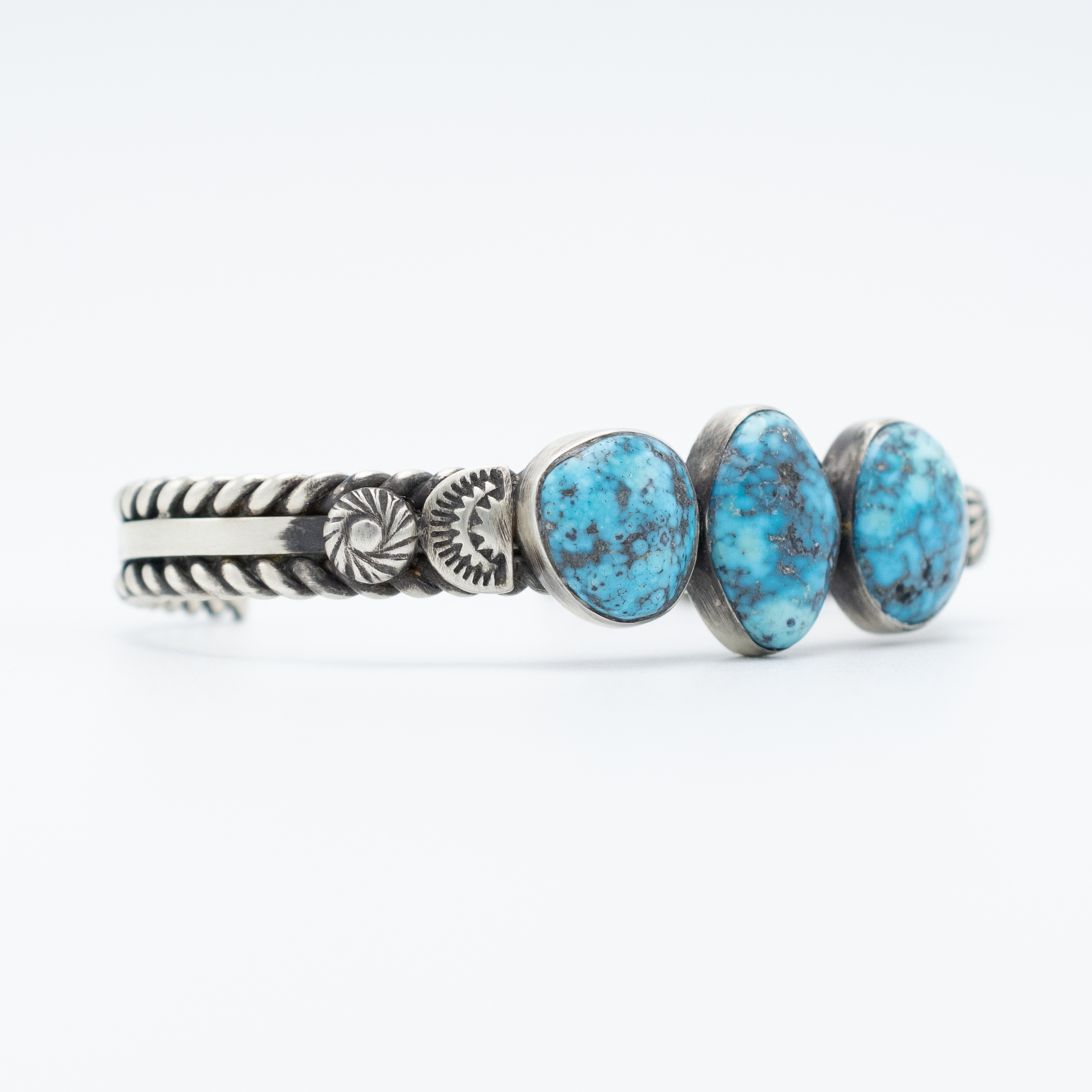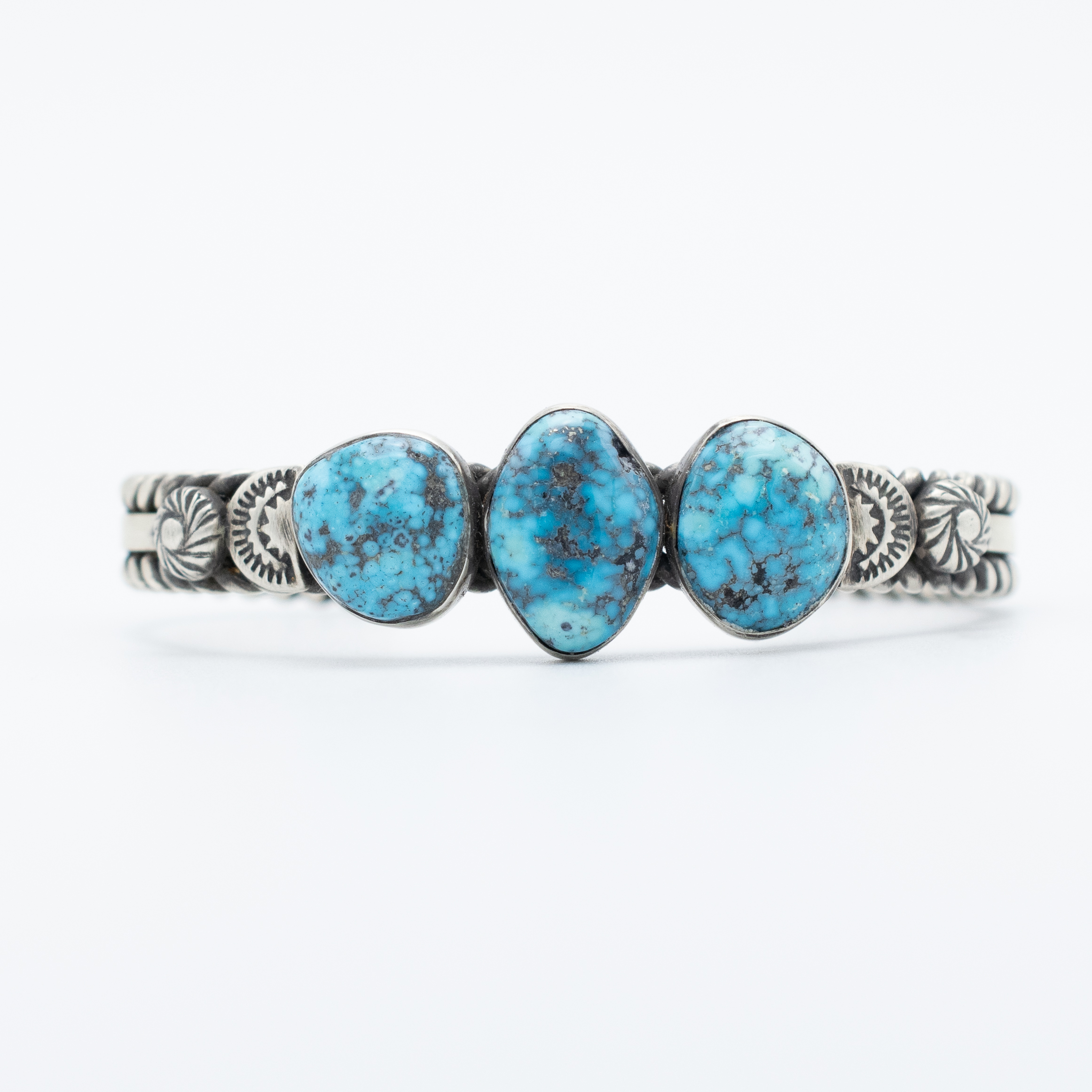 This exquisite cuff bracelet, crafted by Navajo artist Bryant Martinez, showcases three stabilized Kingman turquoise stones, each boasting striking blue hues with dark matrix patterns. The stones are set side by side, graduating in size and encased in sterling silver bezels that highlight their unique shapes and textures. The silver band features hand-stamped traditional motifs, adding to the bracelet’s intricate detail and authentic Southwestern style. With its comfortable fit and bold design, this cuff is perfect for making a statement, honoring both the beauty of Kingman turquoise and the skill of Navajo silversmithing.