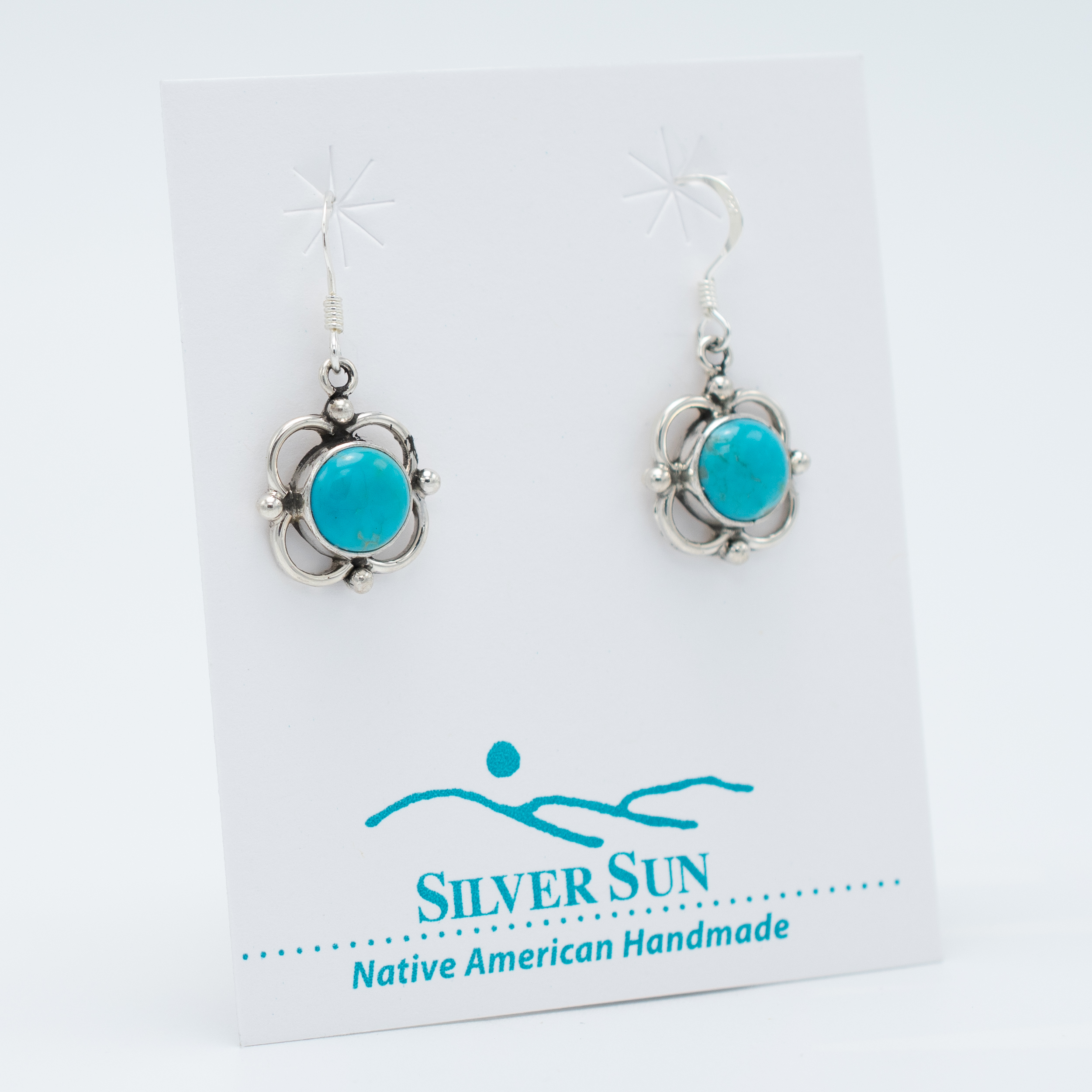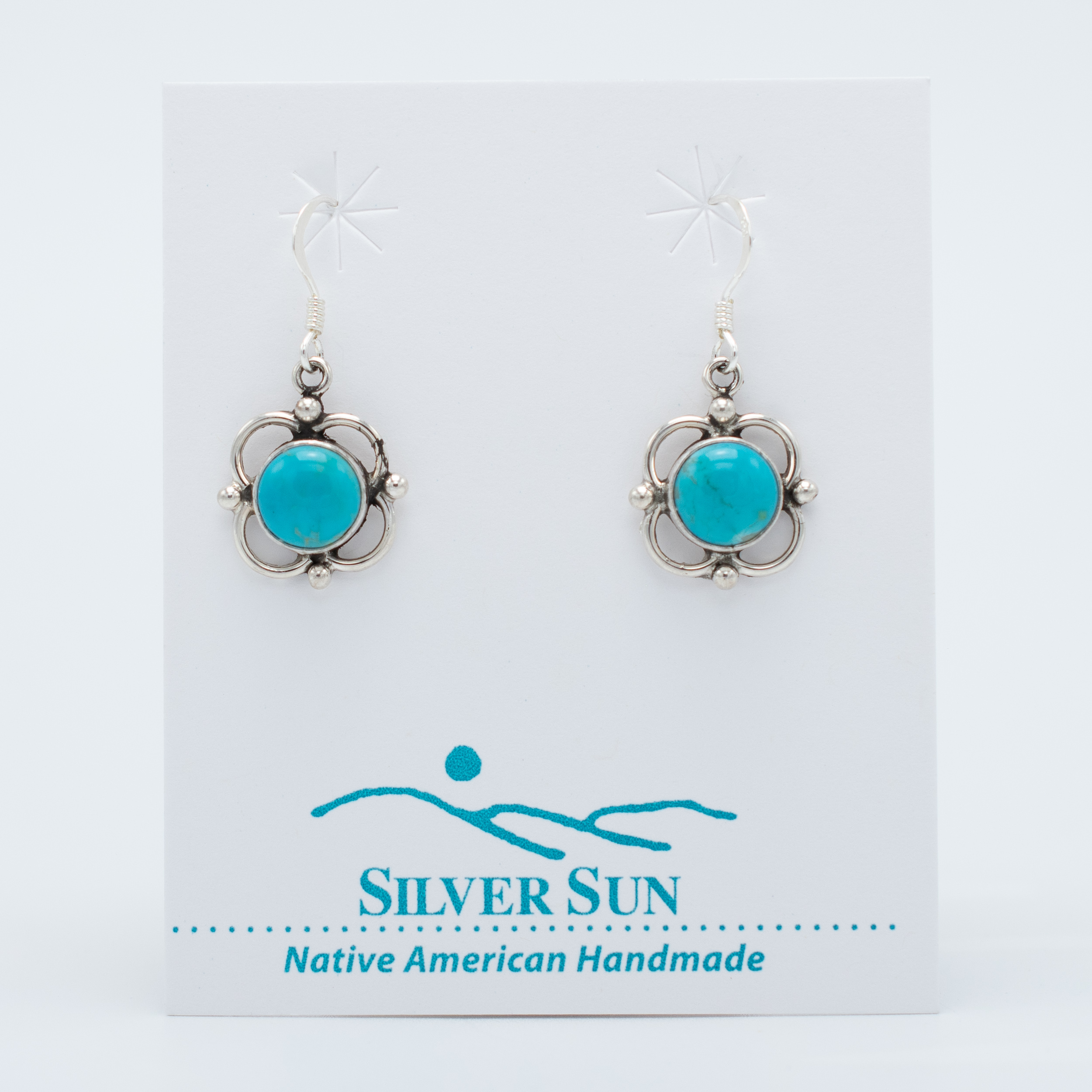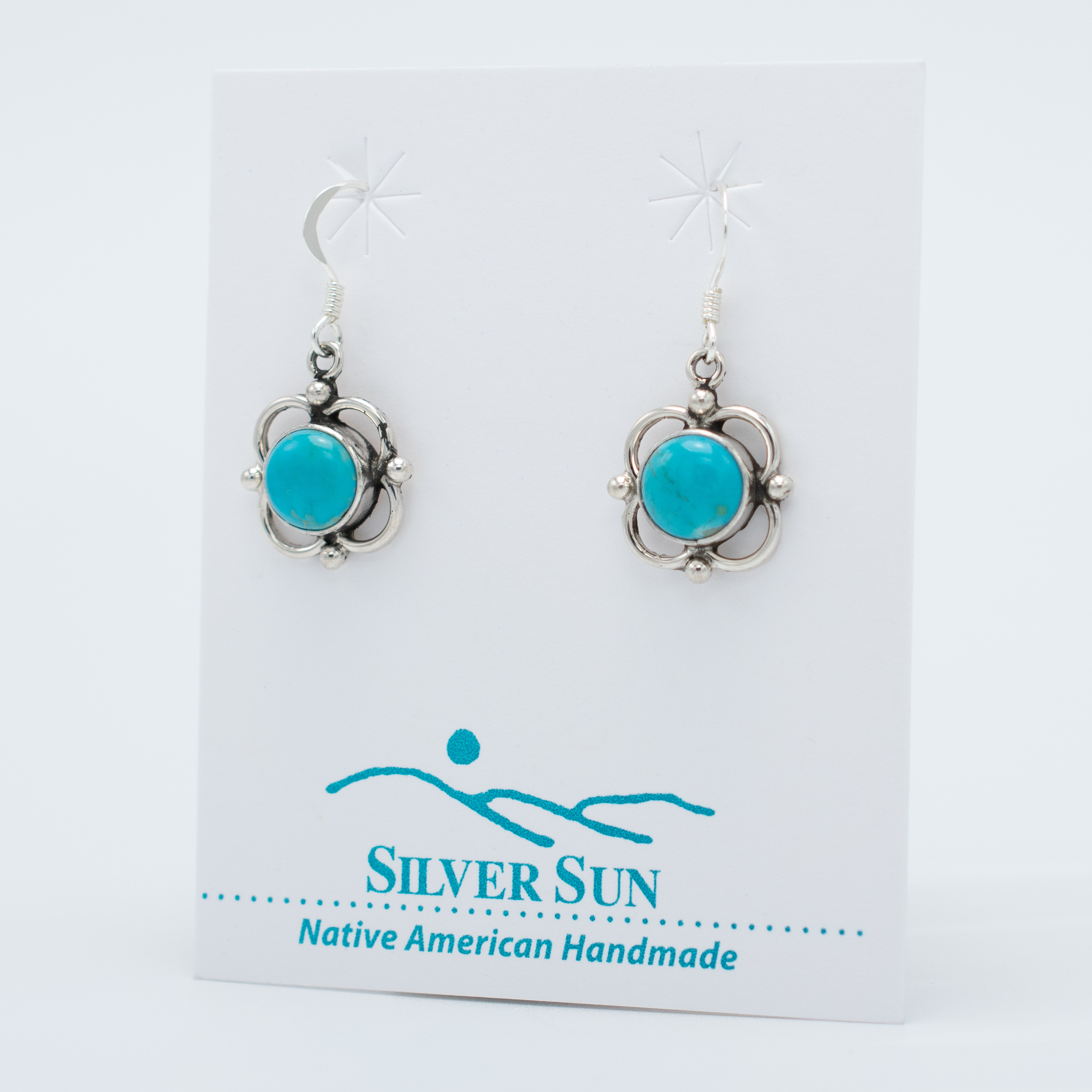 These stabilized Kingman Turquoise Butterfly Earrings by Ruth Ann Begay, Navajo, are adorned with captivating sky blue turquoise, evoking the serene beauty of the heavens. Ruth Ann Begay’s masterful silver wirework forms delicate butterfly wings, gracefully encircling the round cabochon at the center of each earring. With meticulous attention to detail, these earrings capture the essence of nature’s grace and elegance.