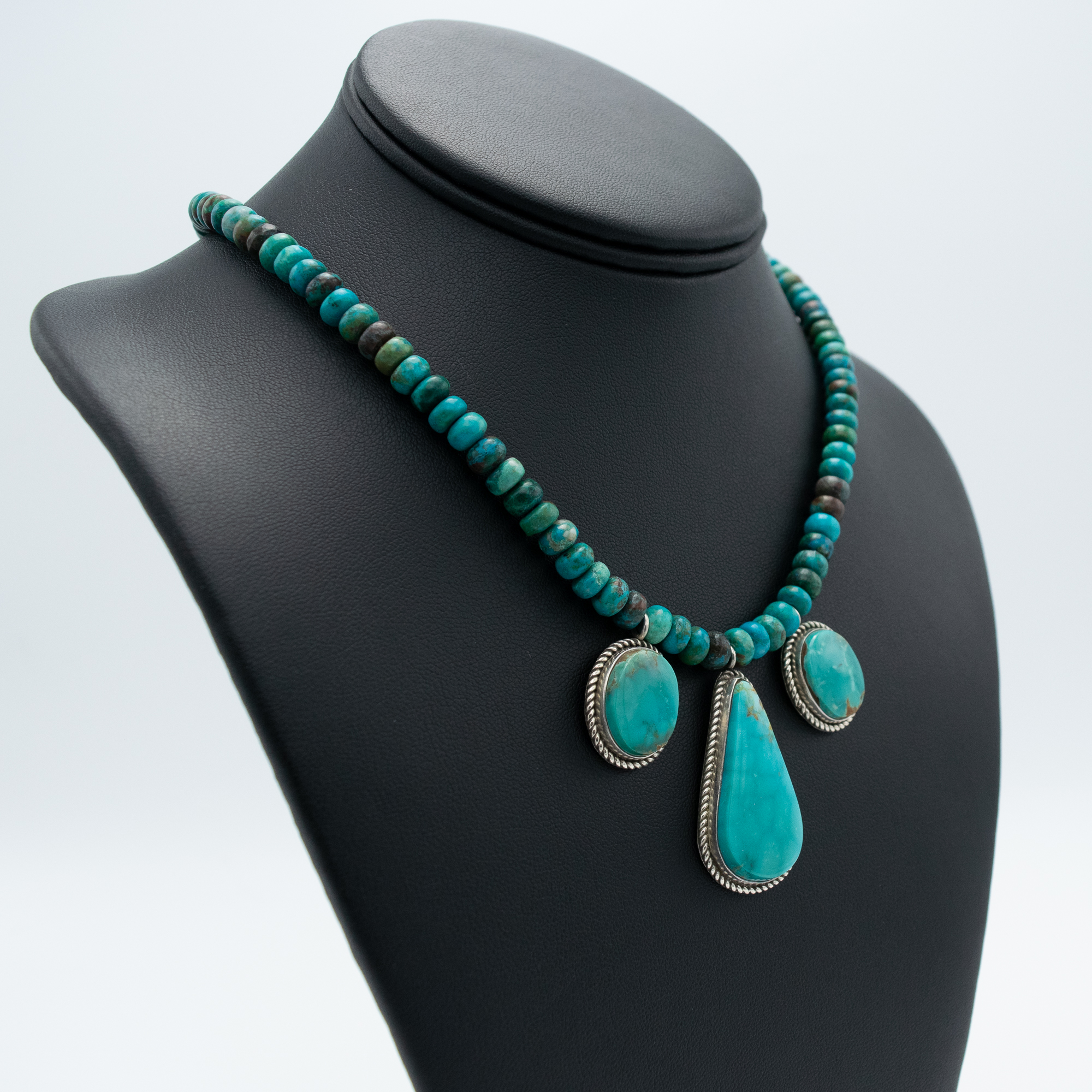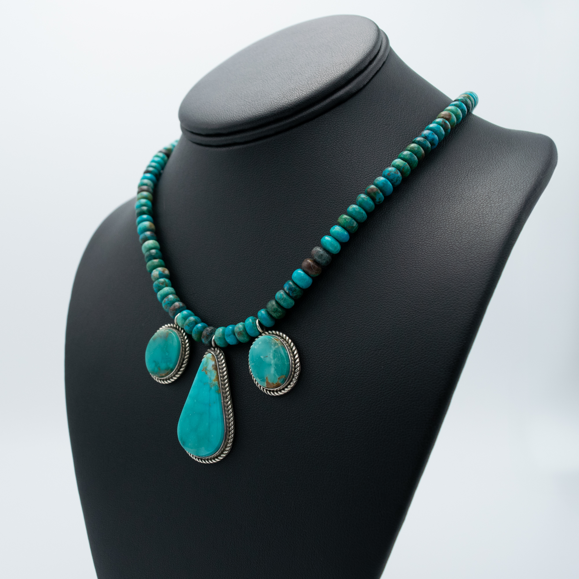 This striking necklace features three stunning Kingman turquoise stones set in sterling silver, elegantly strung on rich chrysocolla beads. Handcrafted by Navajo artist Bryant Martinez, this piece showcases the natural beauty of turquoise with its vivid blues and intricate matrix patterns. The sterling silver settings add a classic touch, making this necklace a statement of timeless craftsmanship and Southwest charm.