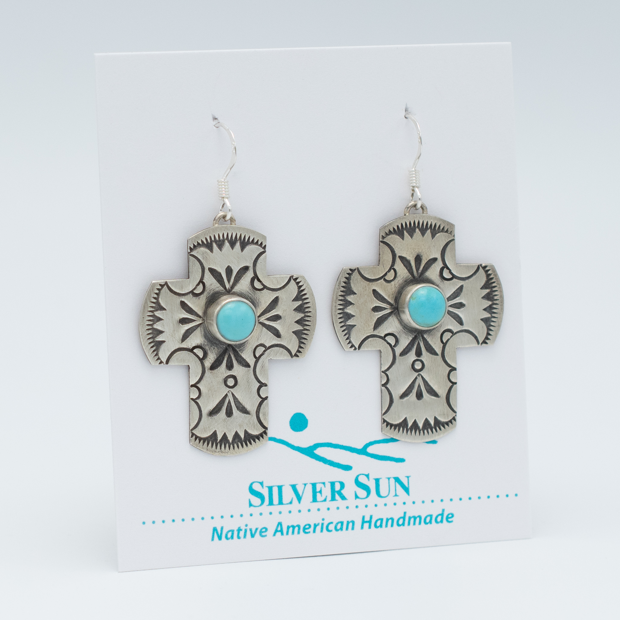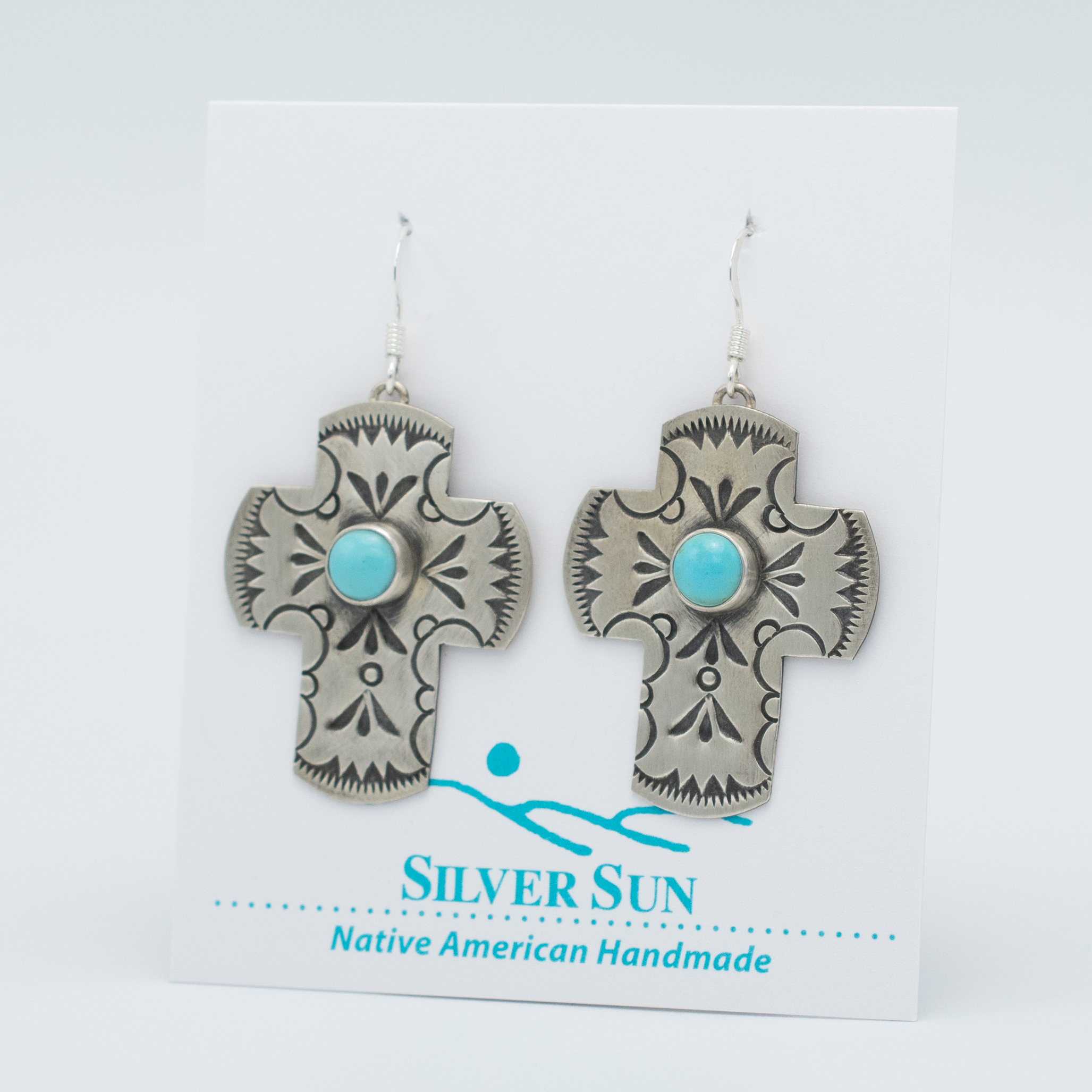These stabilized Kingman Turquoise stamped Cross Earrings were meticulously crafted by the talented hands of Bryant Martinez, Navajo. They embody the essence of tradition with their intricate stamp work, showcasing the rich heritage of Navajo craftsmanship. Each earring features a small round cab of pale blue turquoise delicately set within a larger silver cross, creating a harmonious balance of color and form.