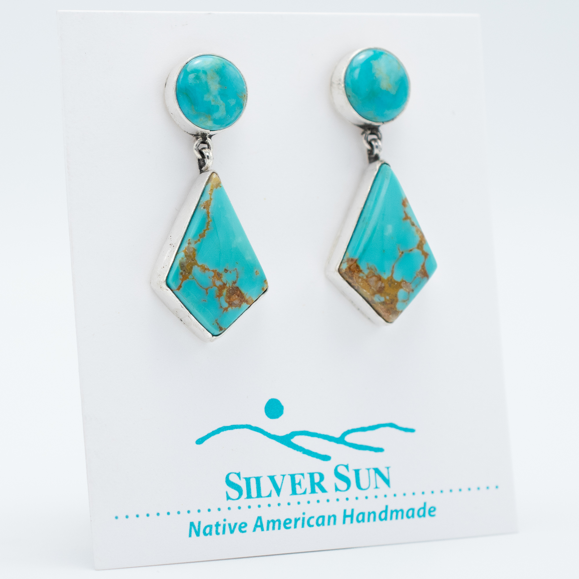 These Stabilized Kingman Turquoise Earrings by Navajo artist Ruth Ann Begay feature round studs with elegant kite shaped dangles. The bright turquoise stones are framed in sterling silver and highlighted by golden matrix patterns that add natural warmth and character. A bold and stylish design perfect for making a statement.