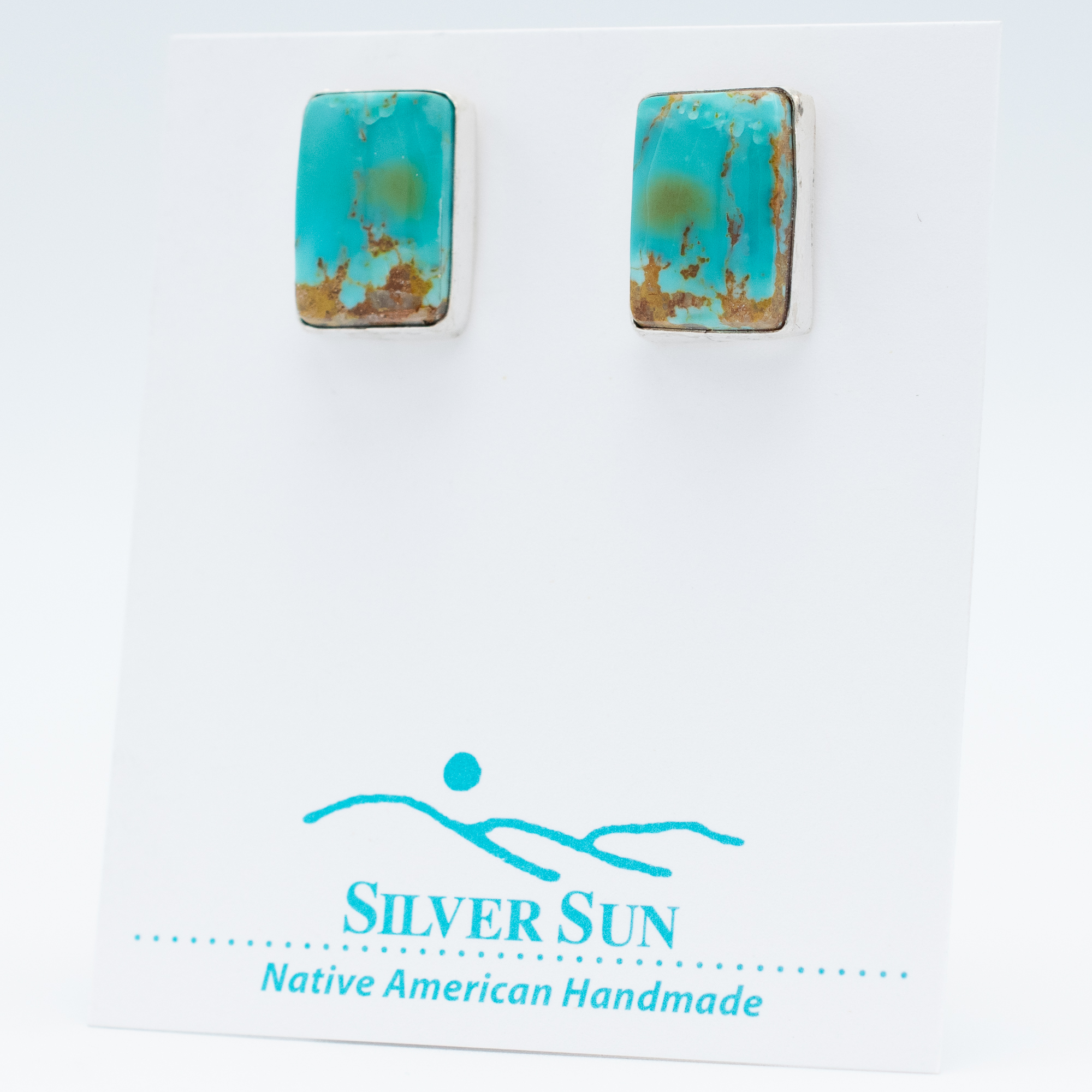 These Stabilized Kingman Turquoise Earrings by Navajo artist Ruth Ann Begay feature striking rectangular stones set in sleek sterling silver bezels. The vibrant turquoise is accented with rich golden matrix patterns that bring a natural, earthy depth to the design. A bold yet timeless pair perfect for everyday wear or dressing up.
