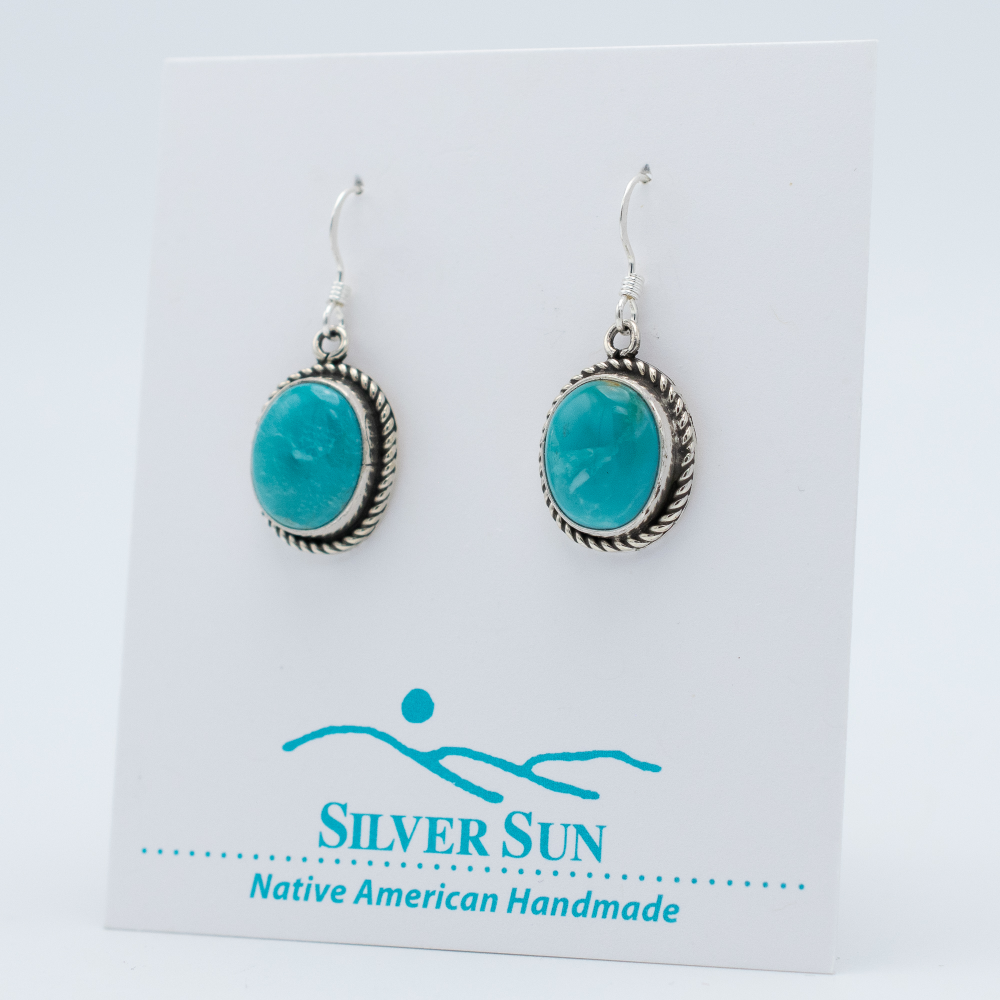 These classic drop earrings by Navajo artist Ruth Ann Begay feature bright stabilized Kingman turquoise set in sterling silver rope bezels. The vivid blue stones are smoothly polished and framed by traditional twisted wire, creating a clean and timeless Southwestern look. Lightweight and versatile, they add an easy pop of color that pairs well with both casual and dressy outfits.