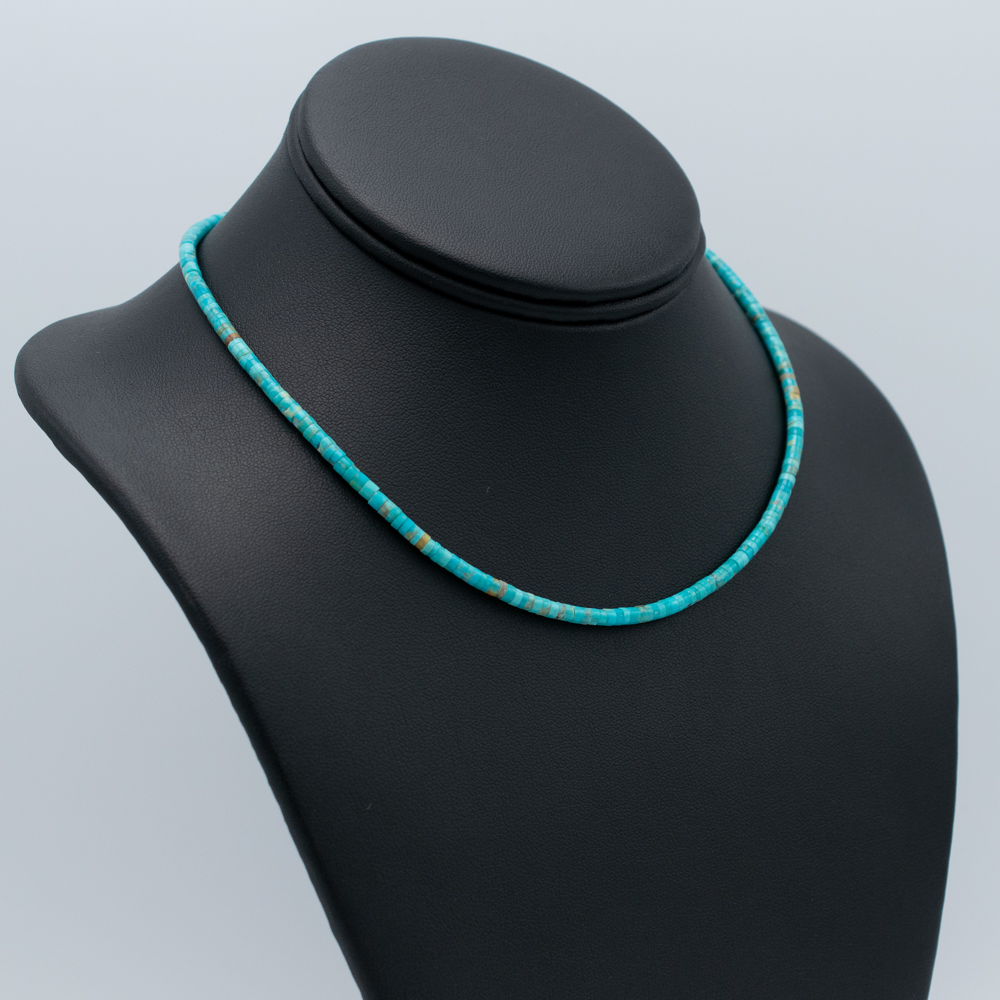 Crafted with tradition and skill, this Stabilized Kingman Turquoise Heishi Necklace by Marvin Lovato of Santo Domingo Pueblo brings an effortless touch of elegance. The smooth, hand-shaped beads display the signature sky-blue hue of Kingman turquoise, complemented by subtle earthy matrix patterns. Perfect for layering or wearing solo, this timeless piece offers a sleek and minimal design with deep cultural significance.