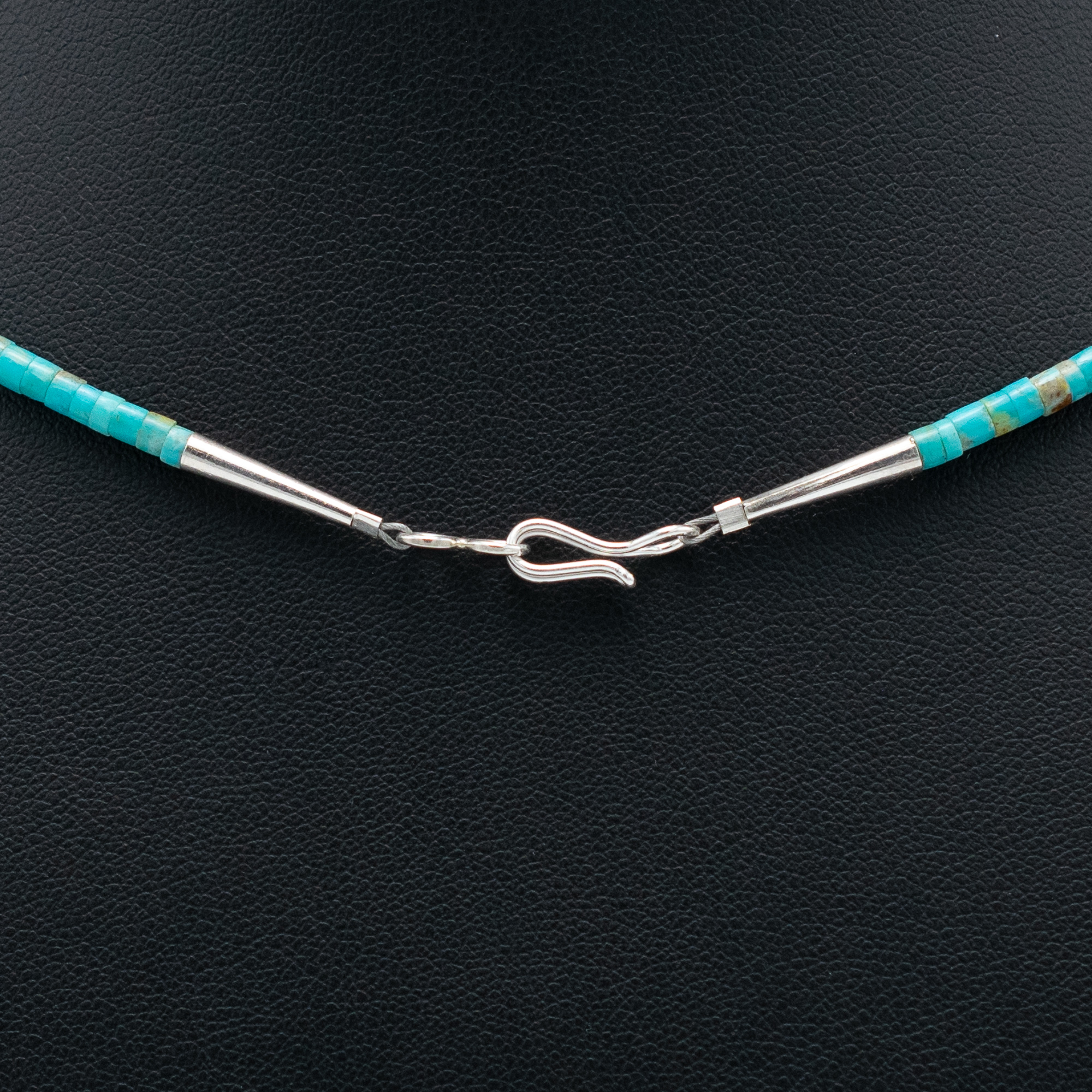 A timeless classic, this Stabilized Kingman Turquoise Heishi Necklace by Marvin Lovato of Santo Domingo Pueblo embodies understated elegance. The finely cut 3mm heishi beads are expertly strung, showcasing the serene blues of Kingman turquoise with delicate hints of earthy matrix. Smooth, lightweight, and versatile, this necklace is perfect for layering or wearing on its own as a refined statement piece.