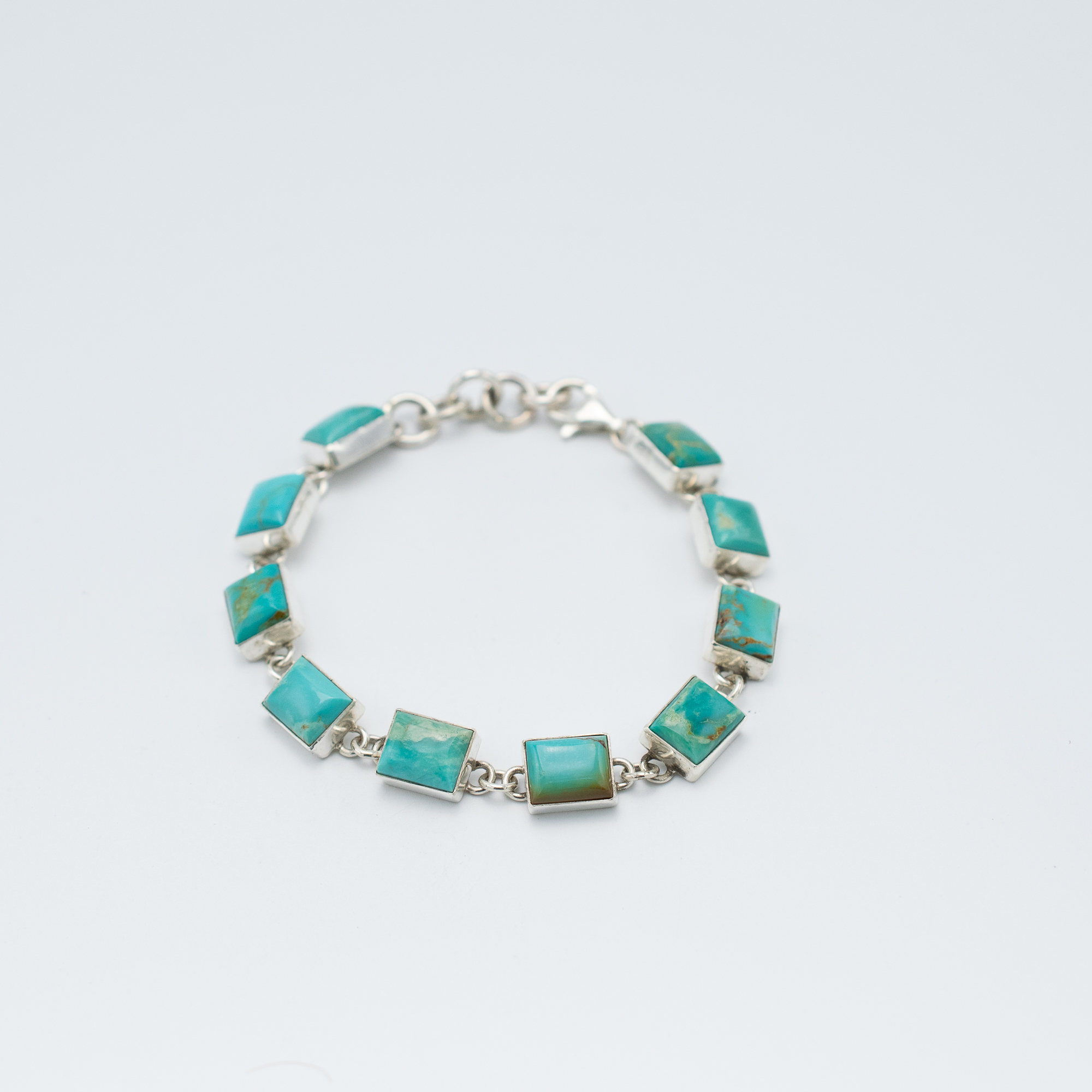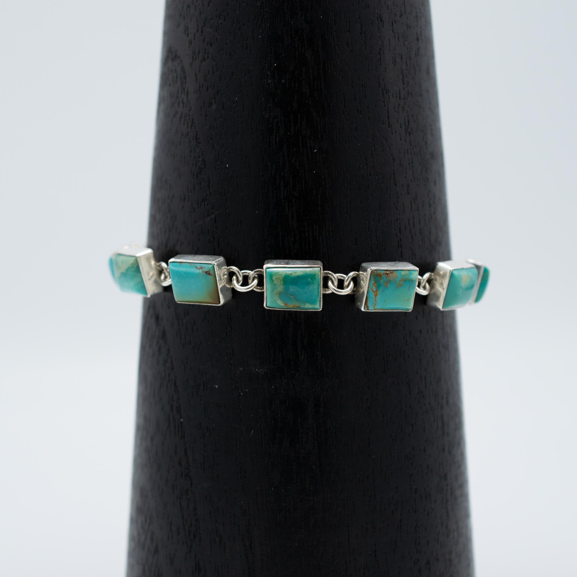 This Stabilized Kingman Turquoise Link Bracelet by Navajo artist Bryant Martinez features a striking sequence of square-cut turquoise stones, each set in a smooth sterling silver bezel. The turquoise displays a vibrant mix of blues and greens with natural matrix patterns that make each link one of a kind. Carefully handcrafted and connected by silver jump rings, the design offers a classic silhouette with a touch of contemporary elegance. A beautiful addition to any collection, this bracelet captures the timeless appeal of Southwestern jewelry.