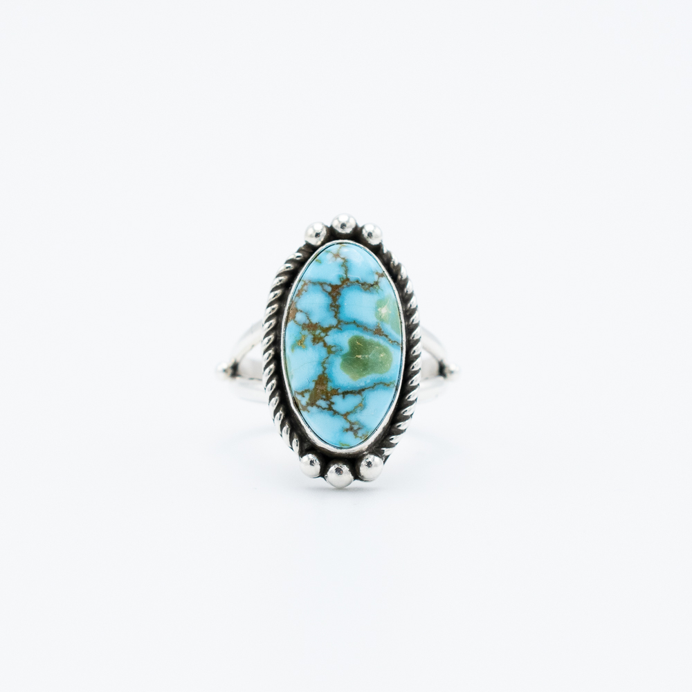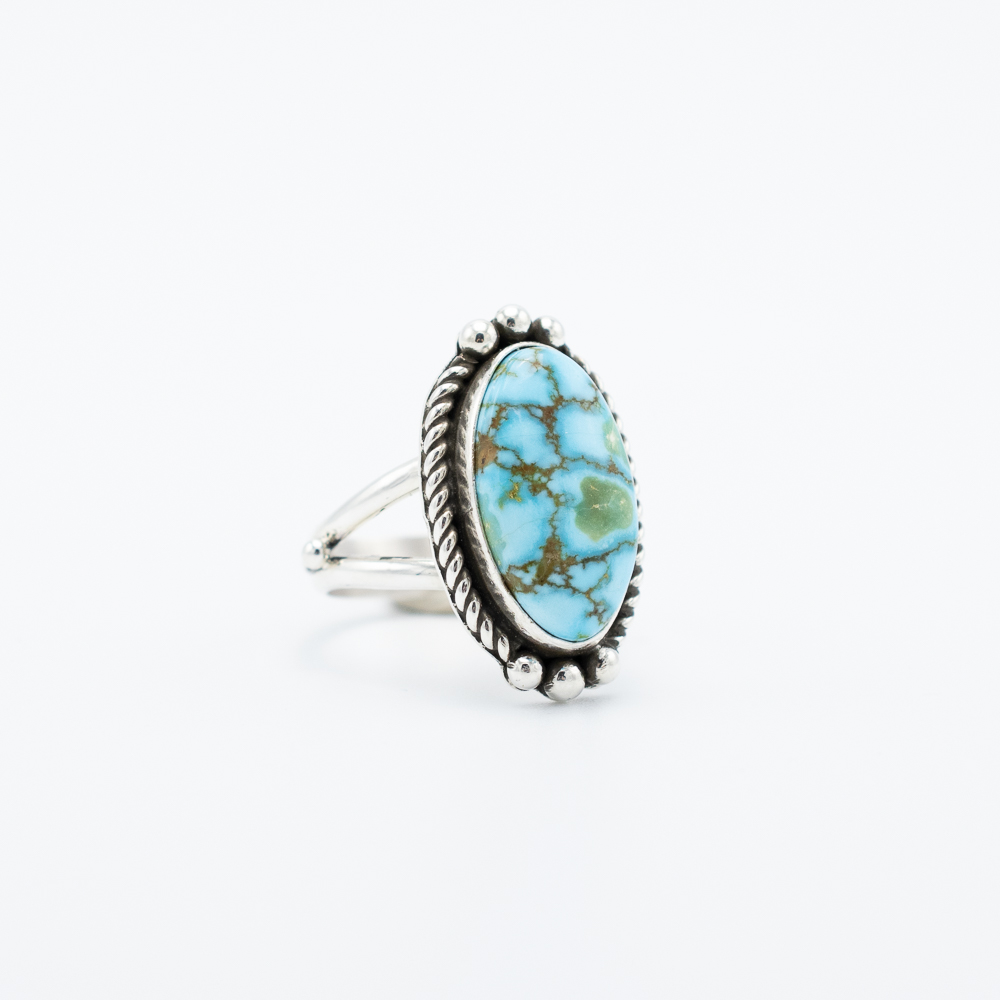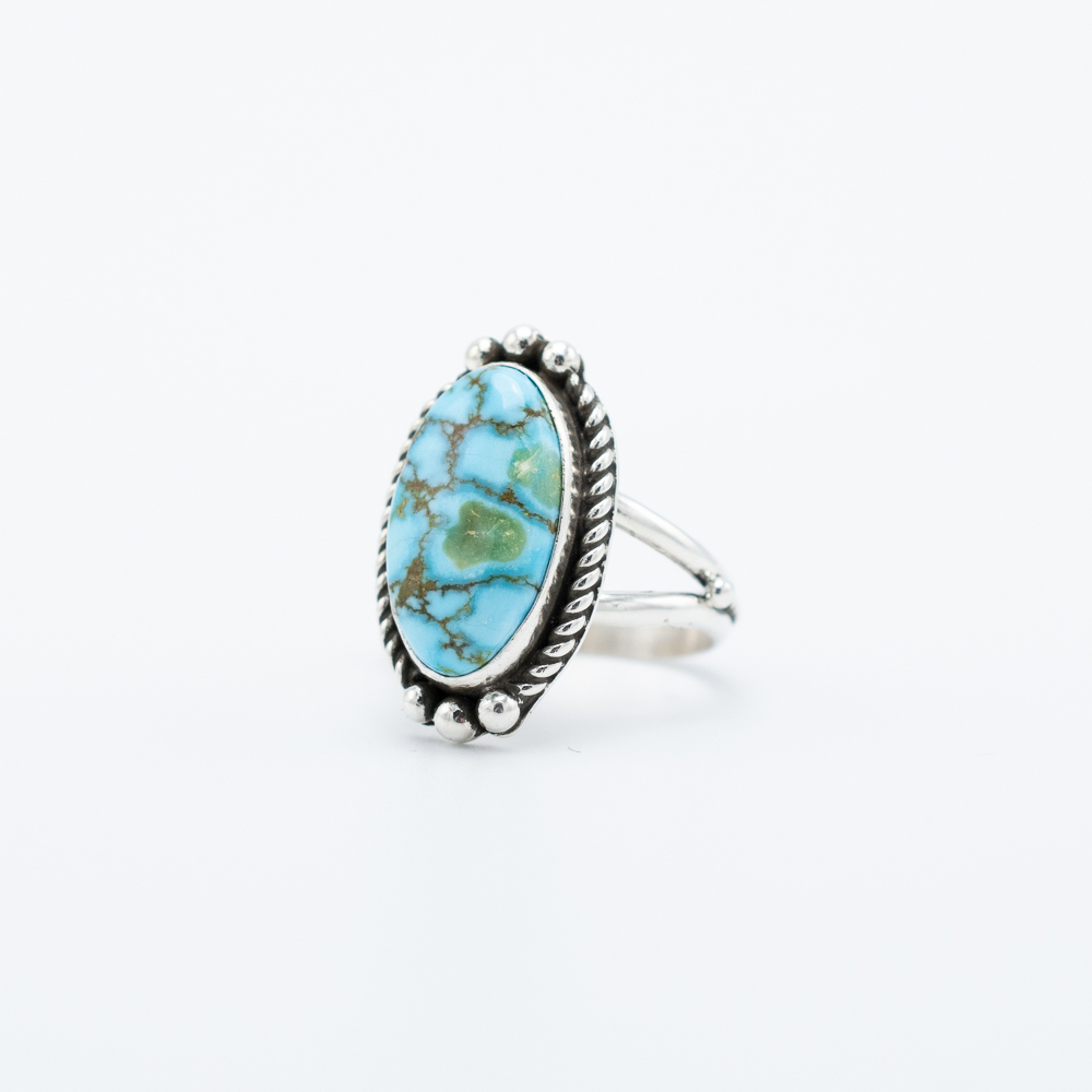 This Enhanced Kingman Turquoise Ring by Navajo artist Ruth Ann Begay exudes timeless elegance. Featuring an elongated oval turquoise stone with a vibrant matrix, the piece is set in a sterling silver bezel accented by twisted rope details and polished beads. The split shank design adds a contemporary touch, creating a stunning combination of traditional craftsmanship and modern style. This ring is a statement piece that celebrates the beauty of Navajo artistry. Perfect for elevating any jewelry collection.