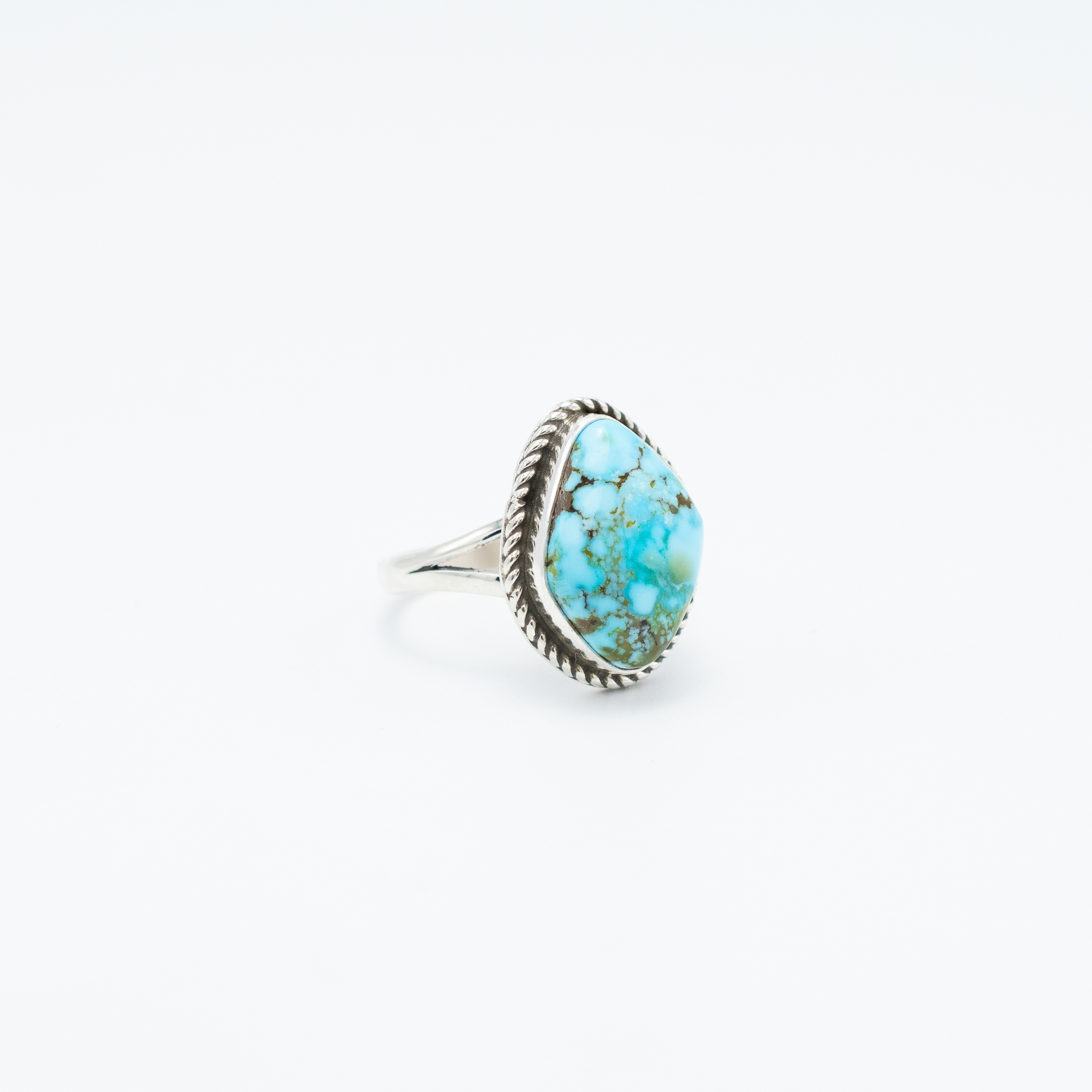 This Enhanced Kingman Turquoise Ring by Navajo artist Ruth Ann Begay showcases a striking, high-polish turquoise stone with a beautiful mix of sky-blue hues and golden-brown matrix. Set in sterling silver, the stone is framed with a delicate twisted wire border, adding depth and texture to the design. Handcrafted with care, this piece blends traditional Navajo silversmithing with timeless Southwestern style, making it an elegant and versatile addition to any jewelry collection.