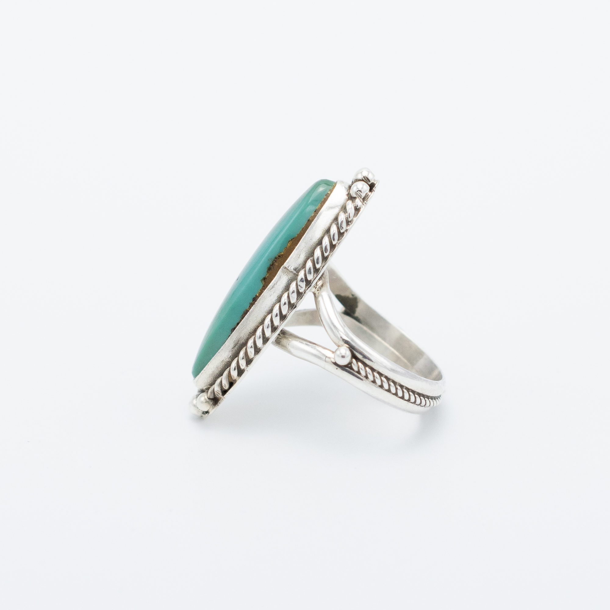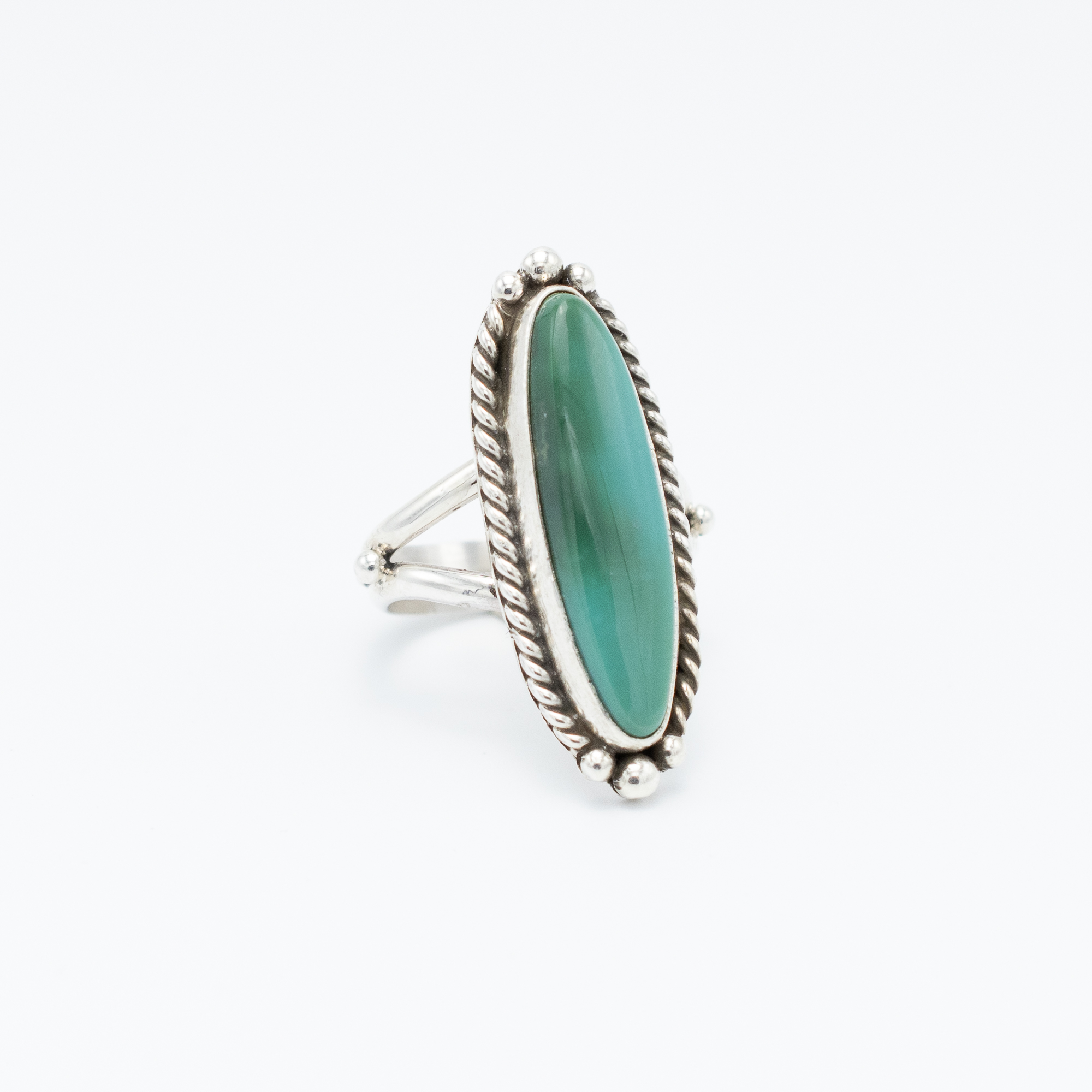 This Kingman Turquoise Ring features a sleek elongated stone set in sterling silver. The tranquil hues of the turquoise are enhanced by a finely detailed setting, making it an elegant statement piece. Designed by Navajo artist Ruth Ann Begay, this handcrafted ring beautifully reflects her skilled craftsmanship and timeless Southwestern style.