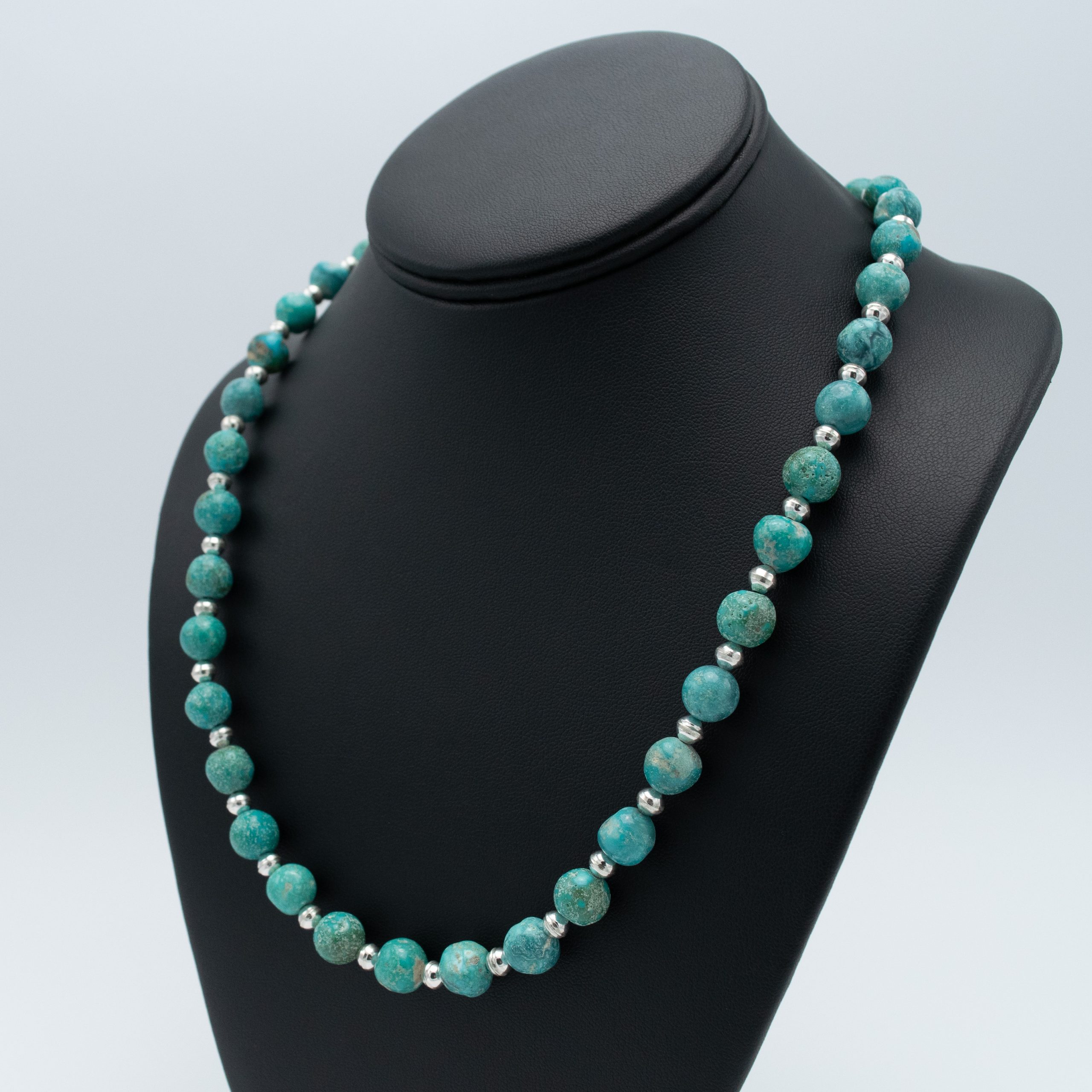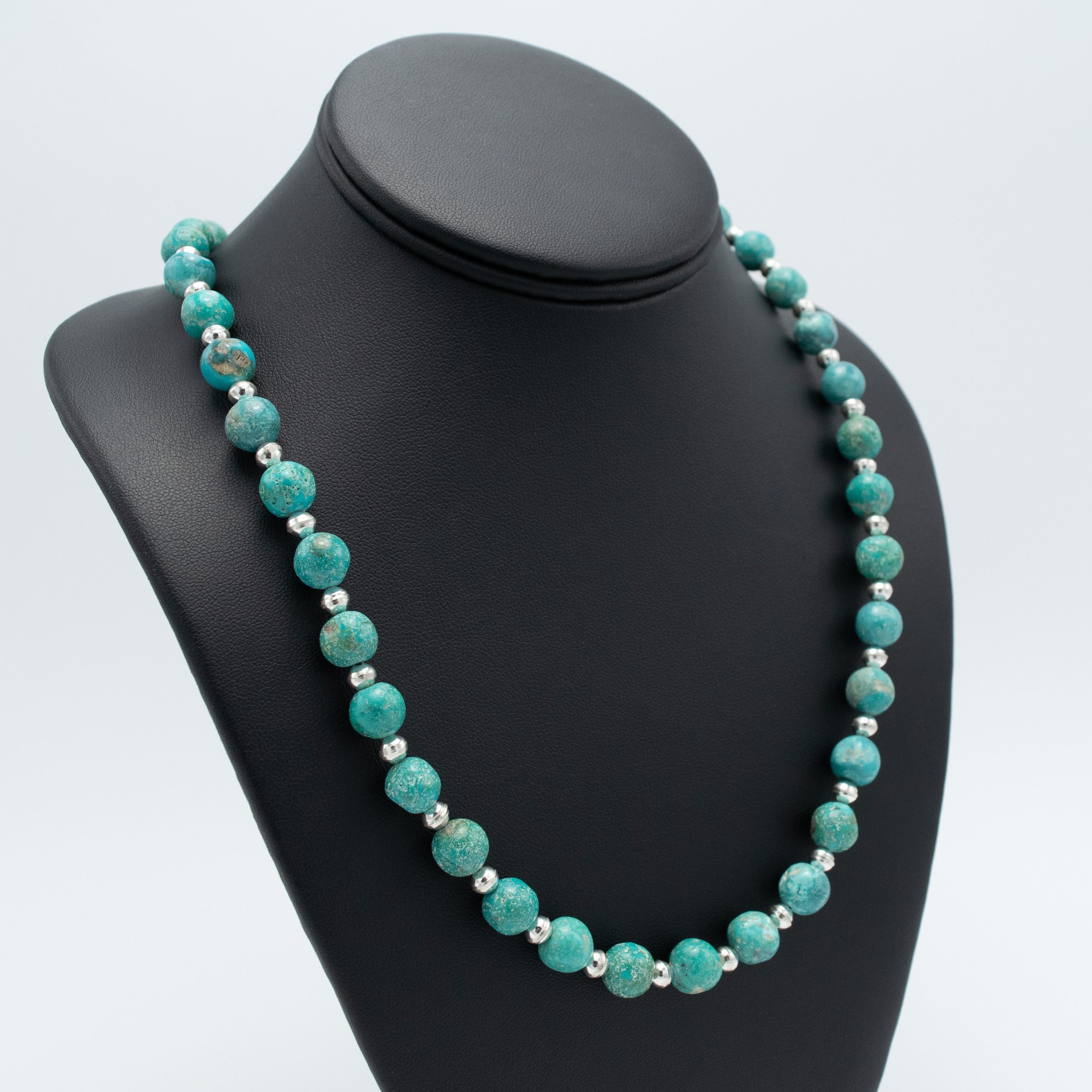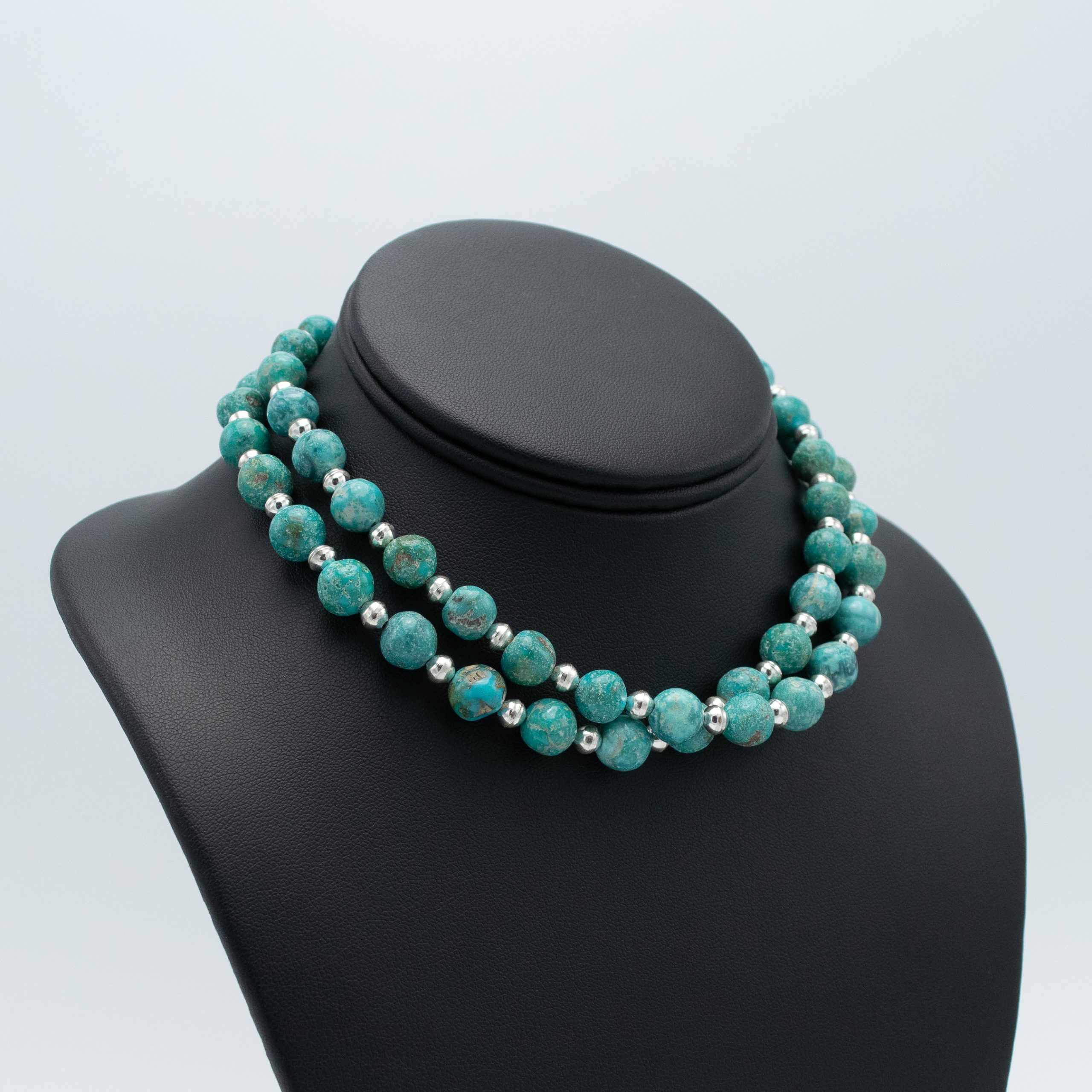 Adorn yourself with the captivating allure of Kingman Turquoise with this exquisite necklace by Kathleen Sanchez, San Felipe Pueblo. The lovely beads, accented by shiny silver beads, create a contrast that’s sure to turn heads.