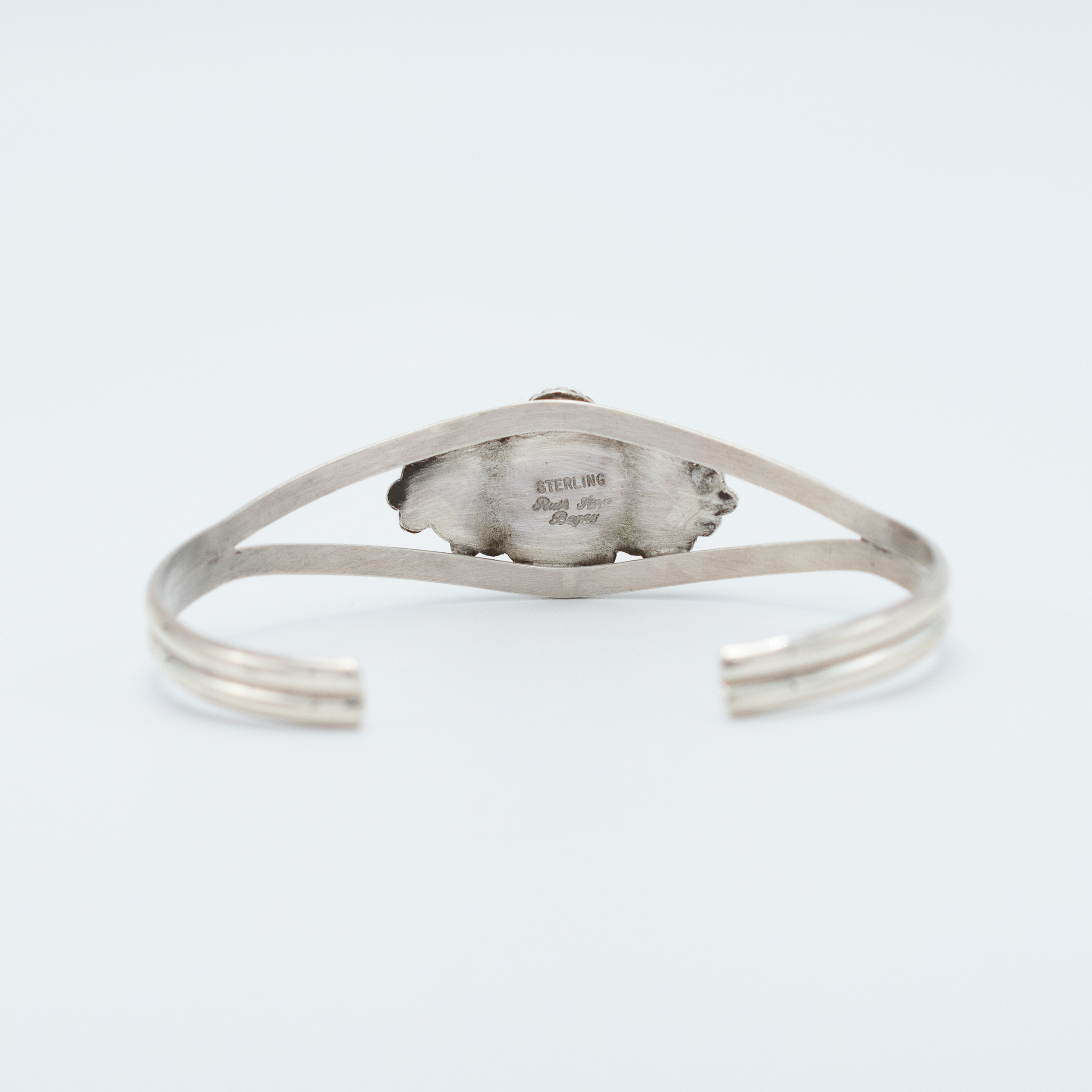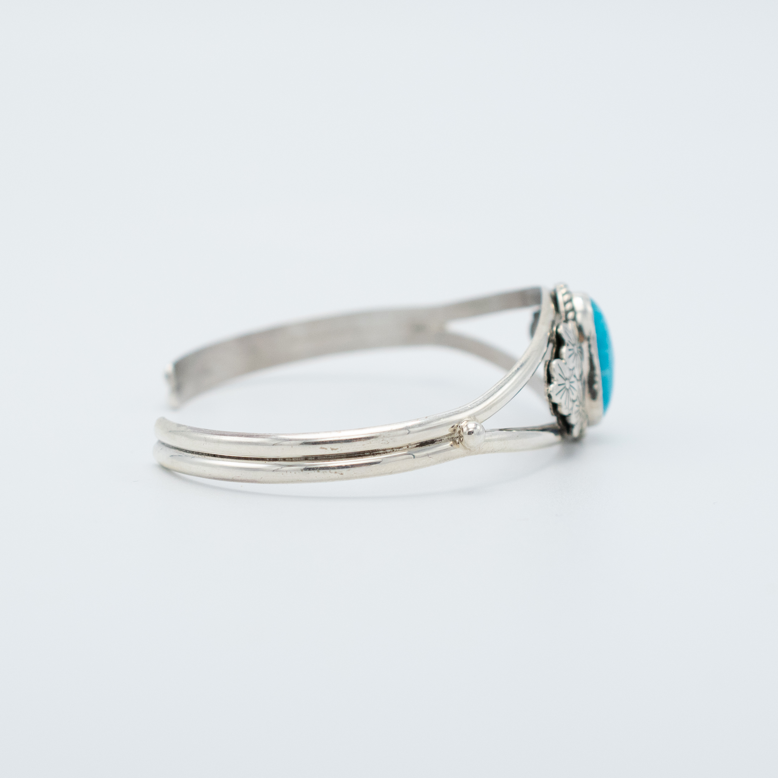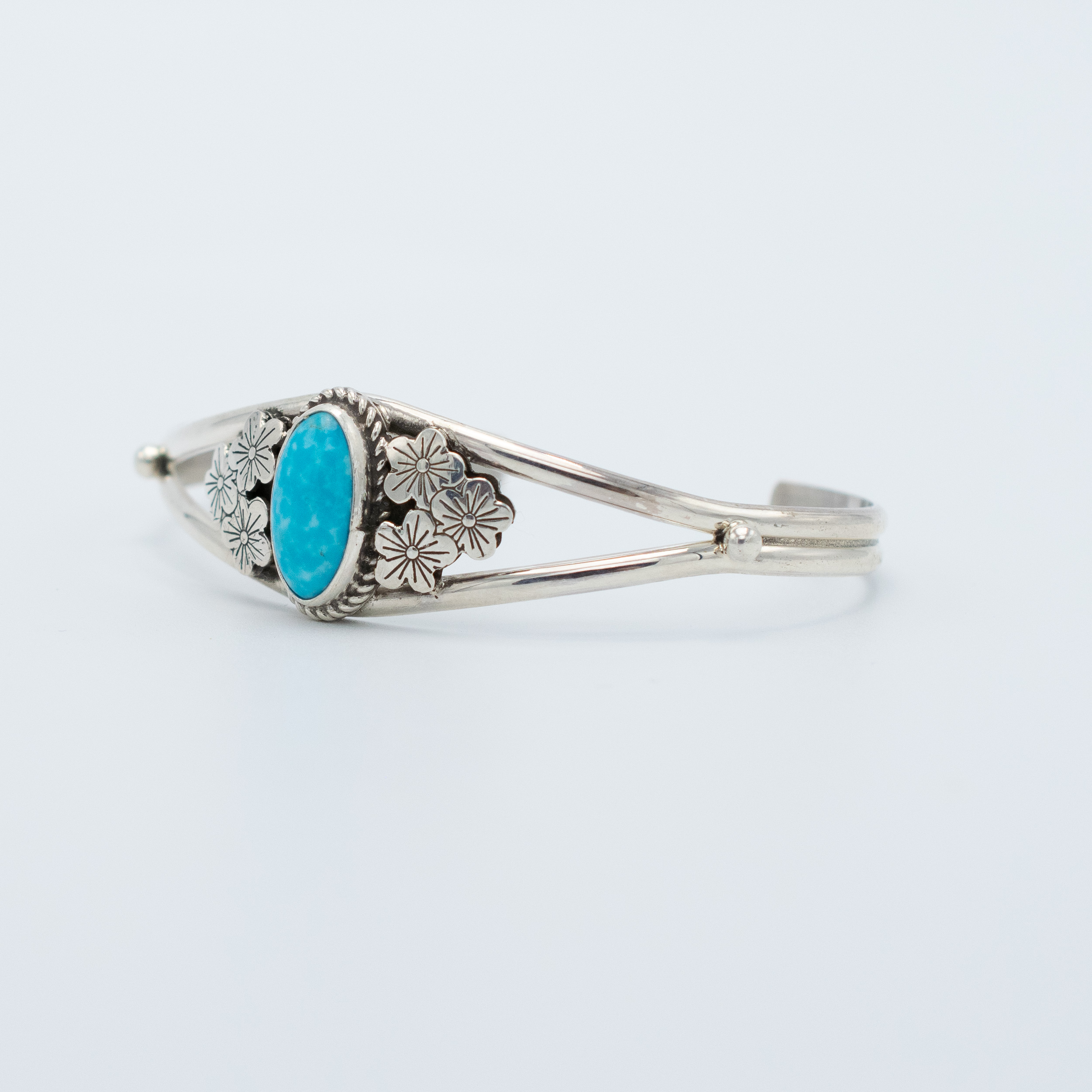 This Kingman Turquoise Stamped Flower Bracelet by Navajo artisan Ruth Ann Begay showcases a stunning turquoise stone framed by intricate twist wire silver. The centerpiece is flanked by beautifully stamped silver flowers on either side, adding a touch of floral elegance. The split shank of polished silver enhances the bracelet’s refined and sophisticated design. Handcrafted with meticulous detail, this bracelet is a perfect blend of traditional craftsmanship and contemporary style.