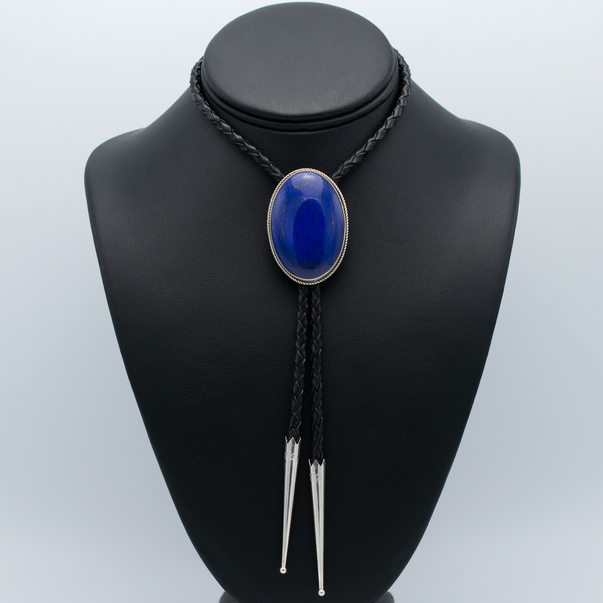 This handcrafted Lapis Bolo Tie by Navajo artist Bryant Martinez is a bold statement piece that blends Southwestern tradition with refined elegance. The deep blue lapis cabochon, flecked with hints of pyrite, is set in a smooth sterling silver bezel framed by a twisted wire border. The braided black leather cord and sterling silver tips complete the classic bolo silhouette, making it perfect for dressing up a collared shirt or adding a touch of personality to any outfit.