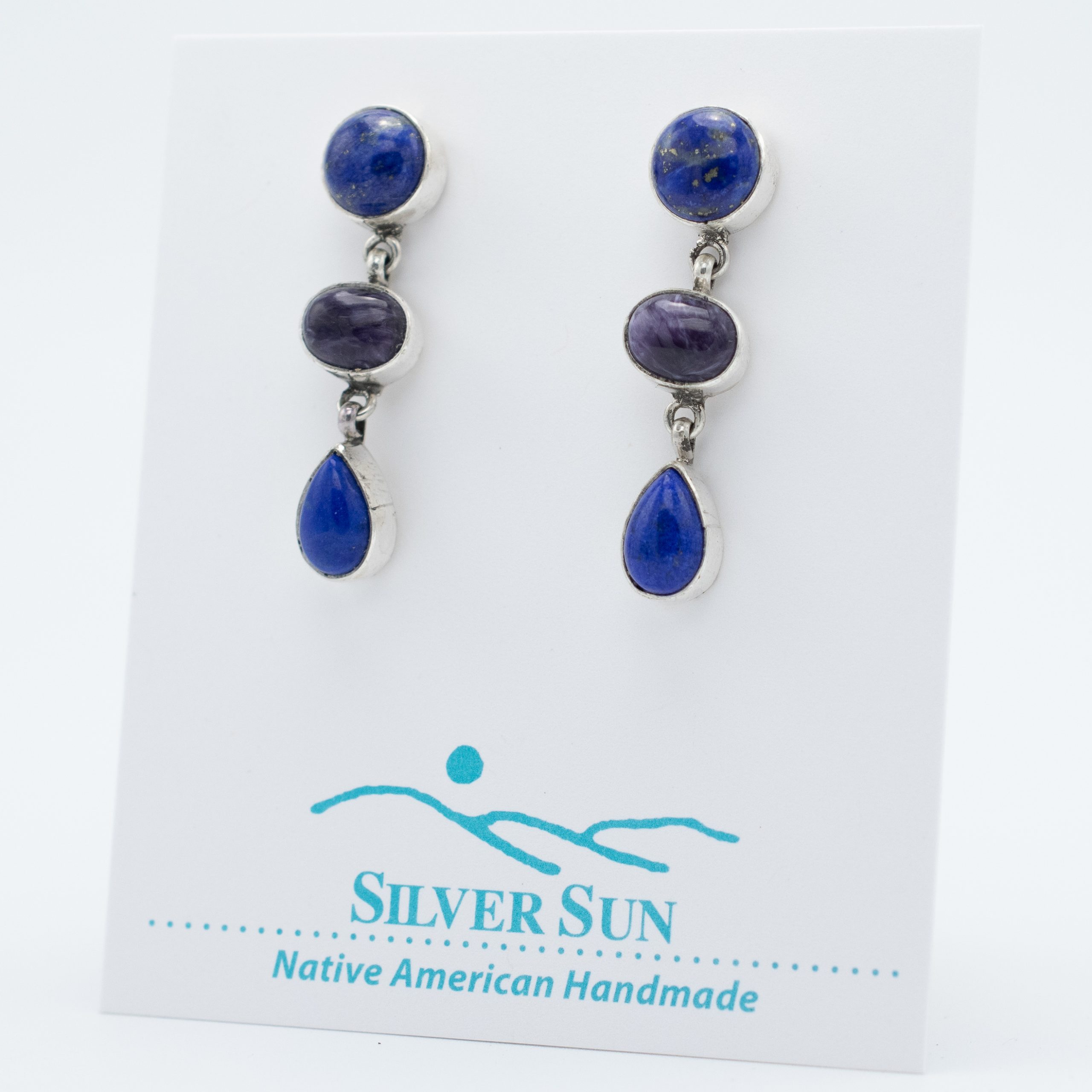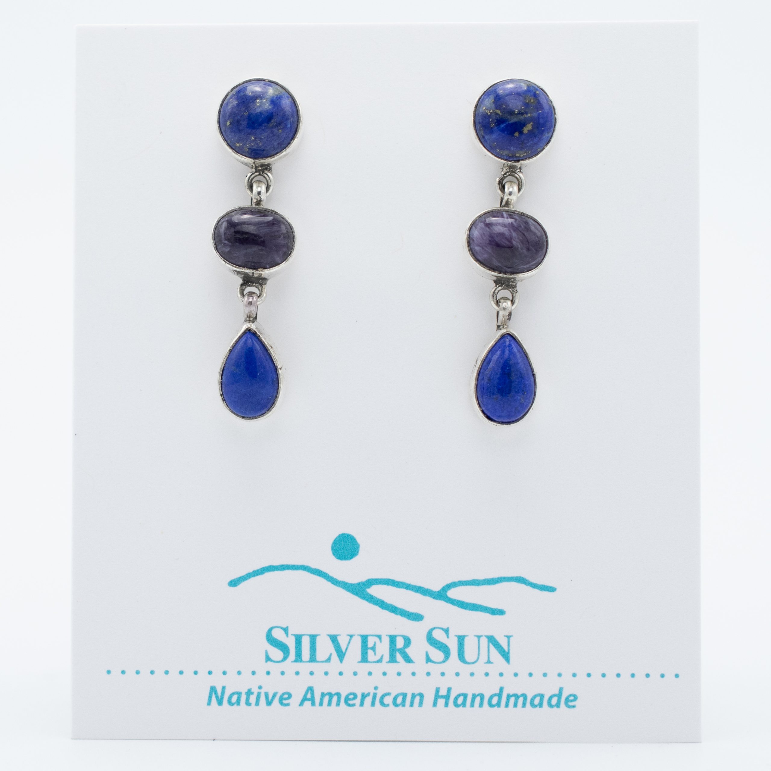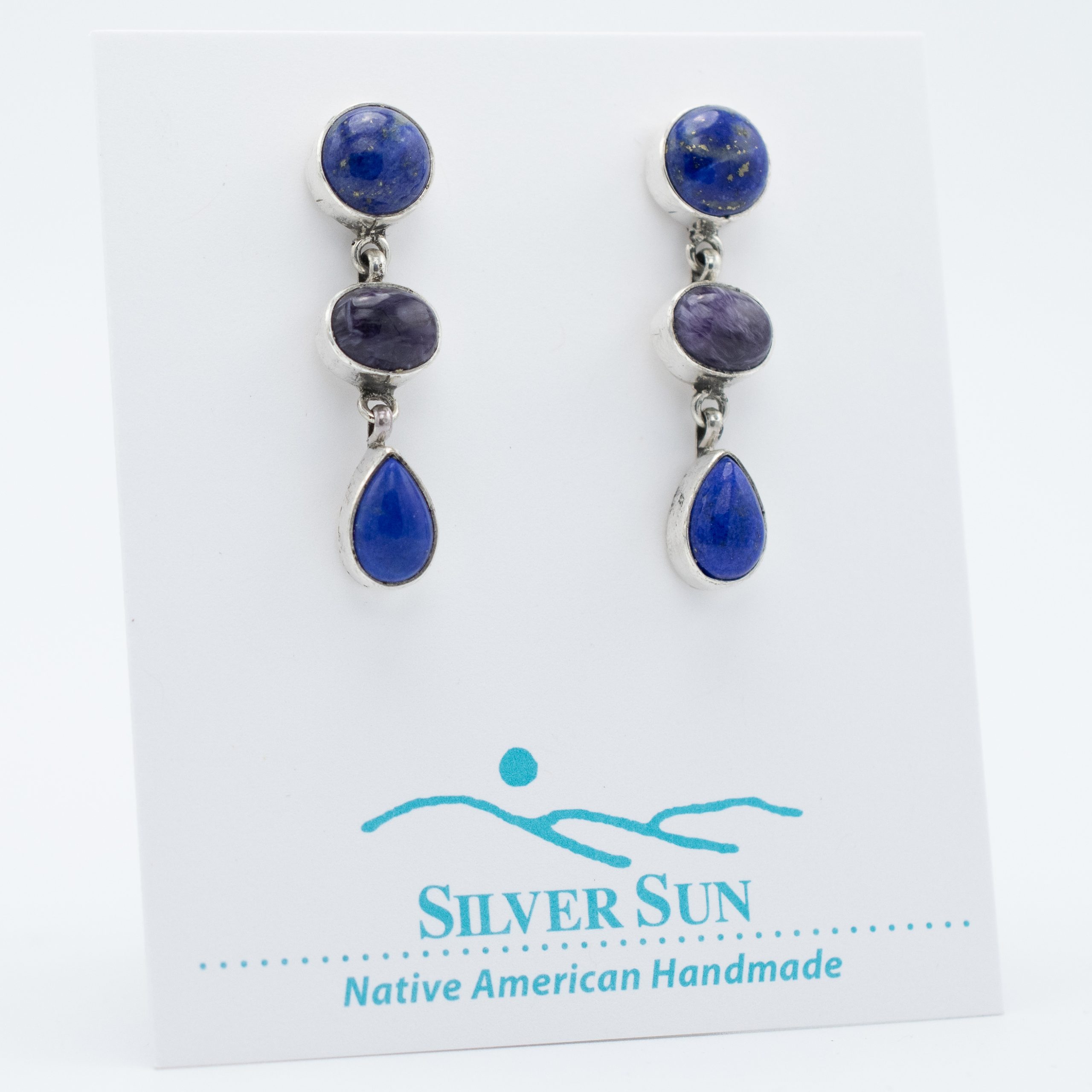 These Lapis & Charoite Earrings by Ruth Ann Begay showcase a beautifully balanced arrangement of deep blue lapis and unique purple charoite stones. Each earring features three carefully selected stones, cascading in size to create an elegant, elongated look. The vibrant lapis stones, paired with the swirling patterns of charoite, bring a sophisticated blend of color and texture, perfect for adding a touch of artistry to any outfit. Handcrafted with care, these earrings are a testament to traditional craftsmanship and modern design.