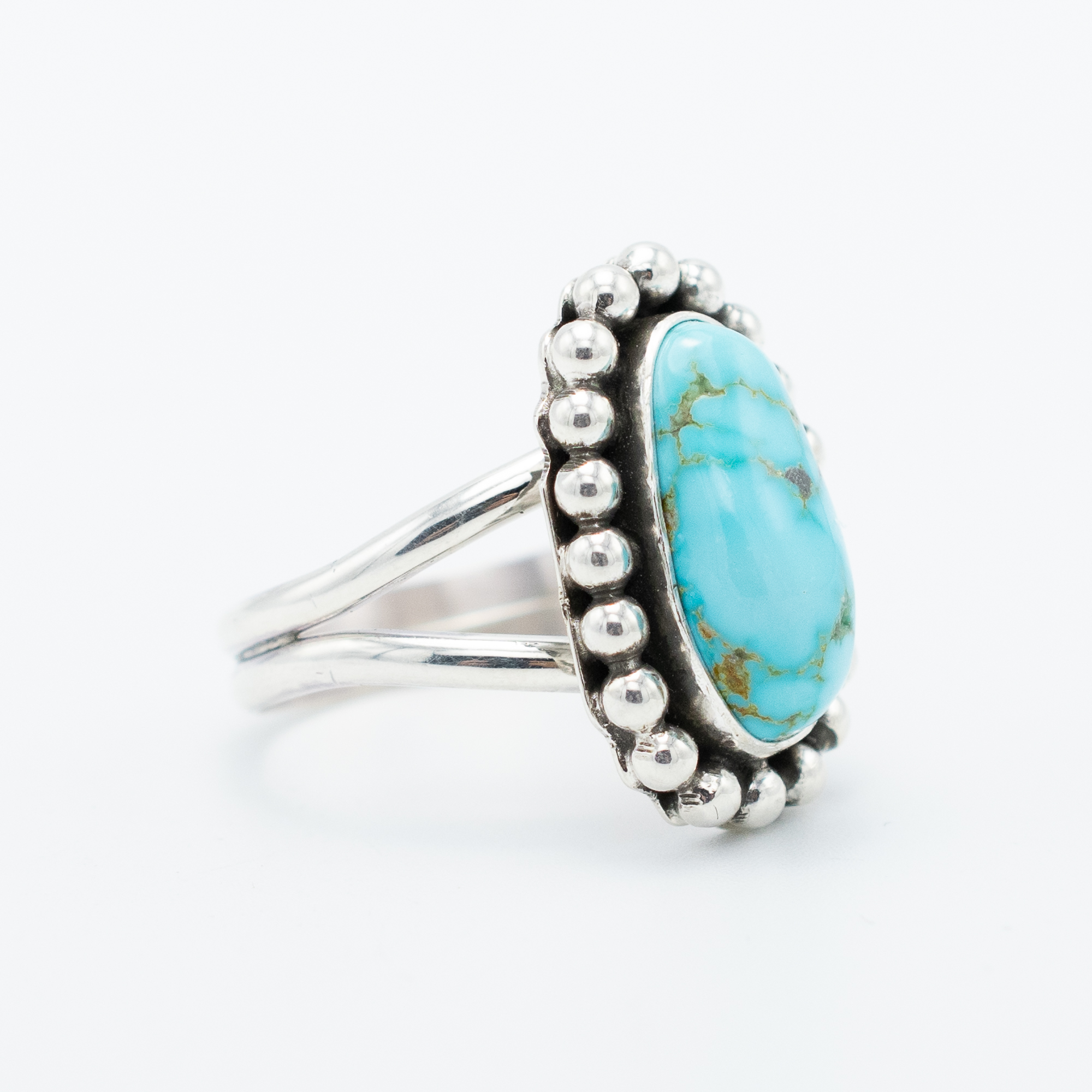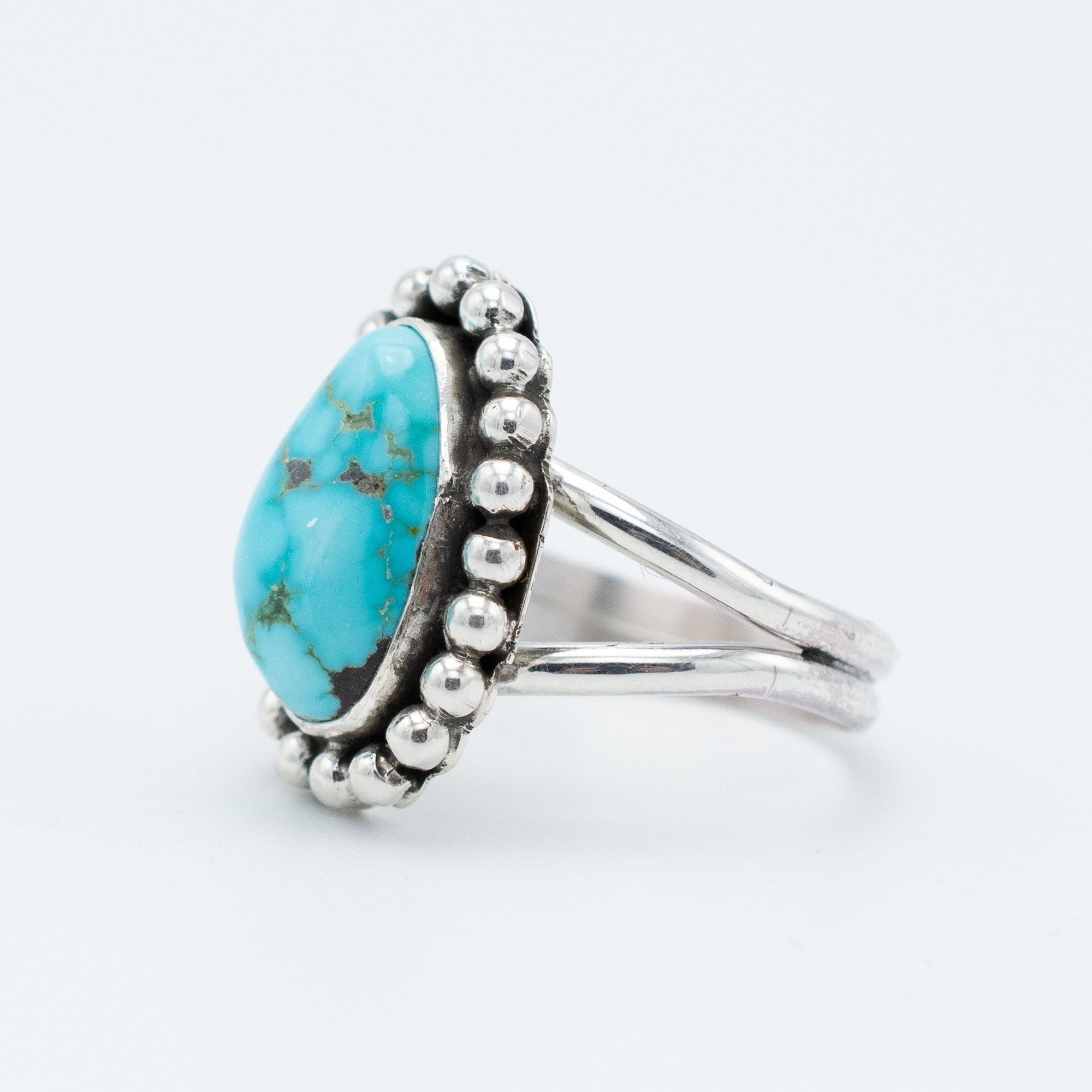 Lone Mountain turquoise is among the rarest in the American Southwest. The mine has been largely inactive for decades, and genuine stones are getting harder to find. Ruth Ann Begay set this one simply, letting that characteristic spiderweb matrix do its thing. A ring worth holding onto.