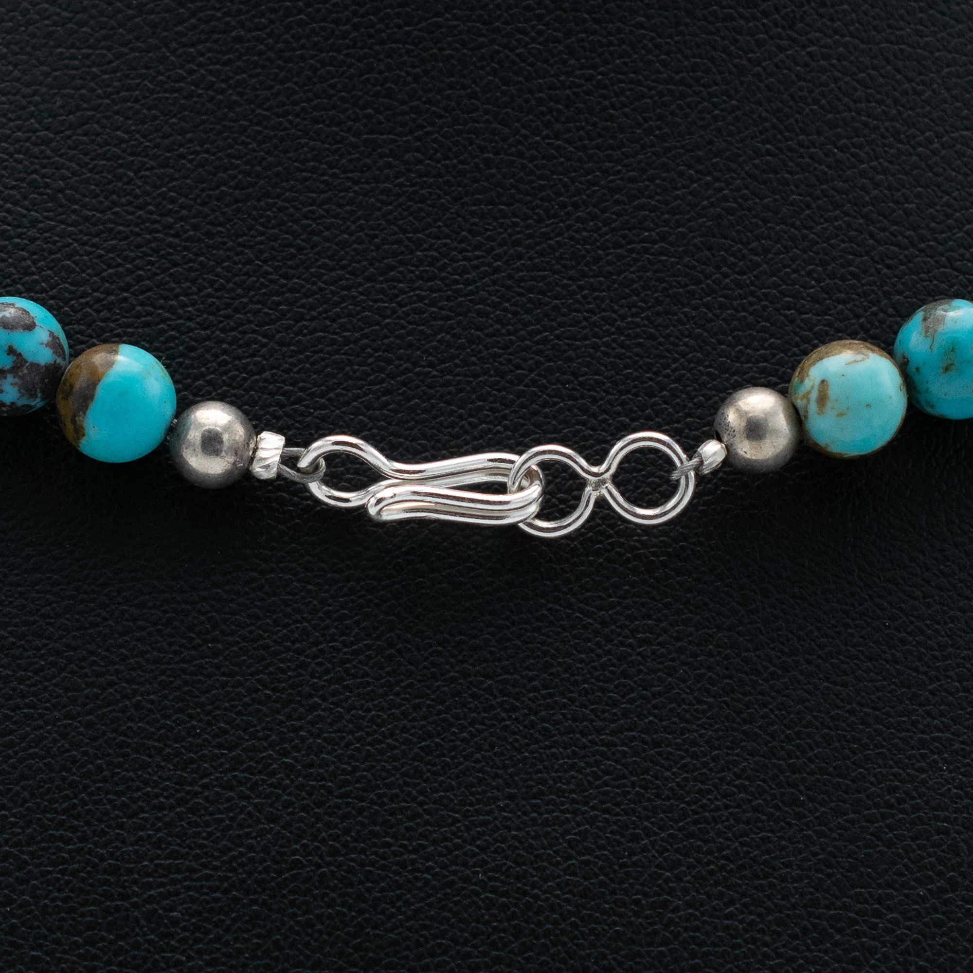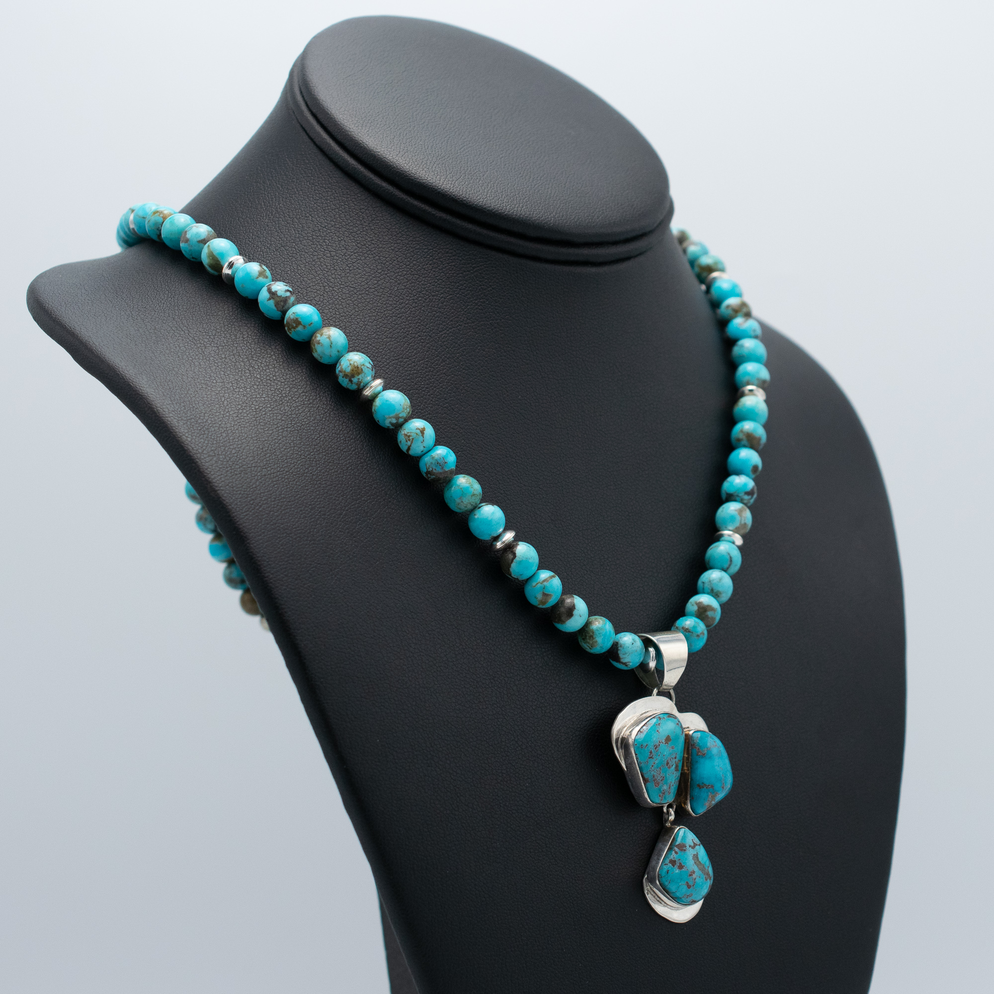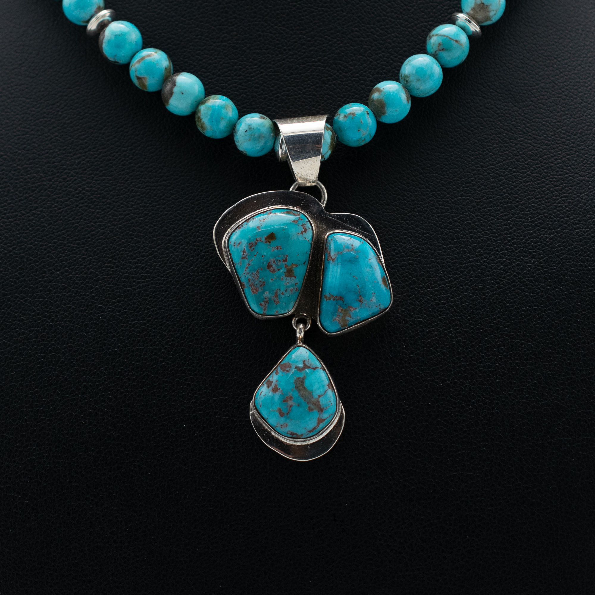 This striking necklace features a three-stone Natural Ma’anshan Turquoise Pendant set in sterling silver by Navajo artist Ruth Ann Begay. The pendant is paired with a strand of stabilized Kingman turquoise beads, creating a vibrant yet balanced combination of turquoise hues. Each element is handcrafted with care, celebrating the beauty of natural stone and traditional Native American design.