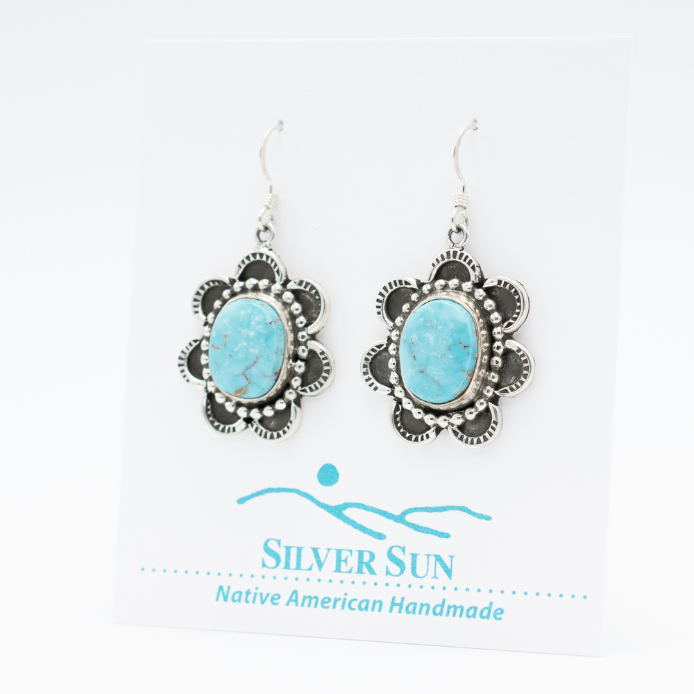 These Ma’Anshan Turquoise Dangle Earrings by Navajo artist Ruth Ann Begay bring the perfect blend of elegance and traditional craftsmanship. Featuring natural Ma’Anshan turquoise in a striking floral design, each oval stone is framed with intricate sterling silver detailing. These earrings capture timeless beauty, making them a versatile addition to your collection.