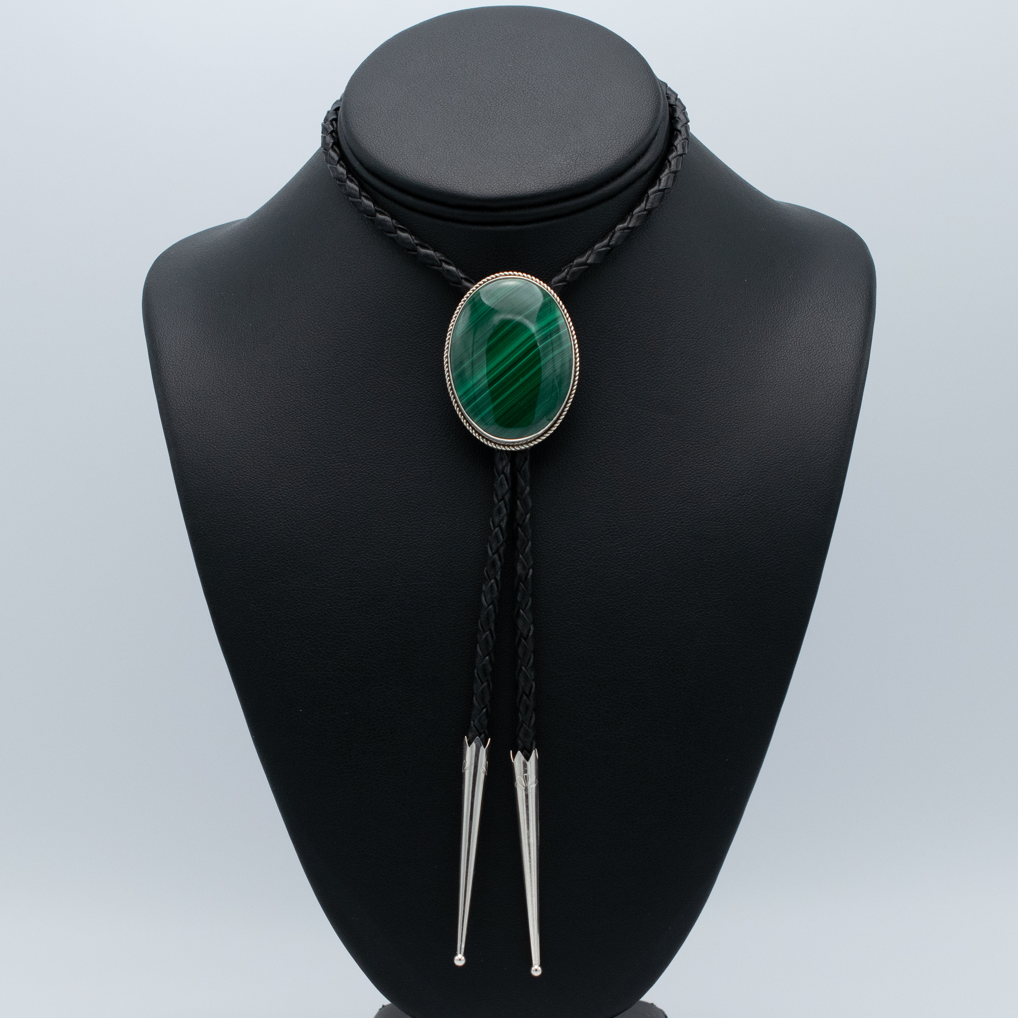 This Malachite Bolo Tie by Navajo artist Bryant Martinez features a bold oval malachite cabochon with stunning bands of forest green, framed in a classic twisted sterling silver border. Set on a braided black leather cord with sterling silver tips, this bolo tie offers a powerful look with a clean finish. Perfect for collectors and style-setters alike.