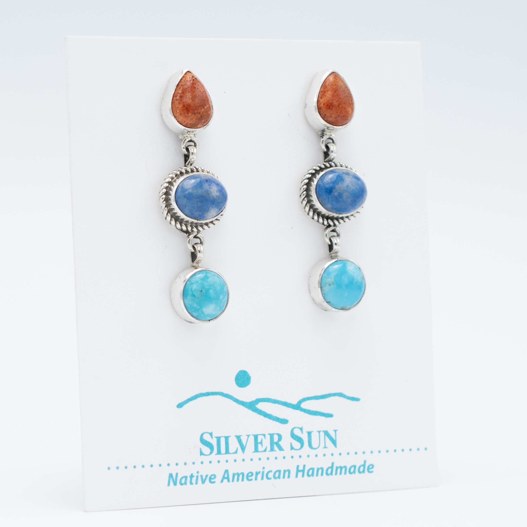 These vibrant Mixed Gemstone Drop Stud Earrings, crafted by Navajo artisan Ruth Ann Begay, feature a trio of colorful stones set in sterling silver. Each earring starts with a teardrop of warm apple coral, followed by an oval denim lapis framed in an elegant twisted silver rope, and finishes with a round Kingman turquoise, showcasing its stunning sky-blue hue. The combination of coral’s warmth, lapis’s deep blue, and turquoise’s bright pop creates a beautiful balance of color and texture. Perfect for adding a touch of Southwestern elegance, these earrings bring a playful yet sophisticated touch to any look.
