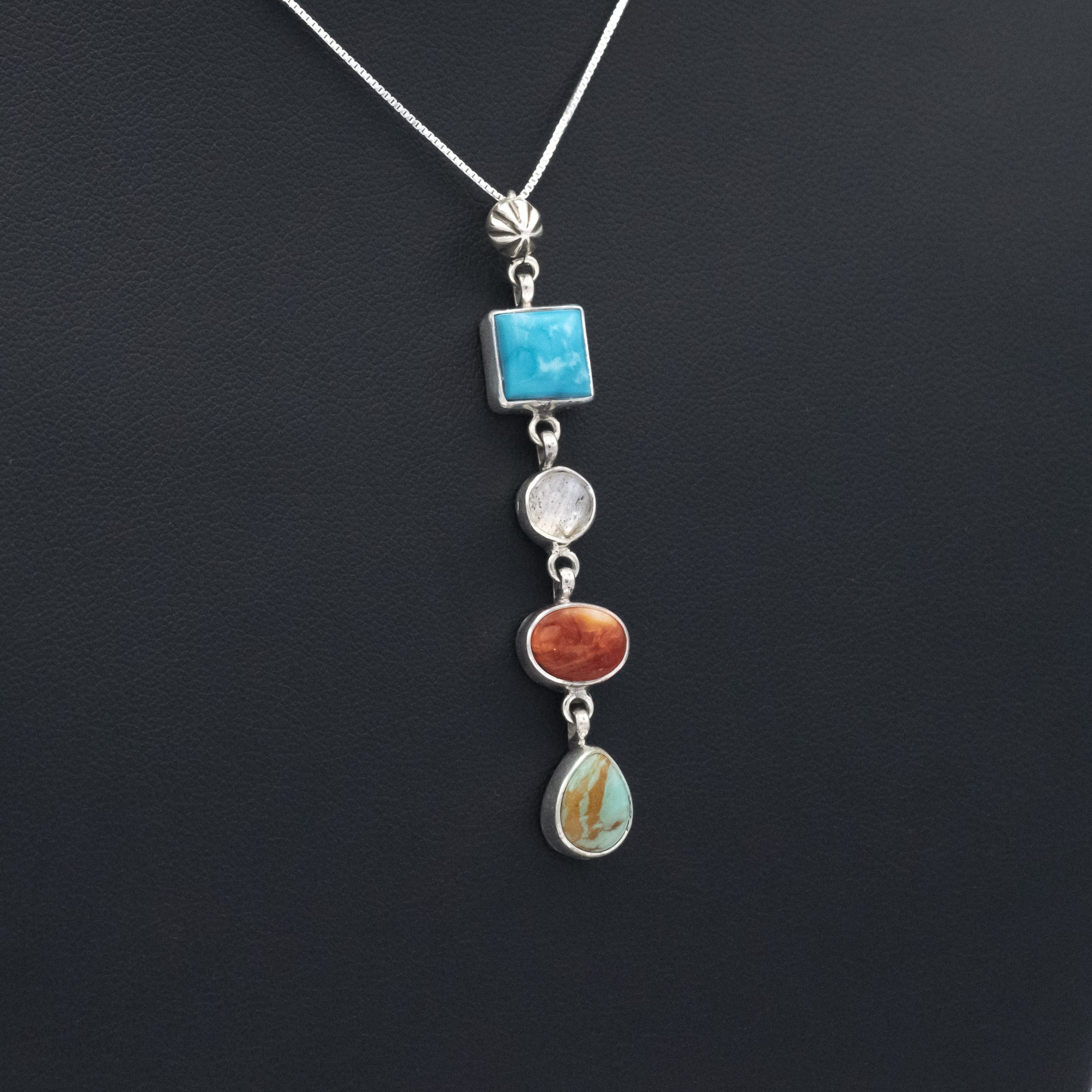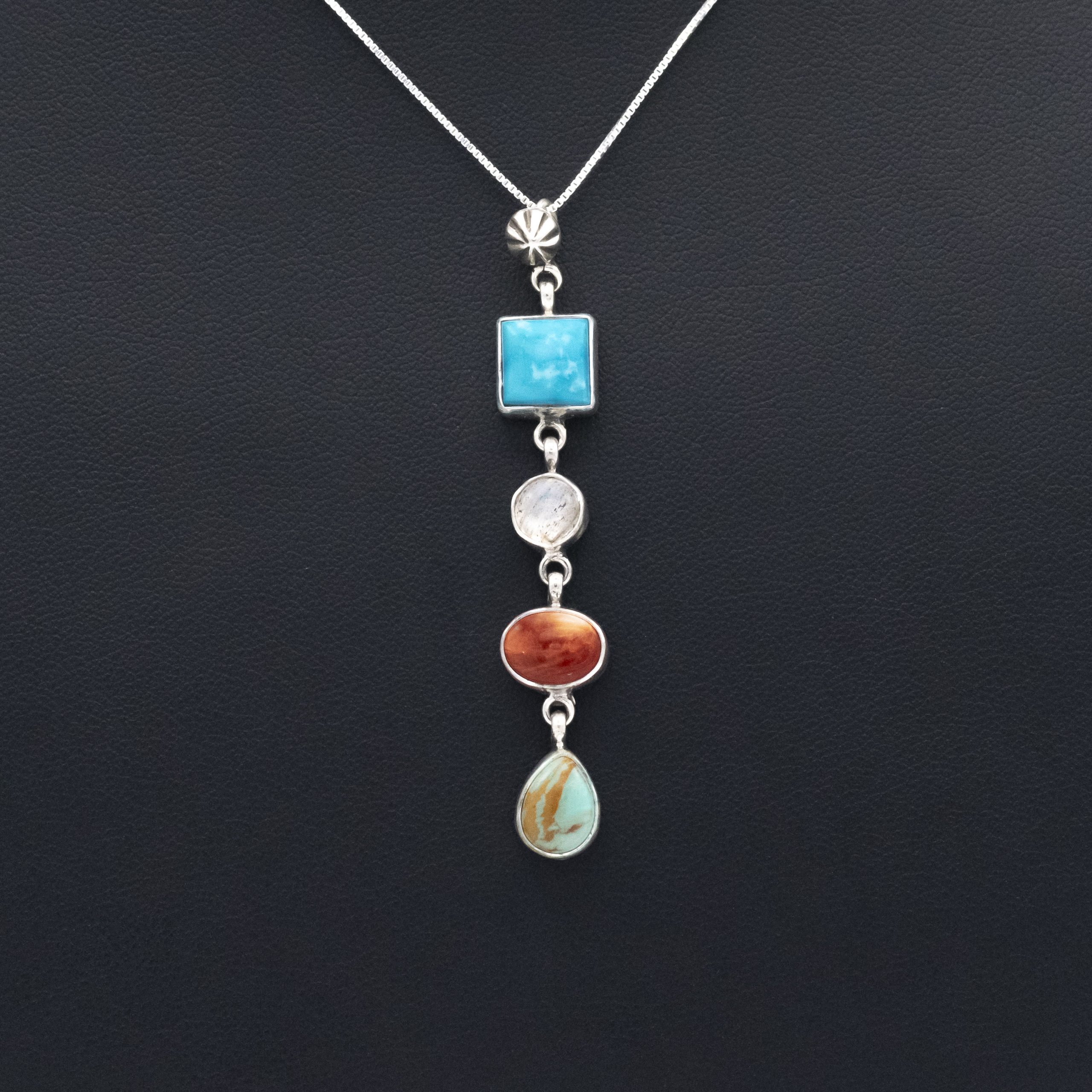 This mixed pendant by Ruth Ann Begay, Navajo, has a bit of everything! Two stones of Stabilized Kingman Turquoise, Spiny Oyster Shell and Moonstone.