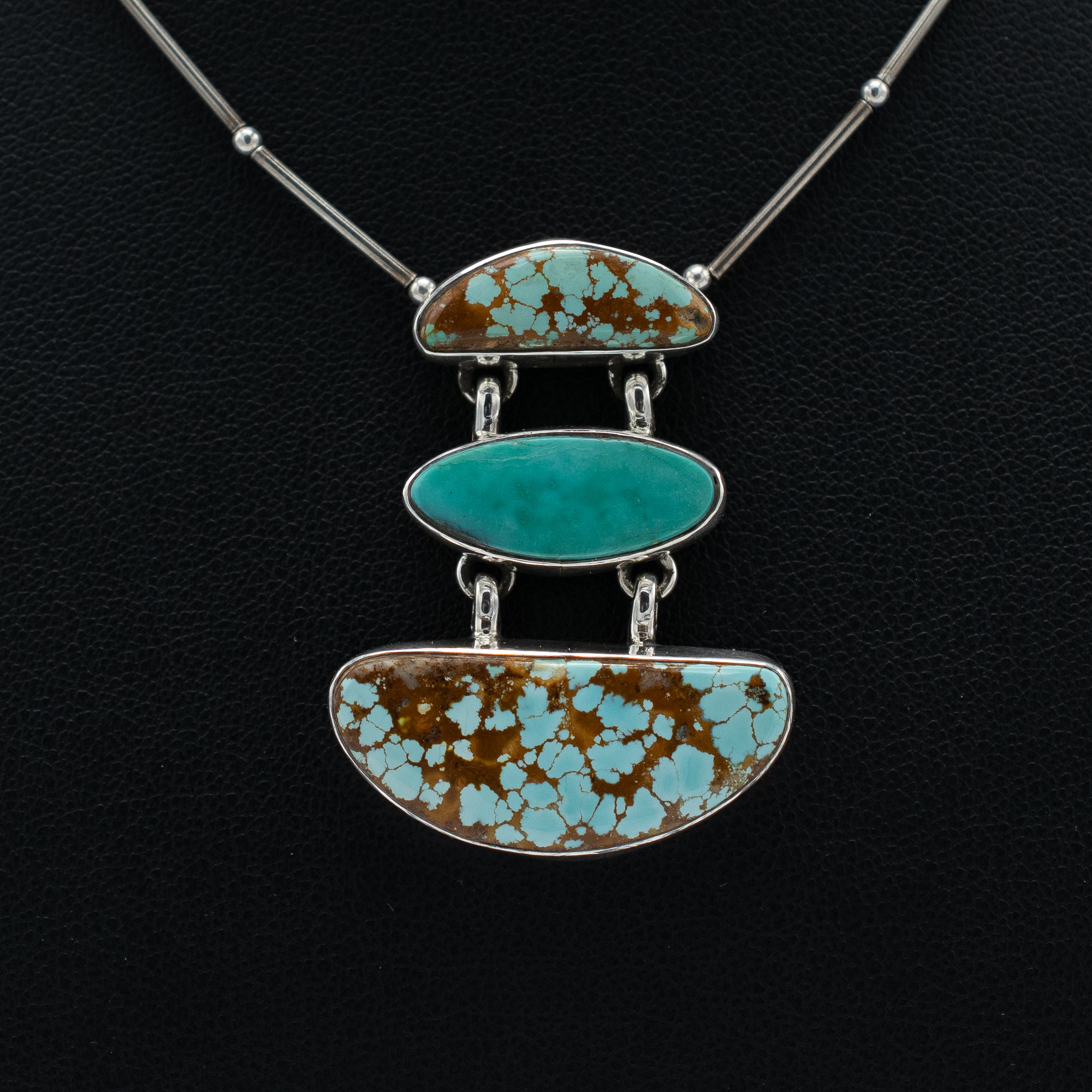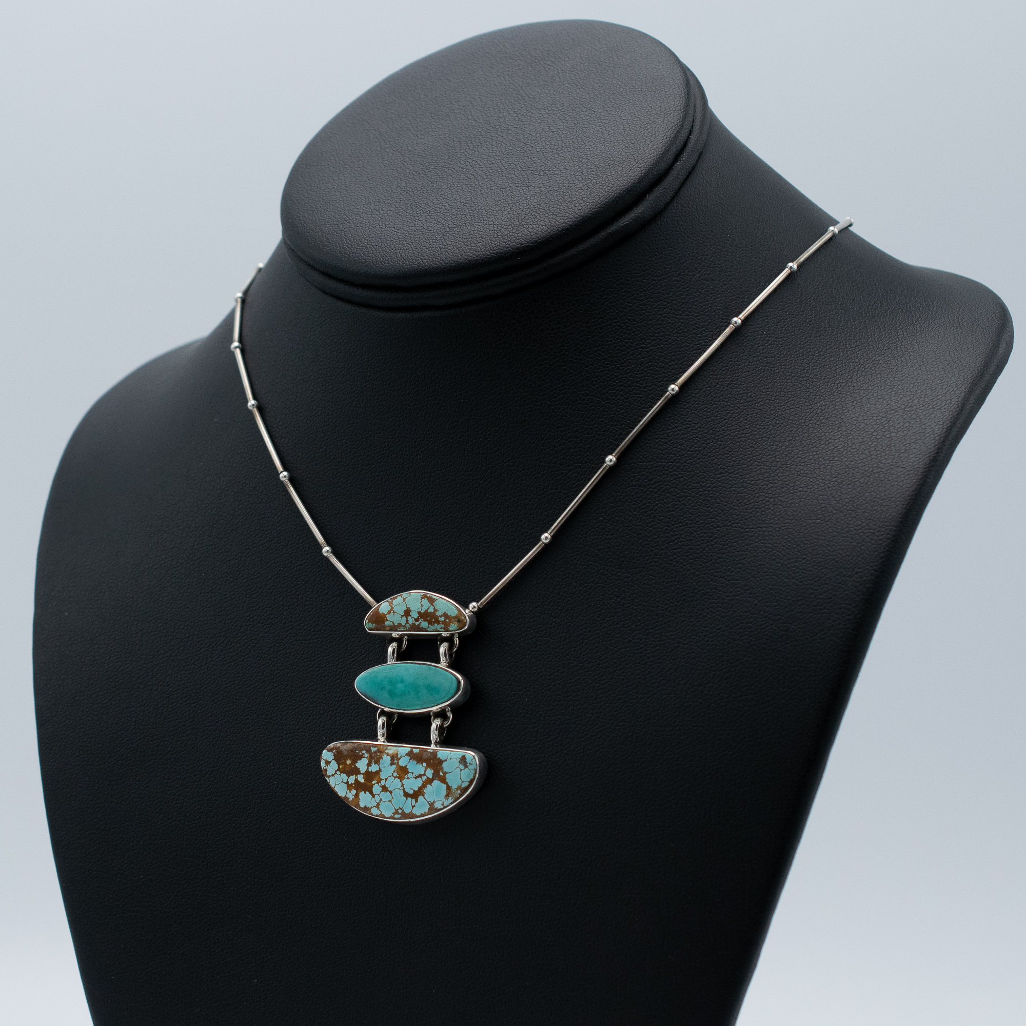 Bryant Martinez paired natural Cerrillos and High Lonesome turquoise into this drop pendant necklace, two New Mexico sources with their own distinct personalities. Cerrillos runs toward blue-green with heavy matrix; High Lonesome, in the middle, tends to be brighter and cleaner. Together they make something more interesting than either alone.