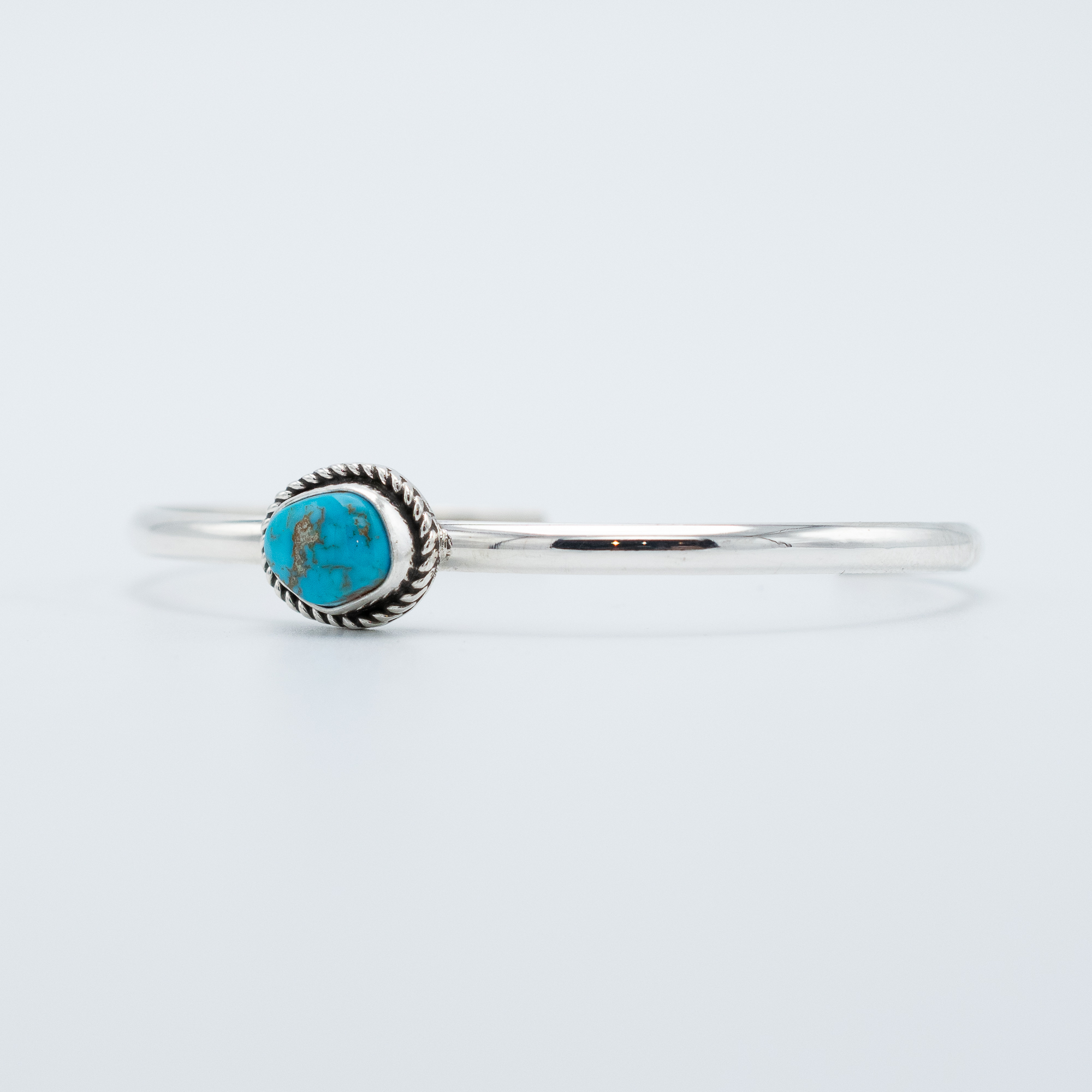This bracelet features a natural Morenci turquoise stone with bright blue color and areas of golden matrix that highlight the character of this Arizona turquoise. The small oval cabochon is set in sterling silver and framed with a twisted rope border, keeping the design simple and balanced. Handmade by Navajo artist Bryant Martinez, the slender cuff creates a clean profile that sits comfortably on the wrist. Its understated scale makes it easy to wear alone or layered with other silver bracelets.